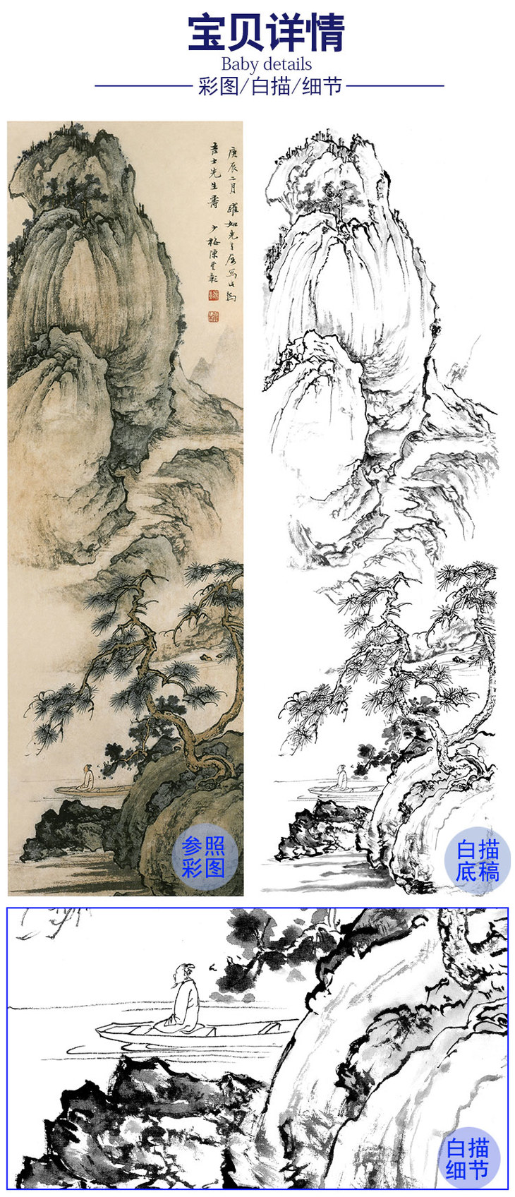 陈少梅竖幅工笔山水人物白描底稿-《泊州远眺》-多种白描尺寸可选-CR52