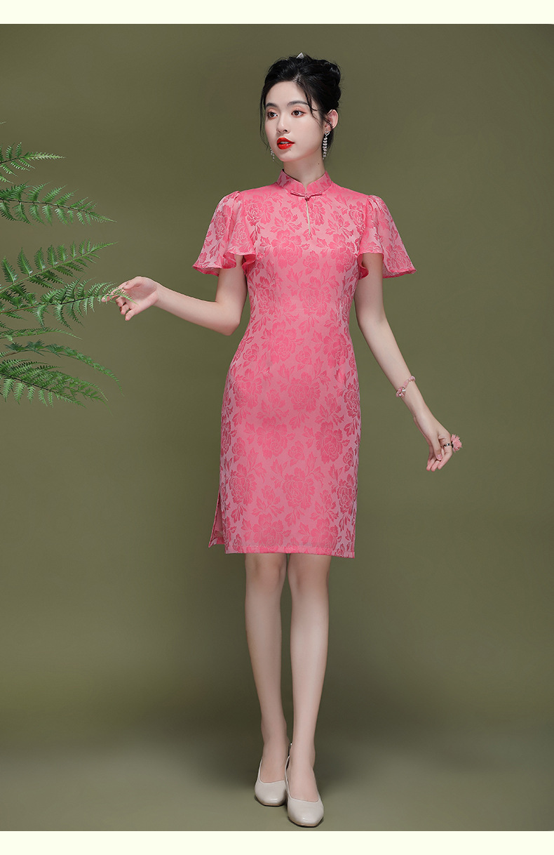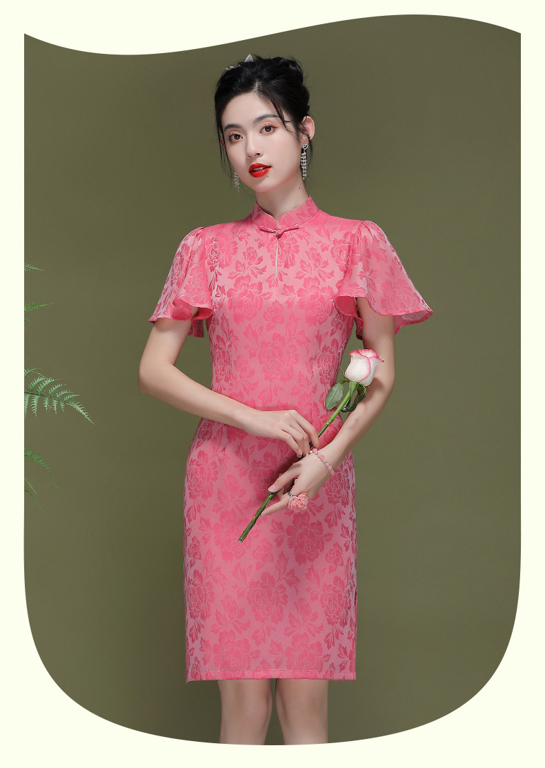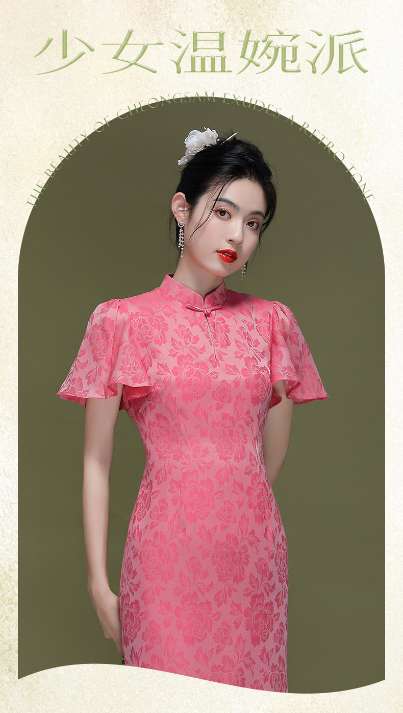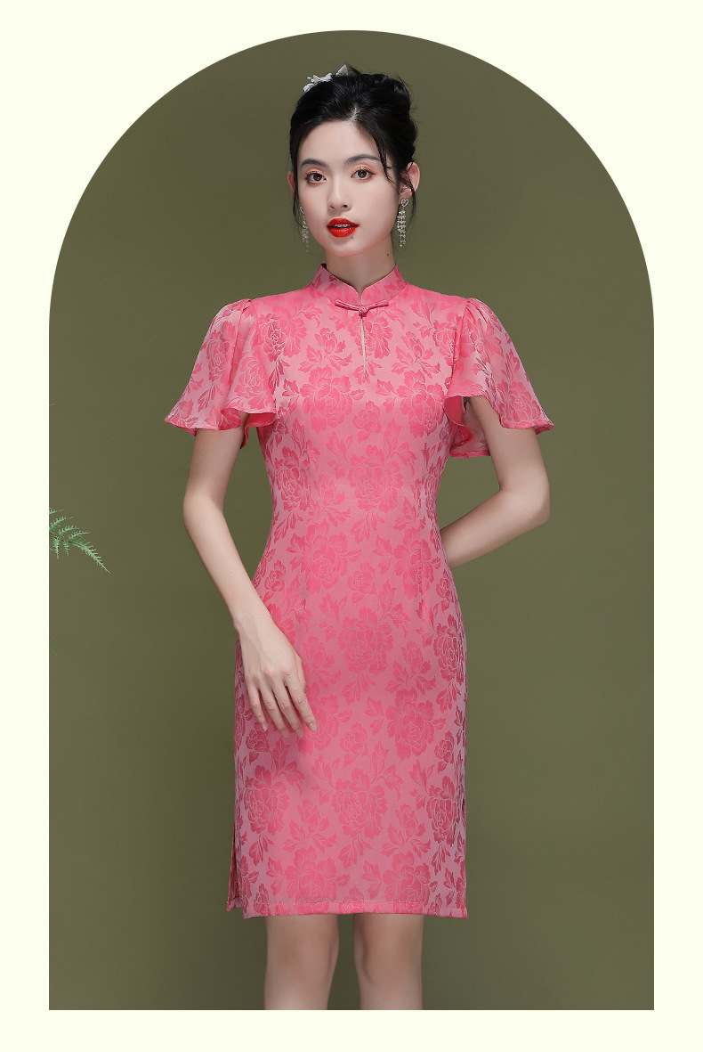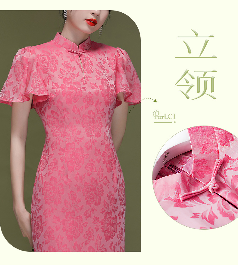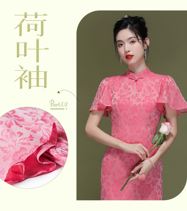 OY-230183夏季新款优雅提花桑波缎荷叶袖年轻改良款旗袍连衣裙230183