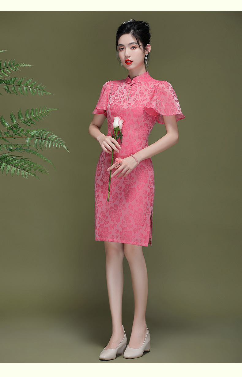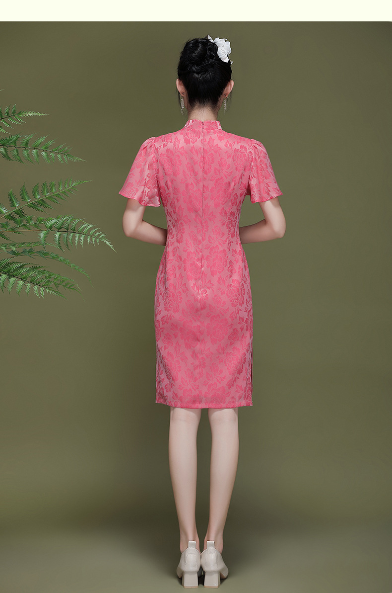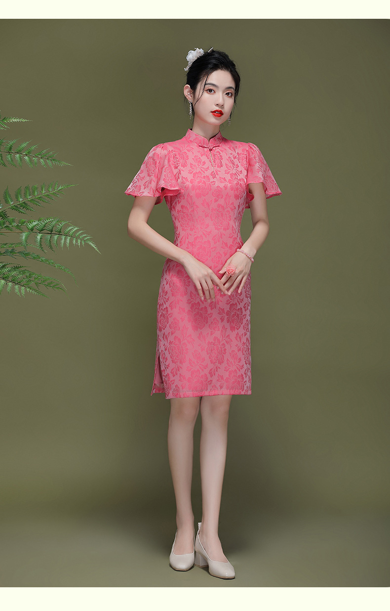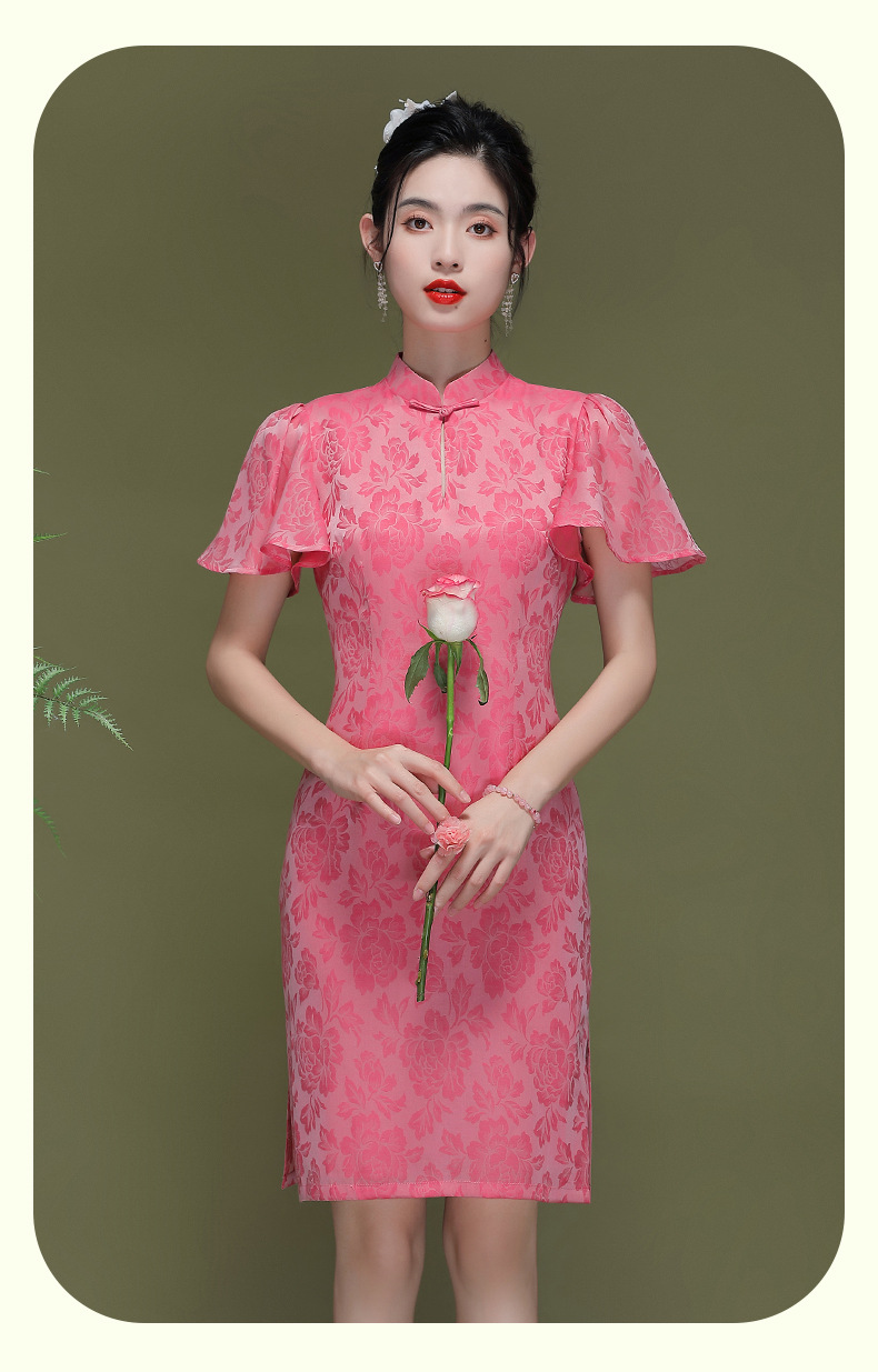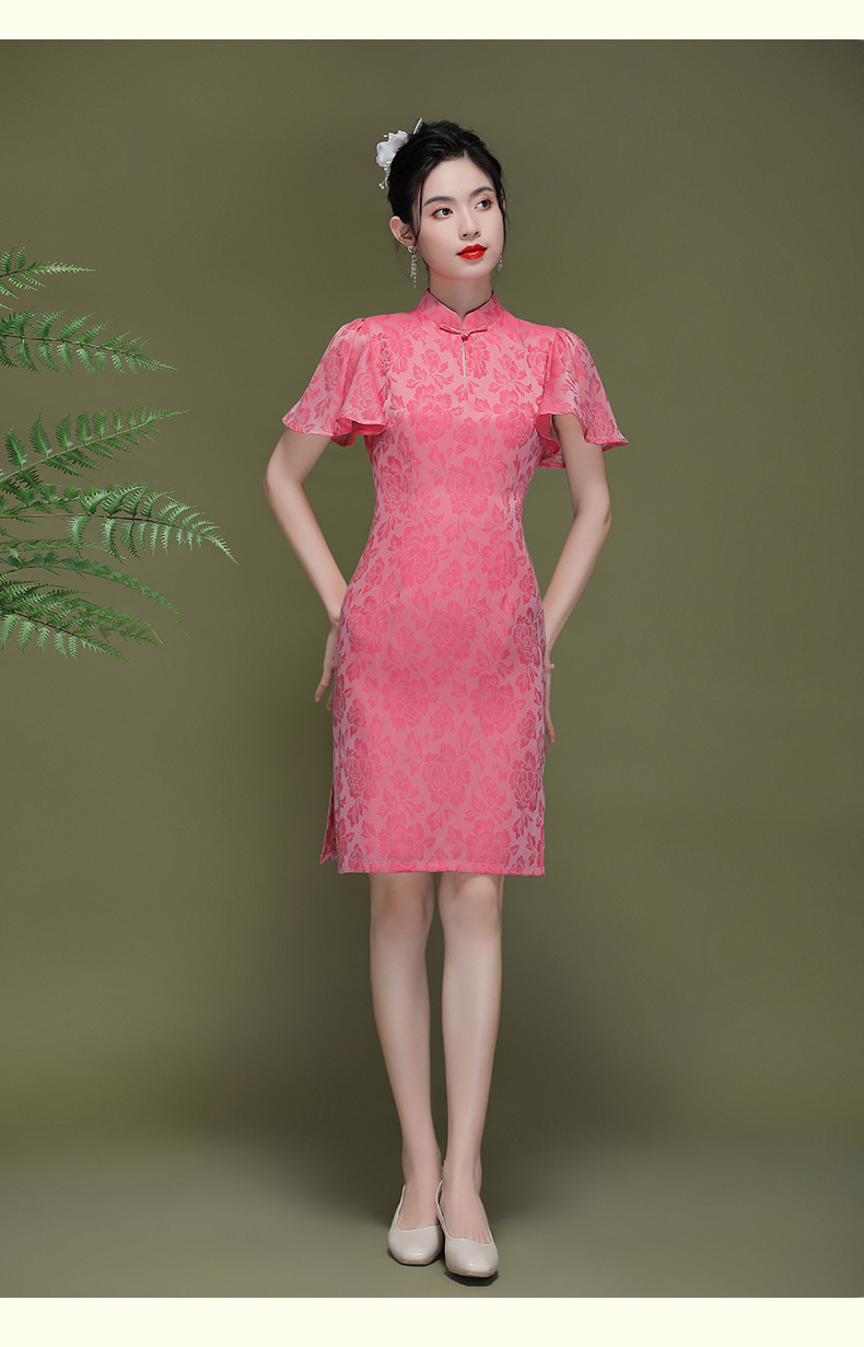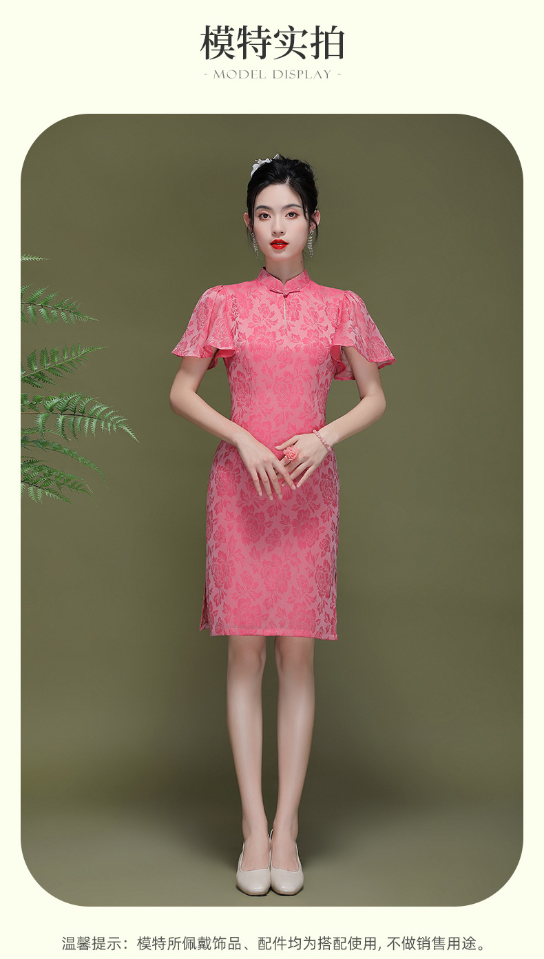 OY-230183夏季新款优雅提花桑波缎荷叶袖年轻改良款旗袍连衣裙230183