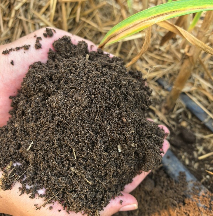 大蒜用的肥料主要是羊粪堆肥和腐熟的自家猪粪,羊粪来自草原牧民家散养的羊,十多个工人在每年春天的时候会有持续一个月的时间去拉粪,每年大约需要3000多立方的羊粪用于300亩土地上。拉回来的羊粪首先用筛选机把石块从羊粪中剔除掉,再用翻堆机不停地翻推粉粹,以充分发酵。