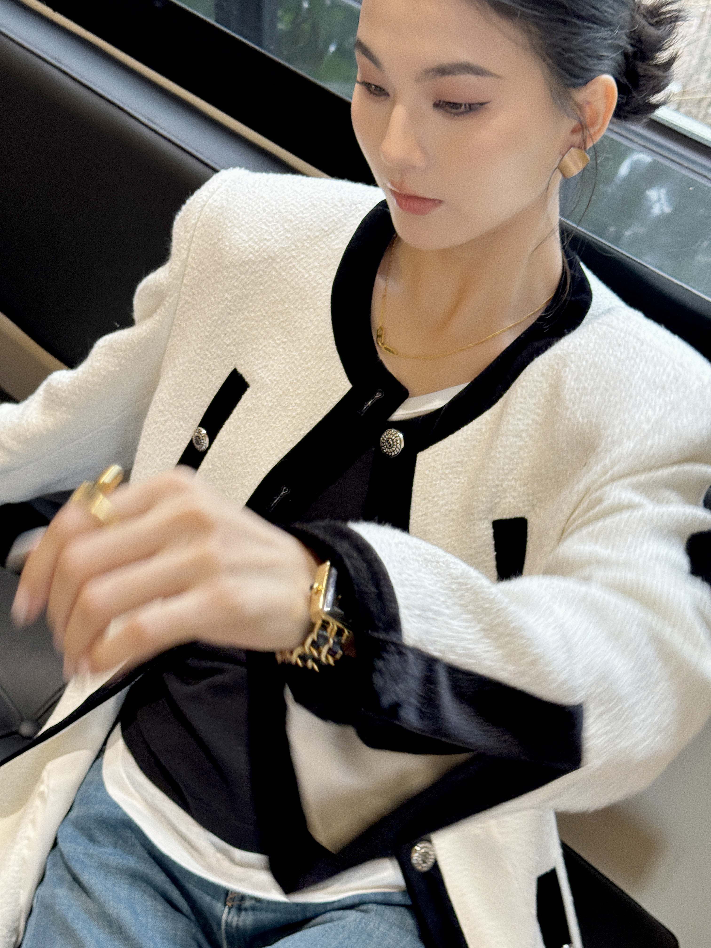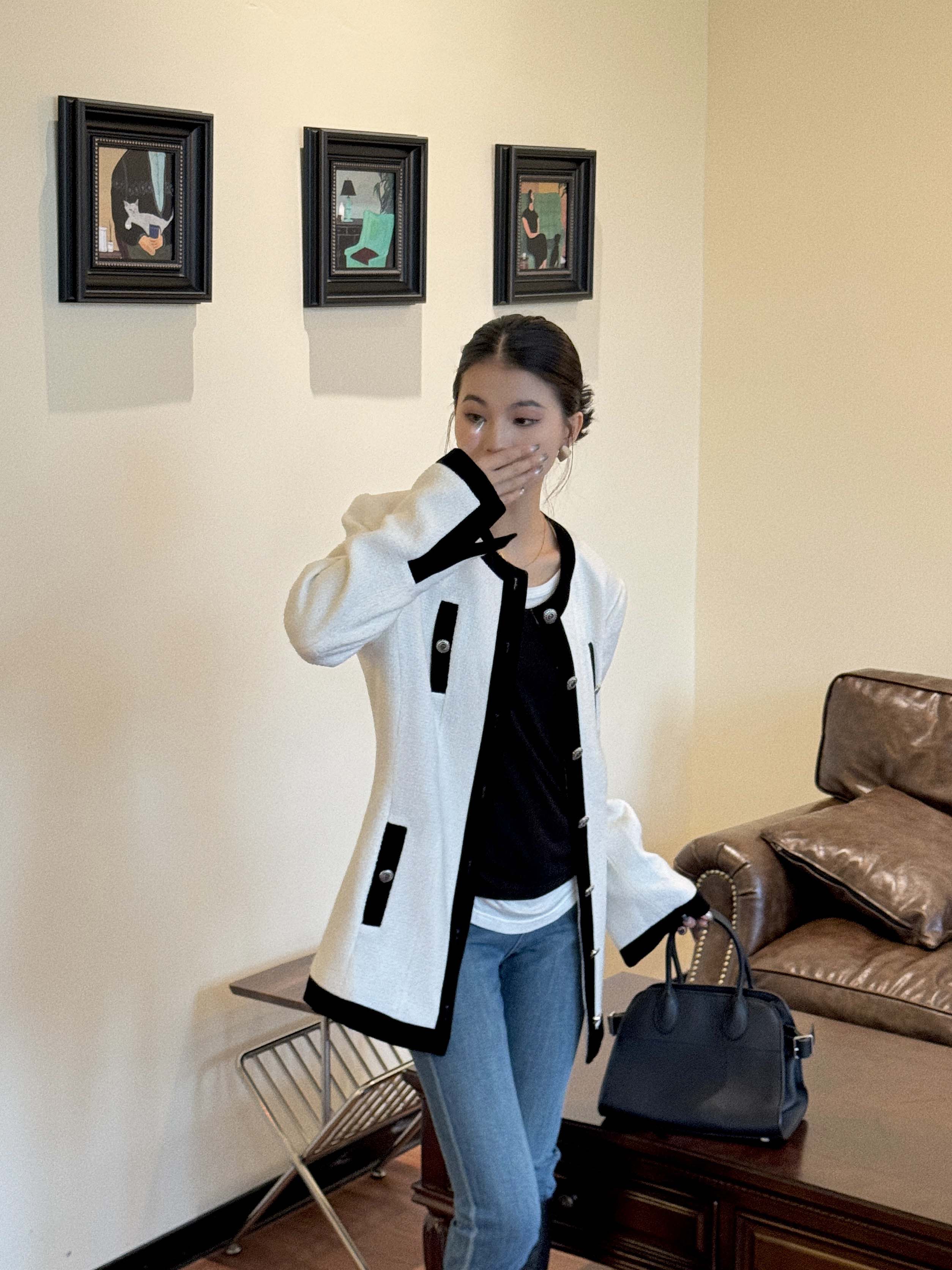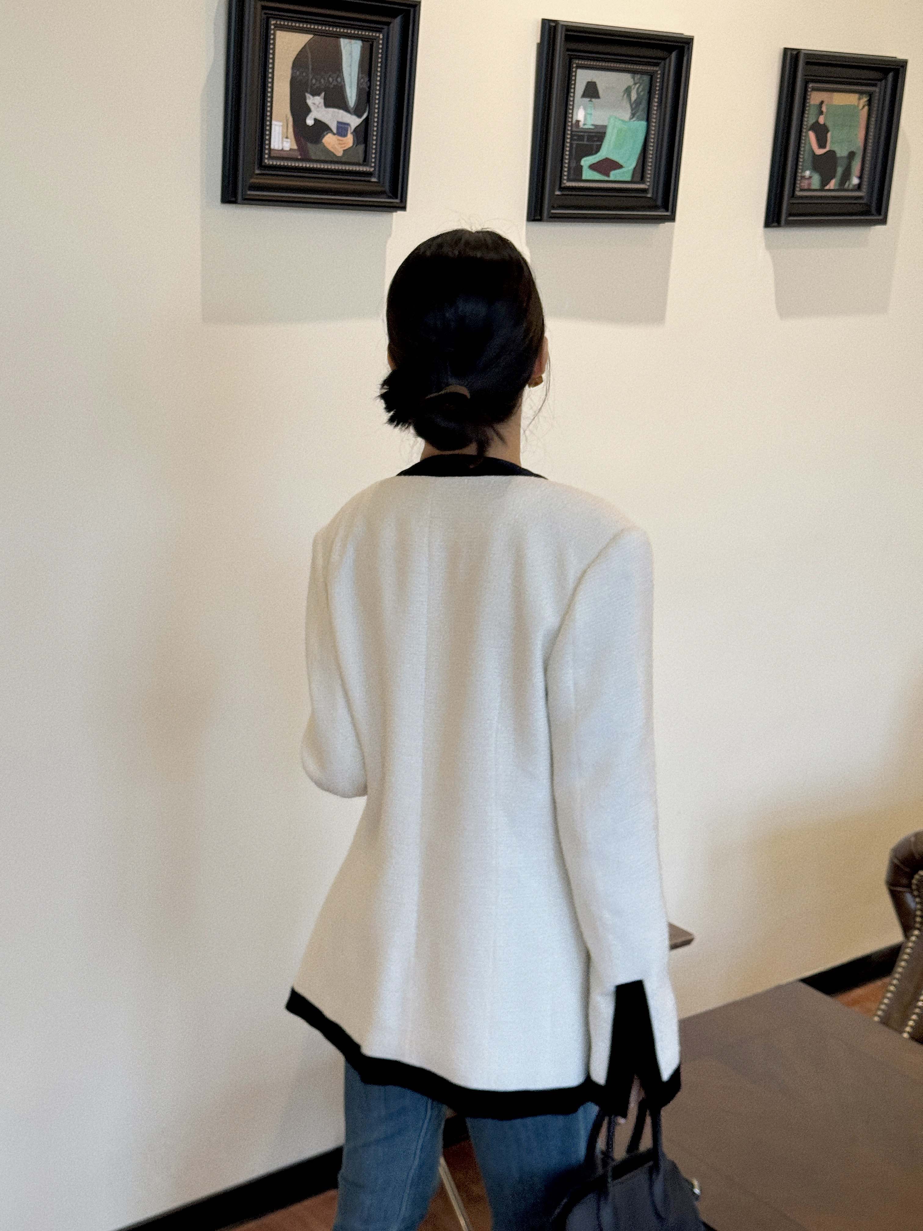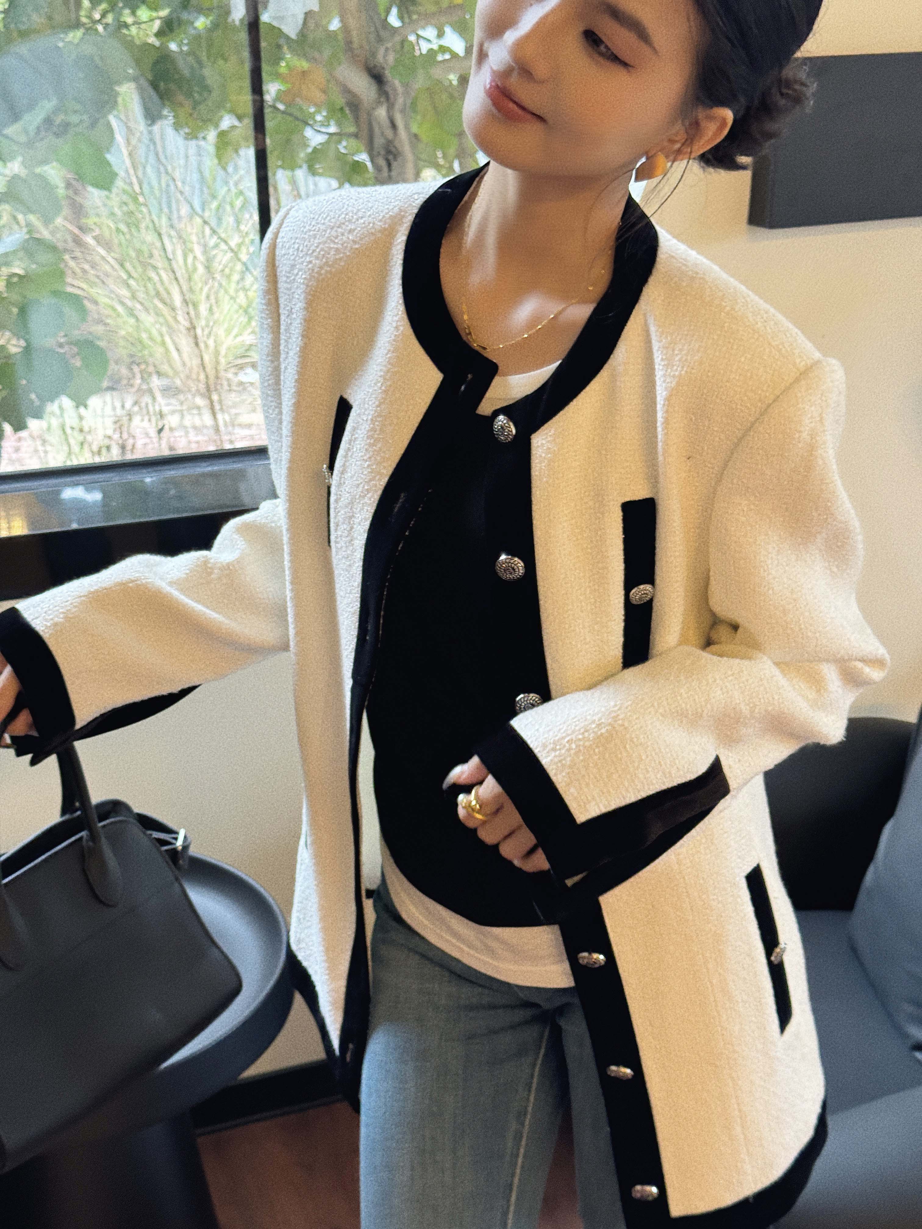 气质名媛小香风|韩系中古白撞黑边羊毛外套