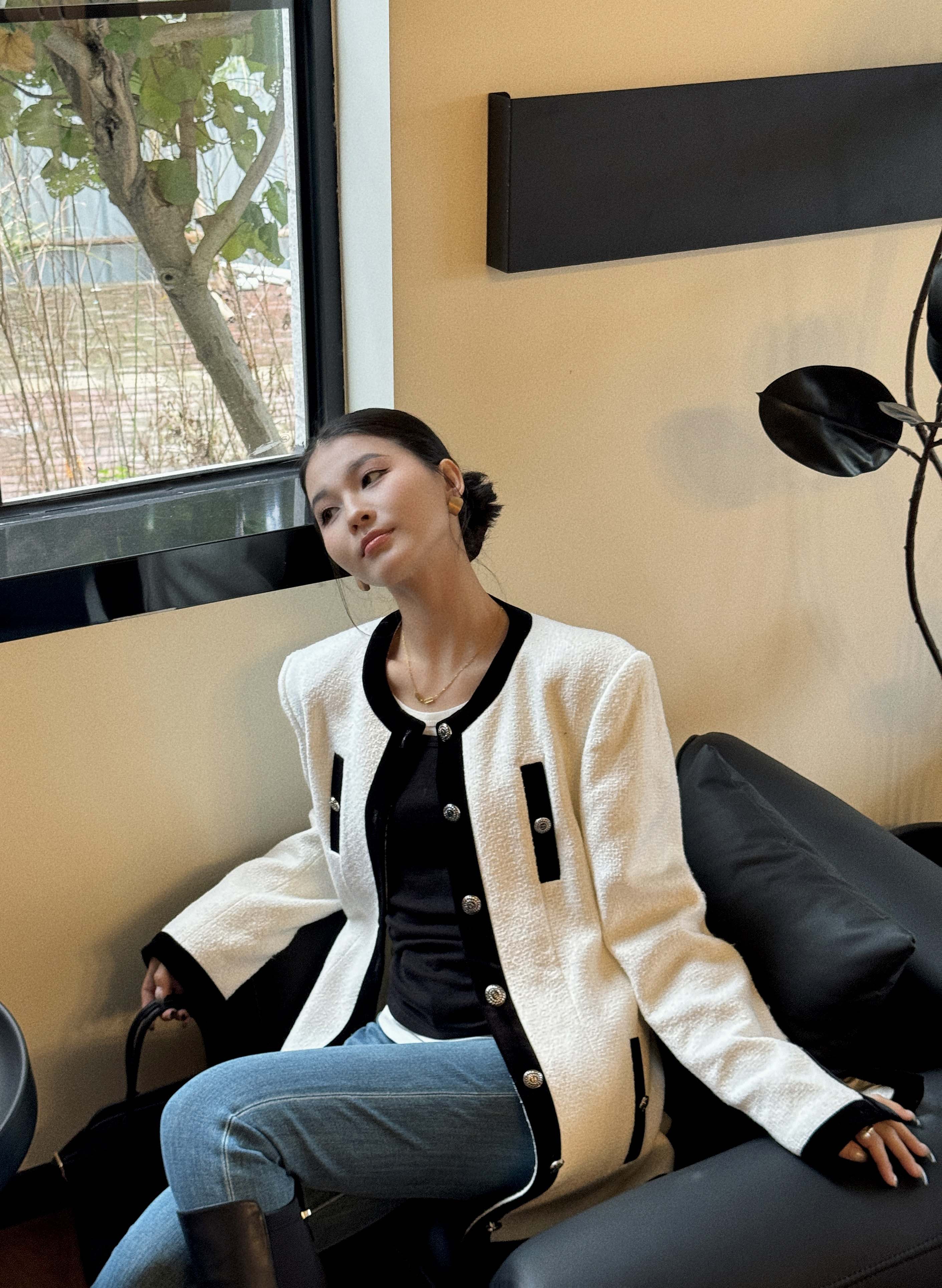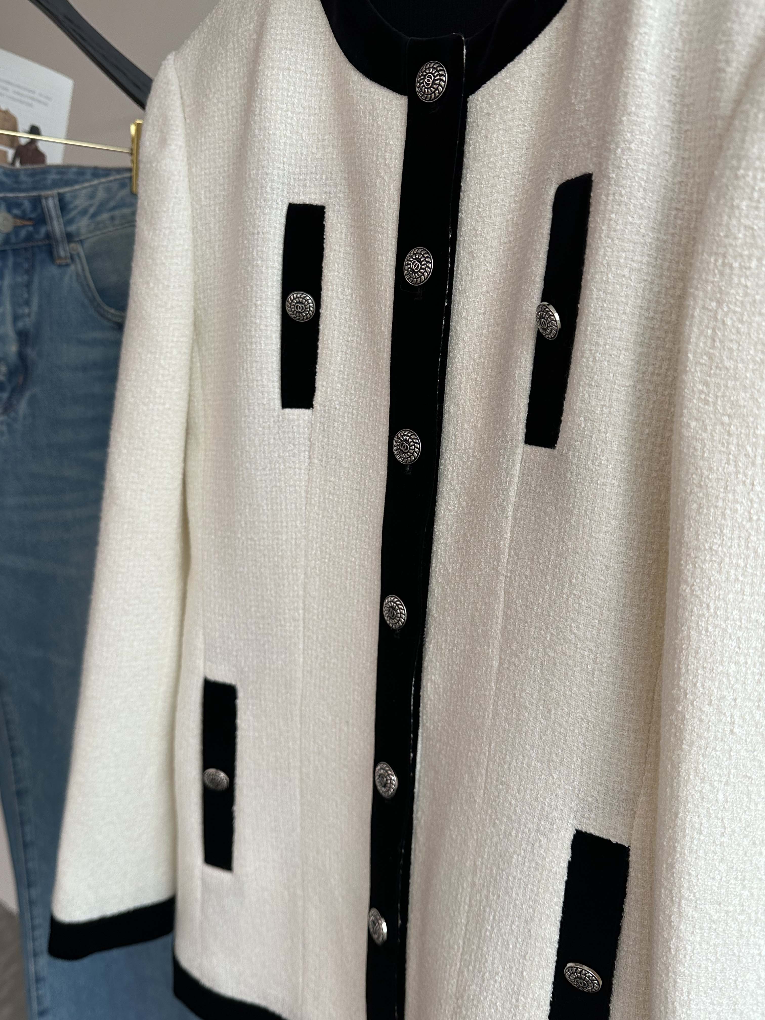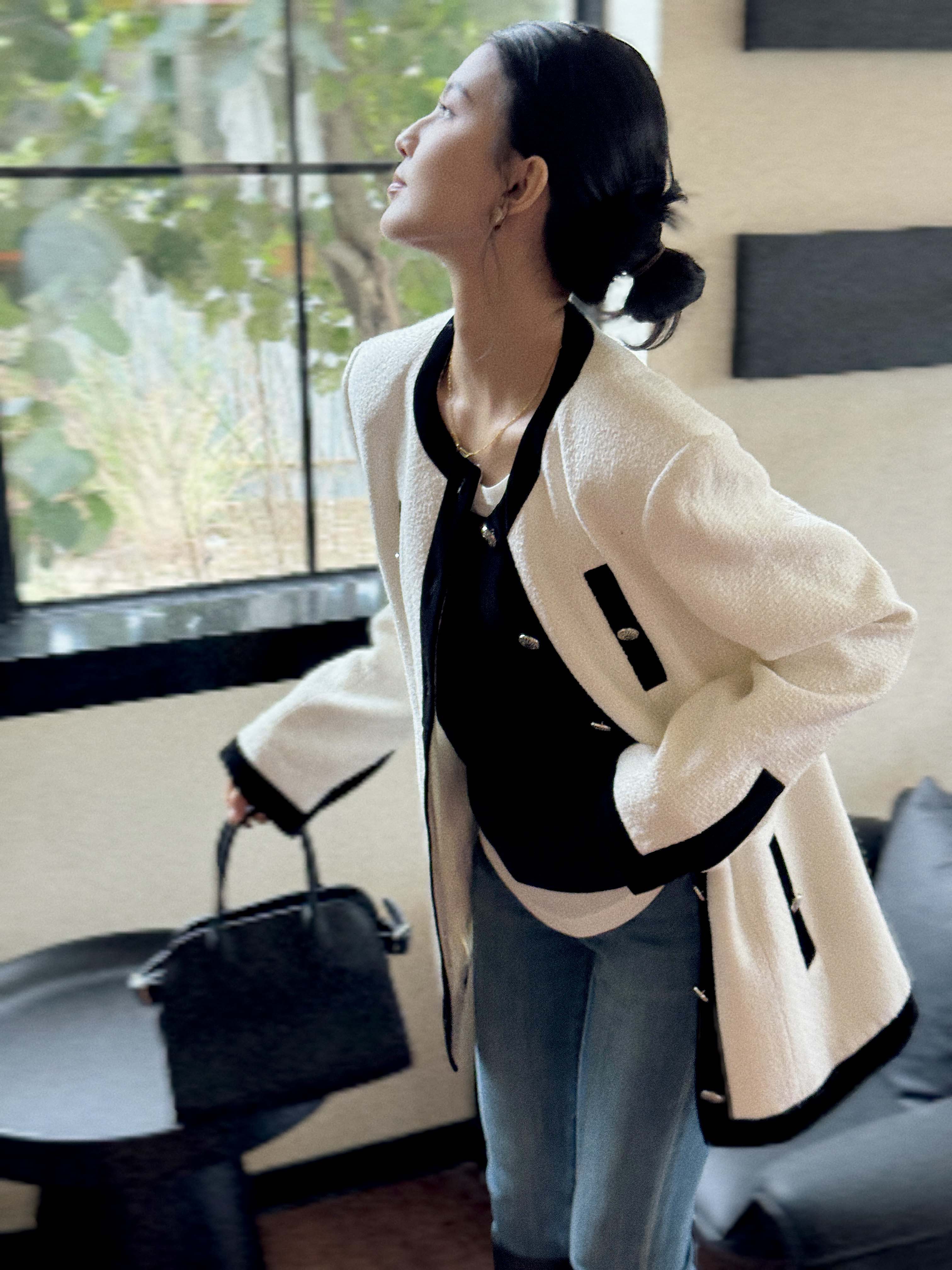 气质名媛小香风|韩系中古白撞黑边羊毛外套