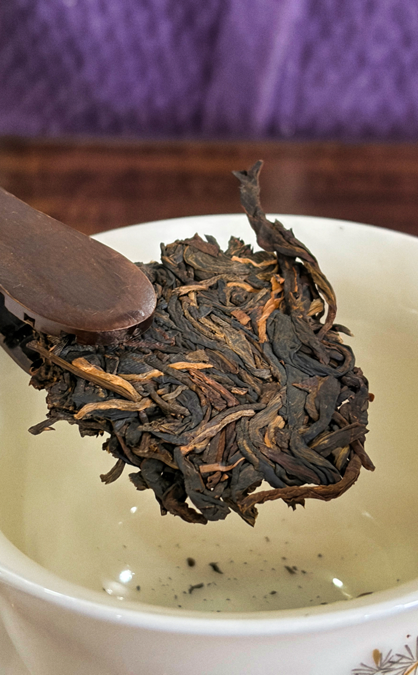 2006年压制,纯云南干仓转化,至今转化整整20年!茶饼油润红褐有光泽,干茶香呈现花蜜香,透着棉纸,香气萦绕在茶饼四周,香气浓郁迷人!