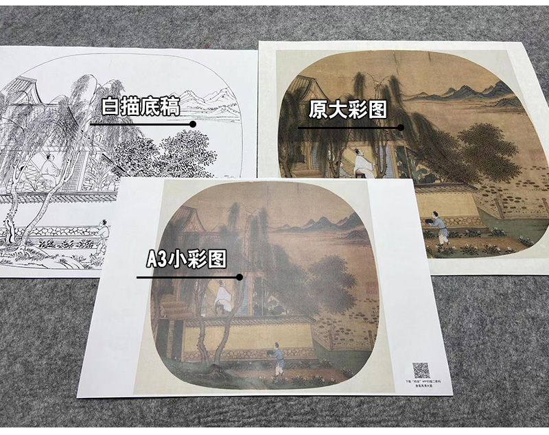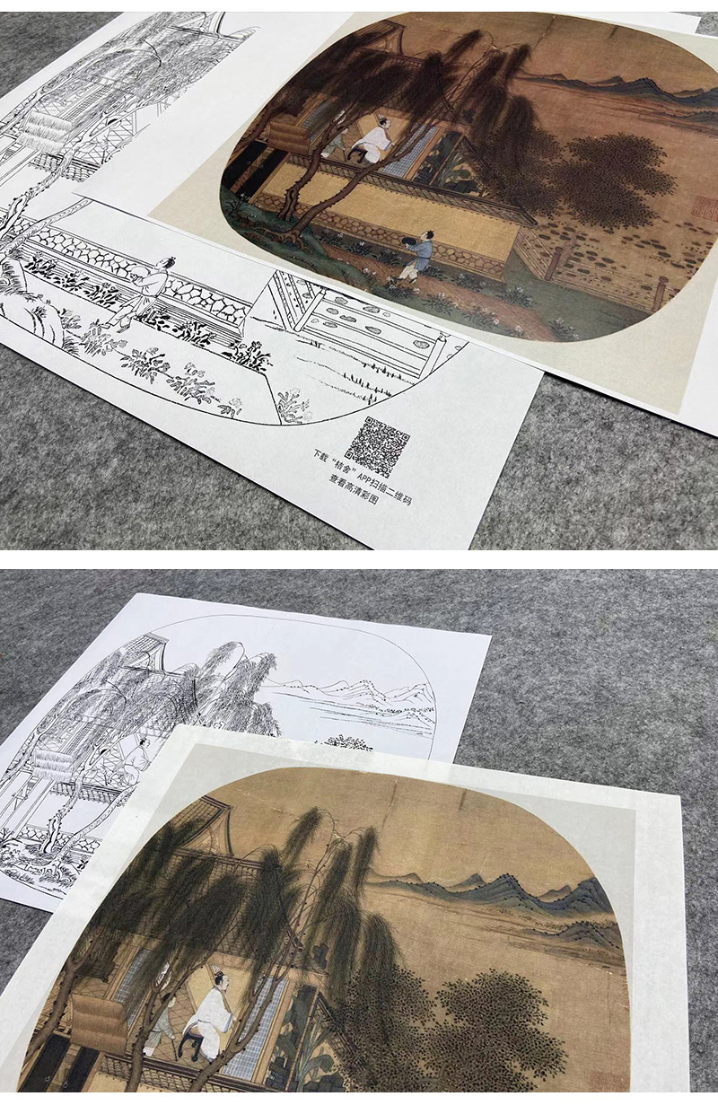 【大彩图】佚名工笔画白描底稿宋画小品《柳院消暑图》临摹勾线山水人物线稿GS27