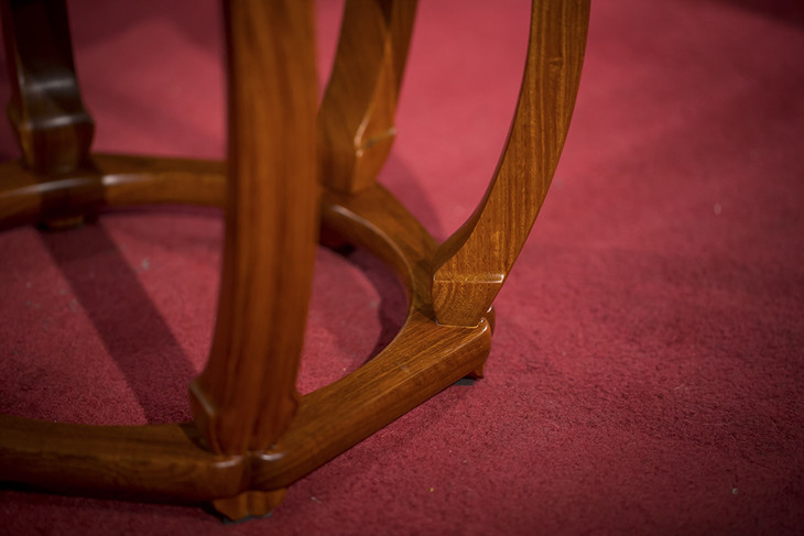 鼓腿与凳面以插肩榫相接,做上部收腿内翻,使鼓腿整体显“S”形,犹如圆凳的杨柳柔腰,给凳体增添了美感和活力,造型独特,透显无尽雅致之韵。