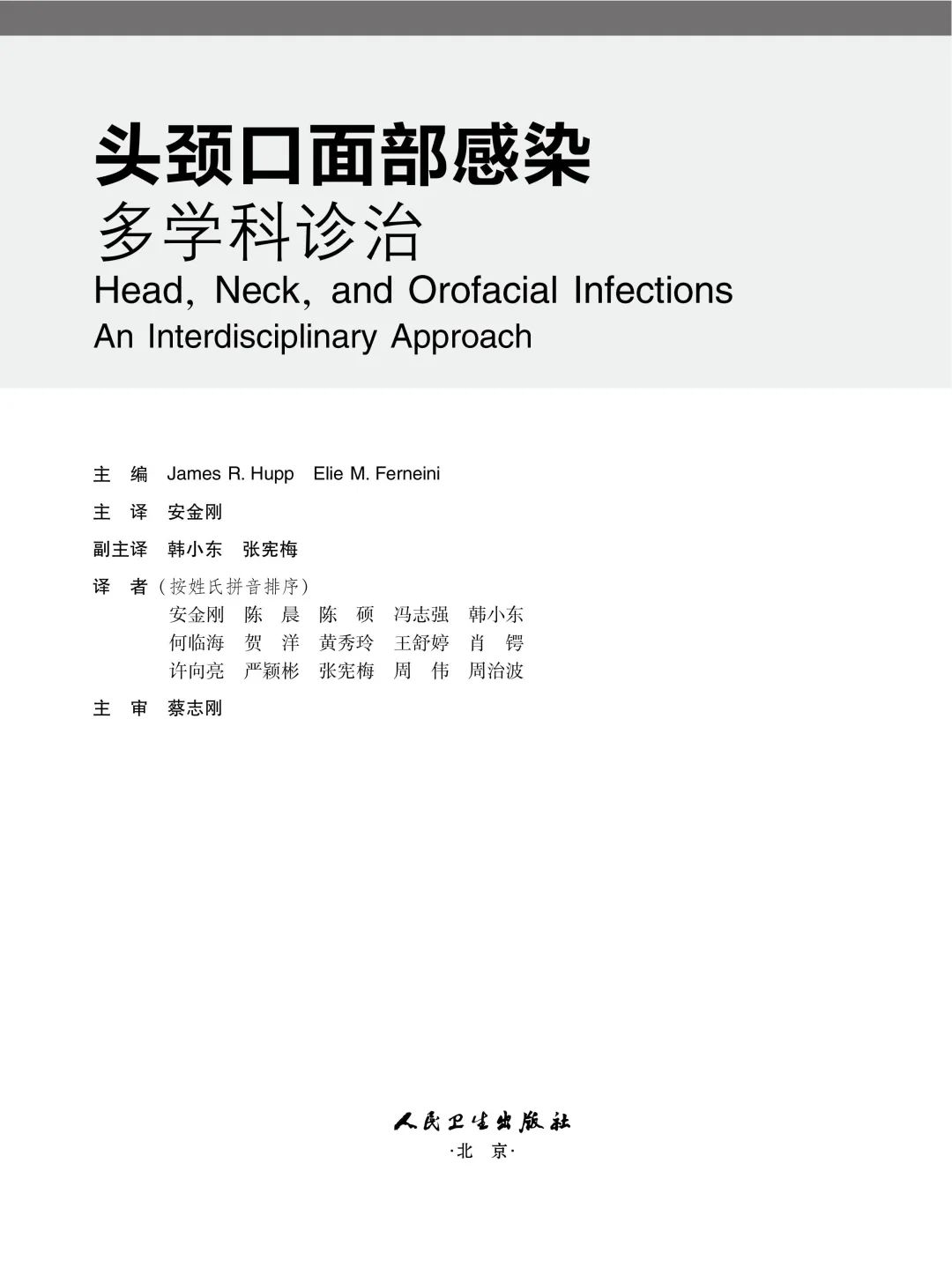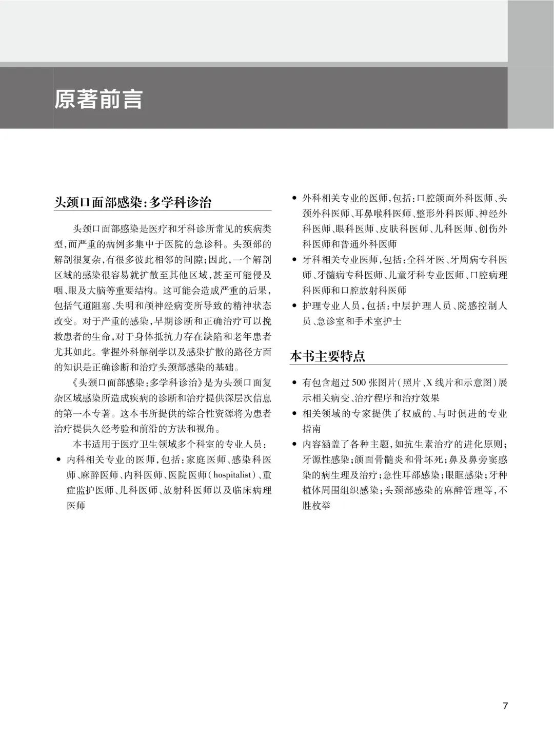 本专著将发生在这一区域的感染命名为“头颈口面部感染”(head, neck and orofacial infection),也正是由于发生在这一区域的感染性疾病除了涉及口腔颌面外科及其他口腔专业,还涉及其他多学科,主要包括头颈外科、耳鼻喉科、眼科、整形外科、神经外科等。头颈口面部感染的诊断和治疗必然会在各学科之间有所交叉,所以跨学科合作是该区域严重感染治疗的必由之路。目前,本书是头颈口面部复杂感染跨学科诊治方面的第一本专著。