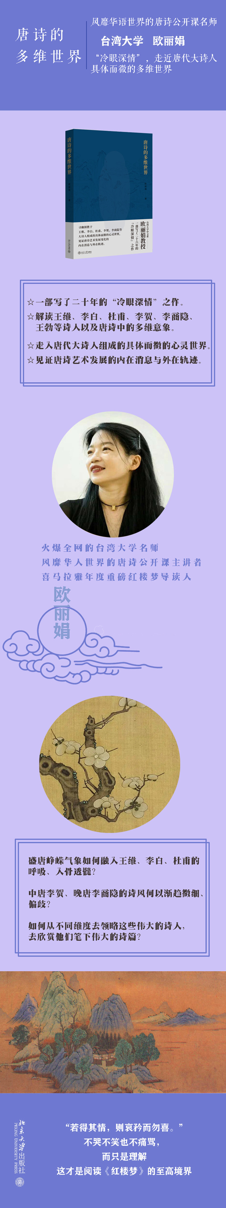 《唐诗的多维视野》收录欧丽娟历年来的学术研究代表文章,多维度解读王维、李白、杜甫、李贺、李商隐、王勃等诗人以及唐诗中的关键意象,寻幽探胜于唐代大诗人组成的具体而微的心灵世界,见证唐诗艺术发展变化的内在消息与外在轨迹。