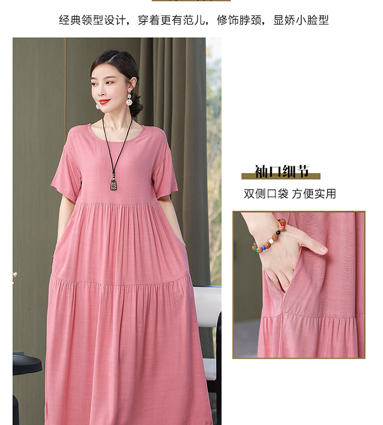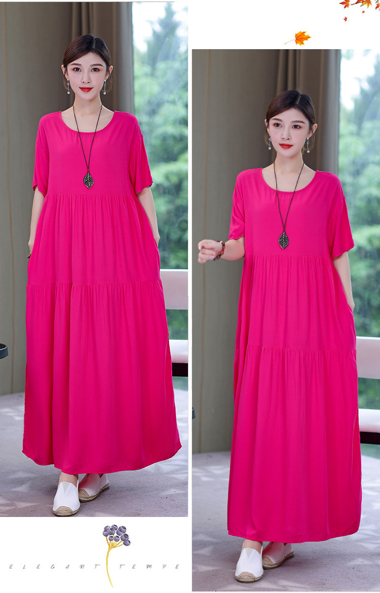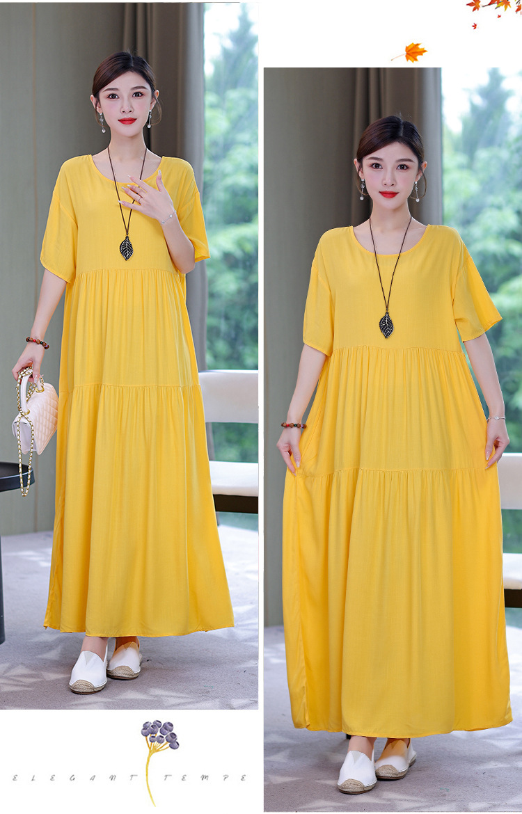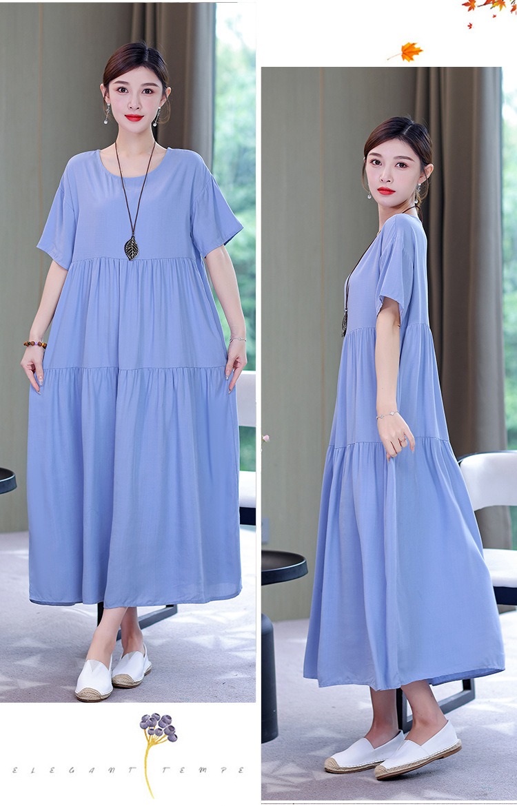 HS-01棉绸连衣裙女夏天大码气质宽松胖妈妈遮肚显瘦纯色休闲棉麻长裙子