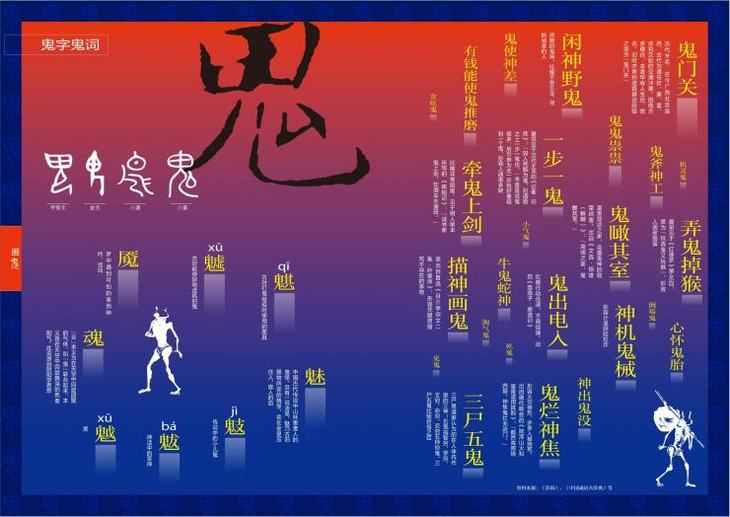 关于“鬼”,古人的解释大概有七八种:其一是以为人死后精灵不灭,称之为鬼。甲骨文的“鬼”字是人形上面顶着个大脑袋(也有人说是一张可怕的面具)。篆文的“鬼”加入了“厶”,似代表云气。其二是万物的精怪,比如木魅山鬼。上述两种解释是鬼字的主要字义,并衍生出形容一个人阴险、狡诈、敏慧、沉溺于某种不良嗜好等寓意。除此之外,“鬼”还是二十八星宿之一的鬼宿,是《山海经·海内北经》里的鬼国,是中国人的一种姓氏。如果要表示对某个人的爱昵,也能用到这个字,比如,机灵鬼。一个“鬼”字与人竟有千丝万缕的关系,这从字词上即可见一般。
