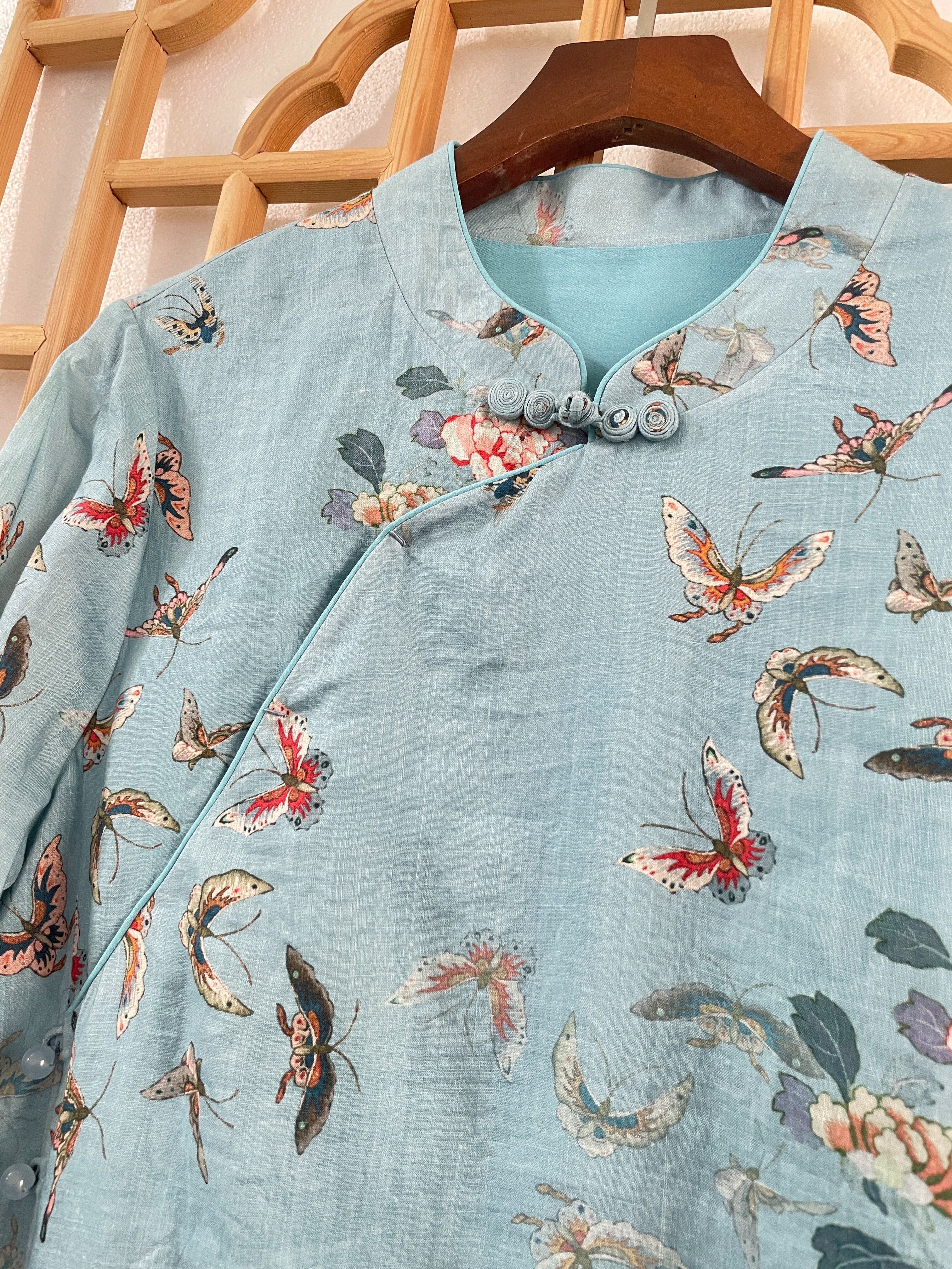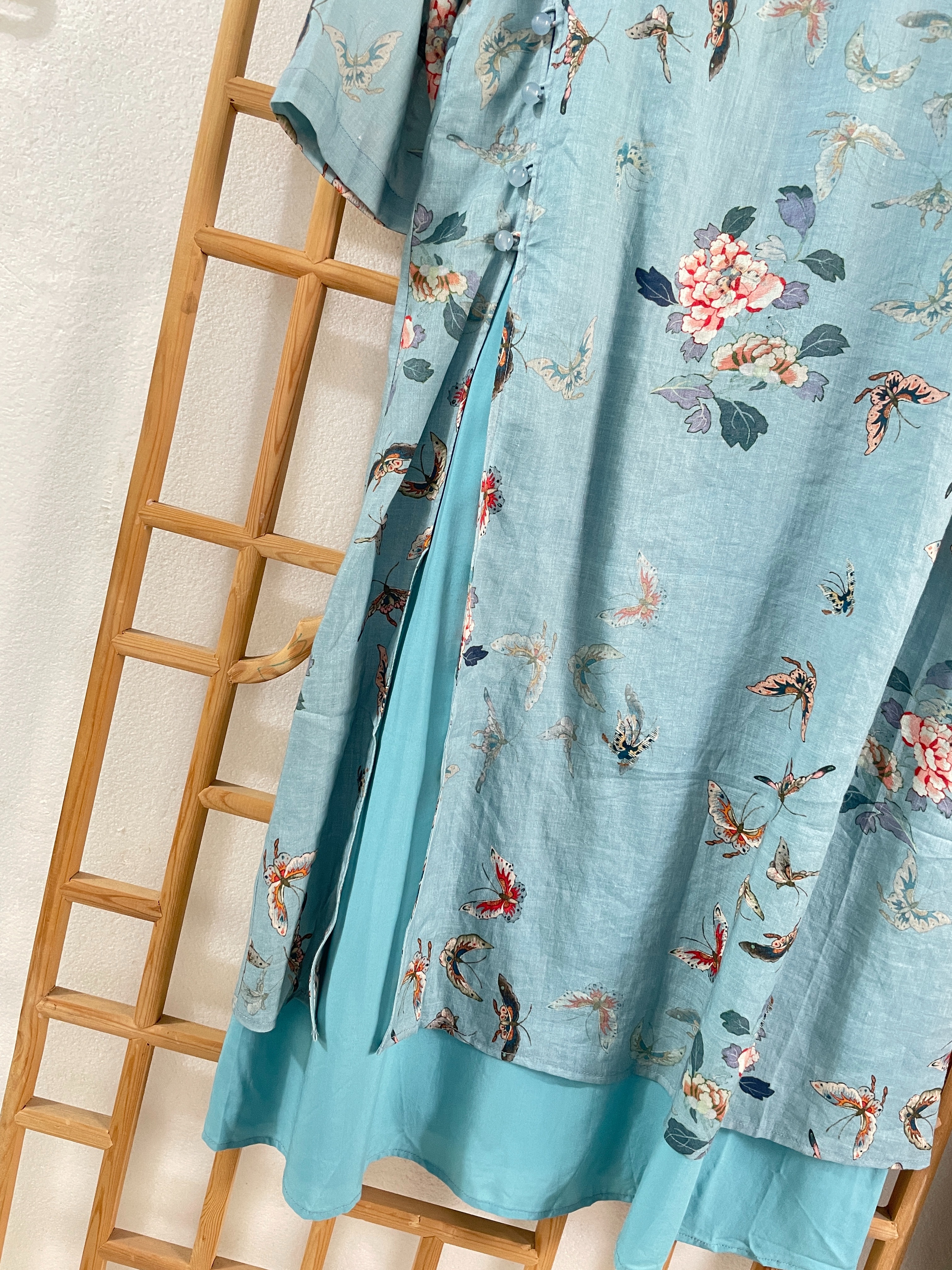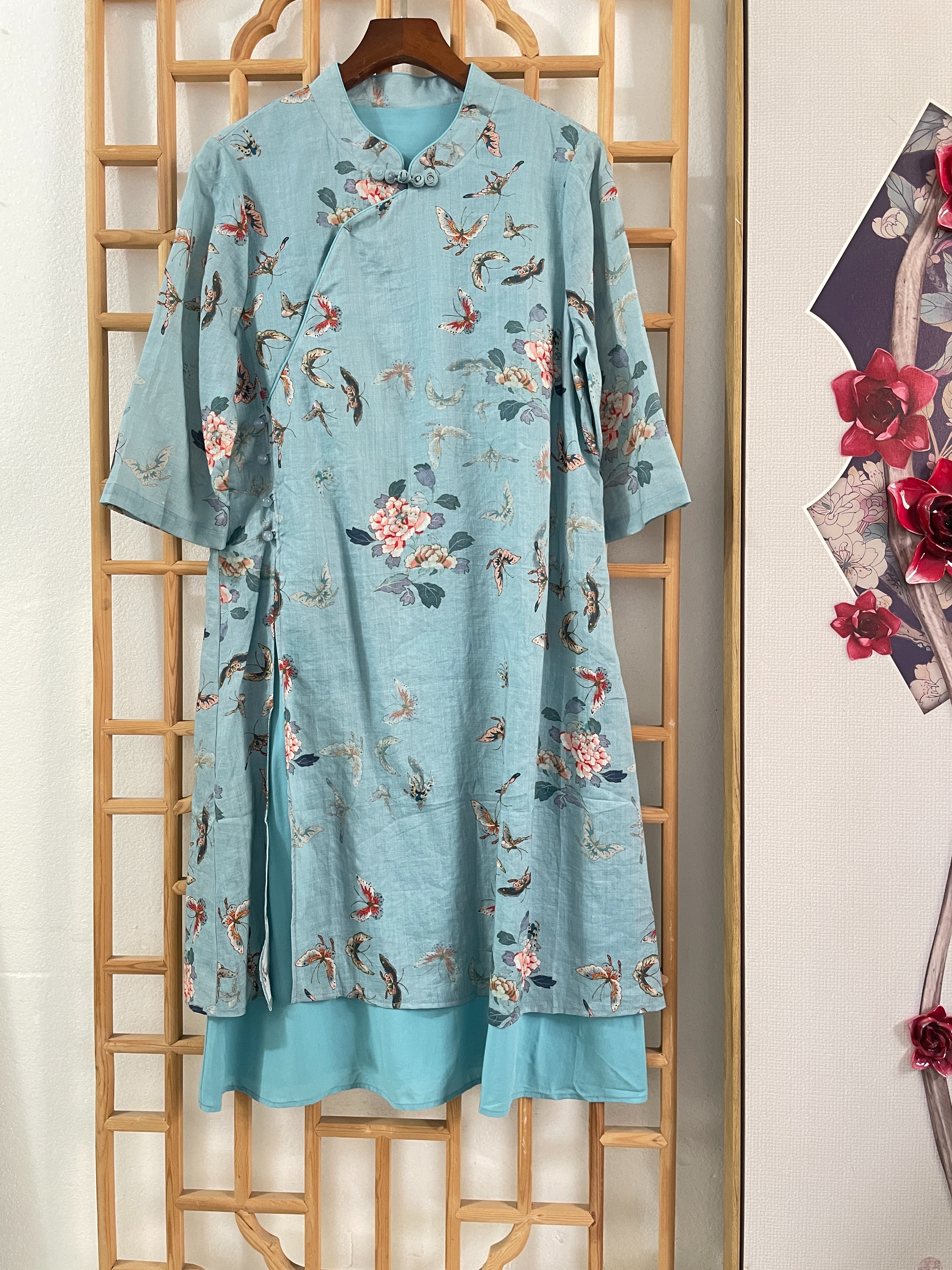 「断码清仓」精品新中式100%苎麻前开扣大开叉双层旗袍连衣裙 L码 ZFYY294