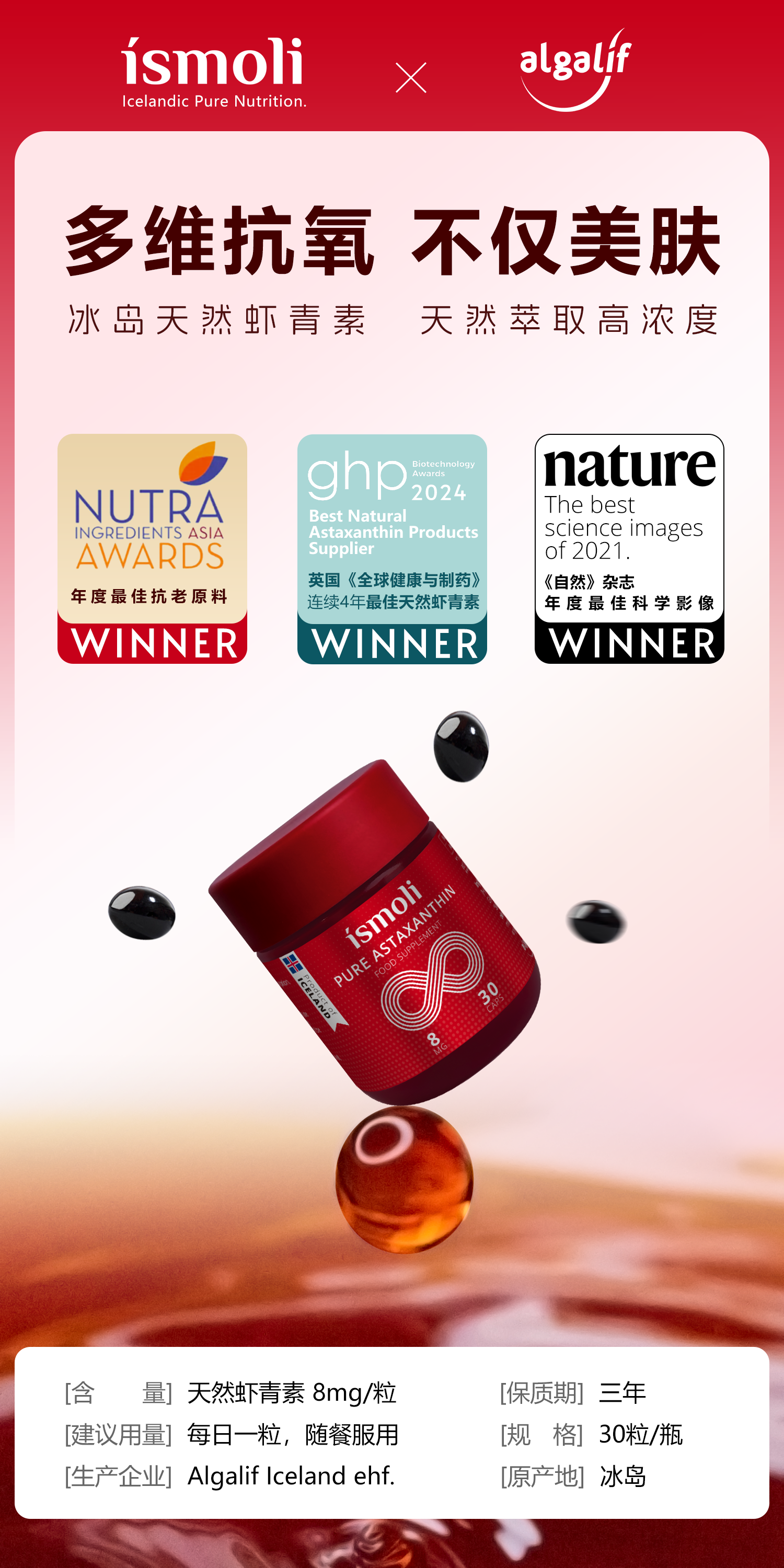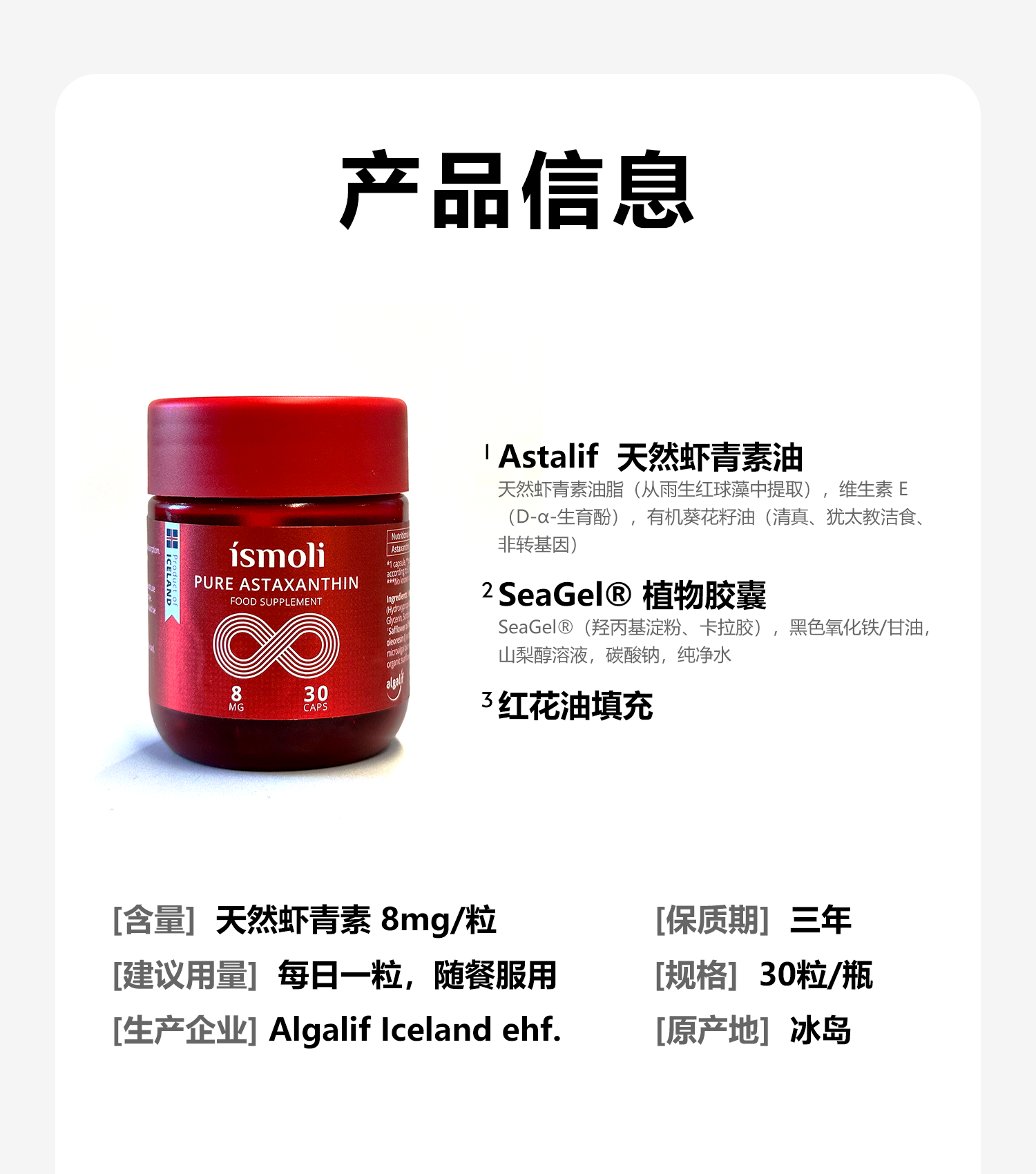 冰岛天然虾青素软胶囊 30粒/瓶/1/3/6瓶可选 Algalif ismoli 保税仓发货