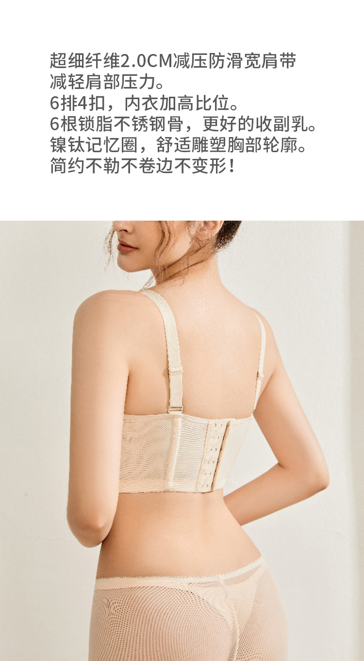 后比采用的是双层6角菱形薄网纱一字美背设计 ,双层稳定,平覆美背,