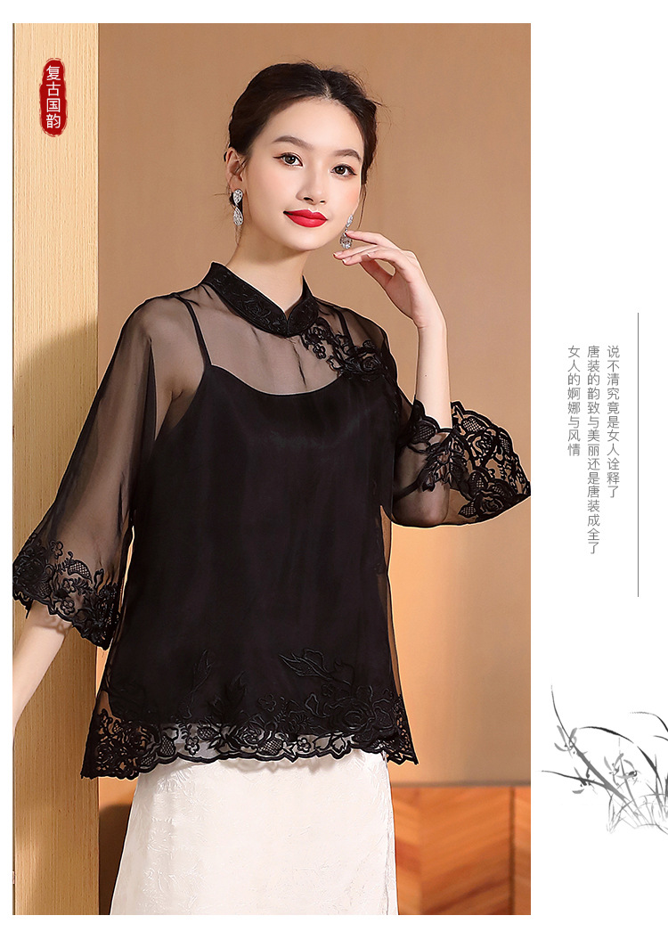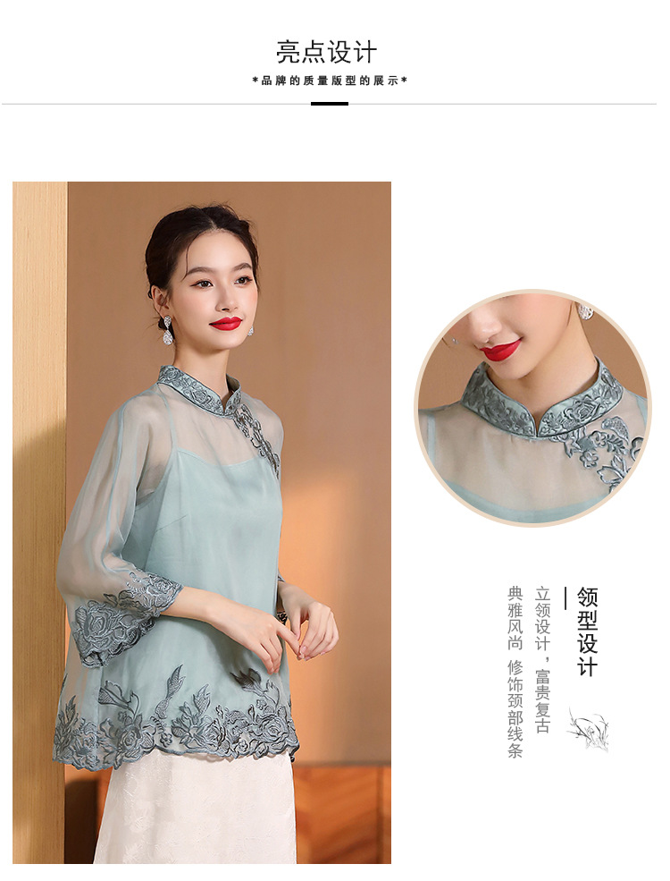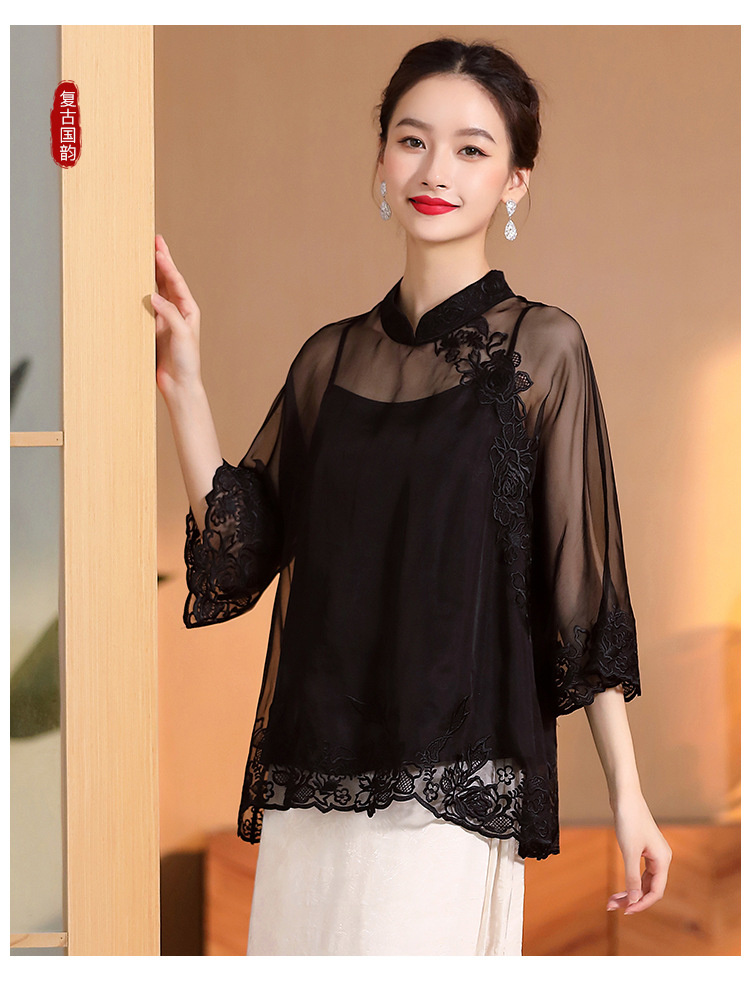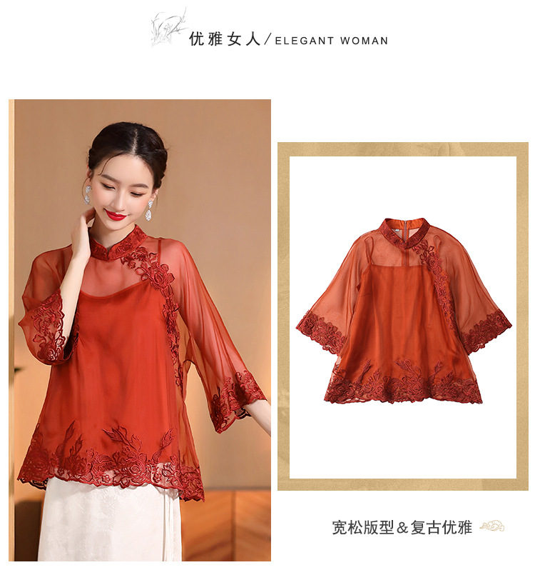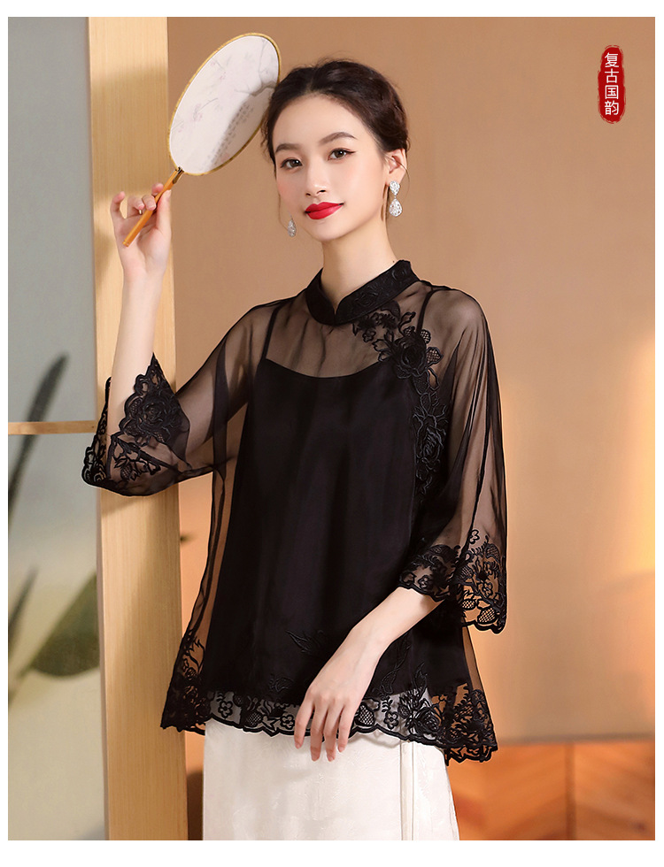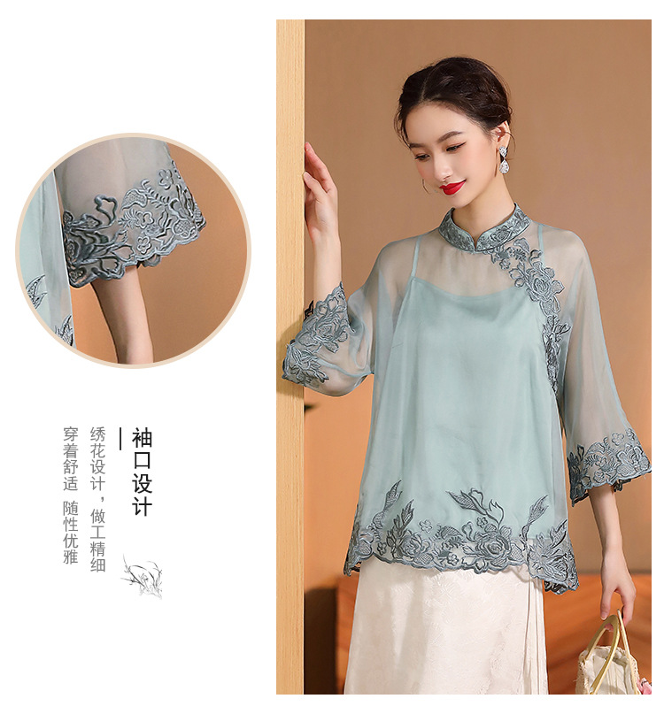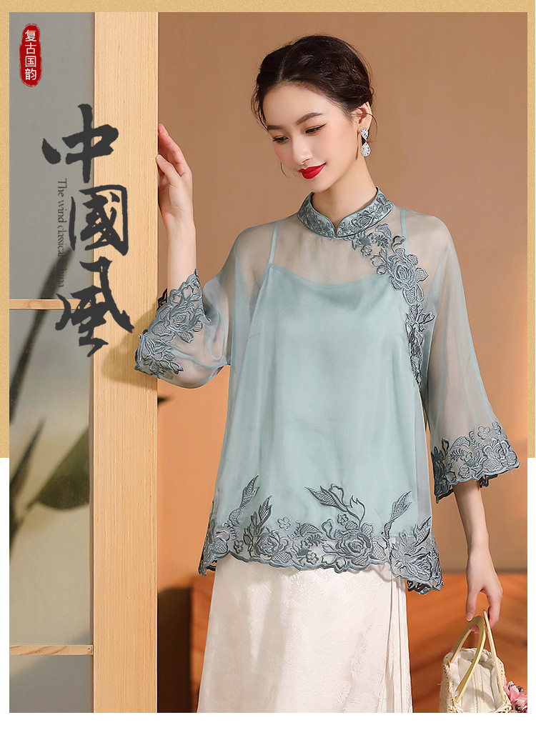 AYK-QF-2305099真丝绣花边上衣女宽松立领透视复古改良唐装女+吊带女两件套女装