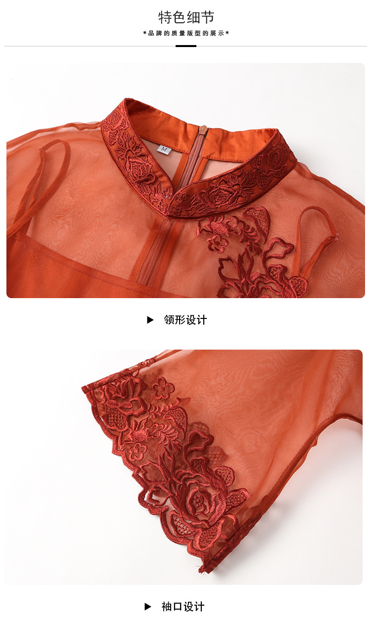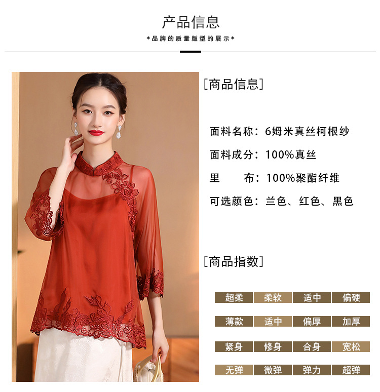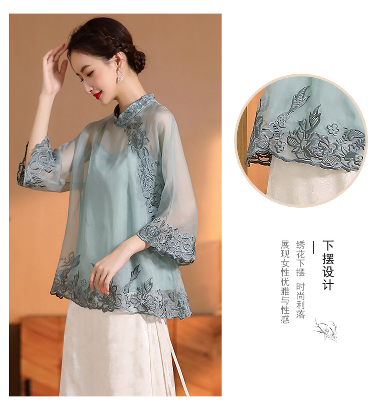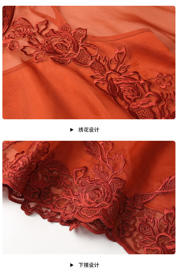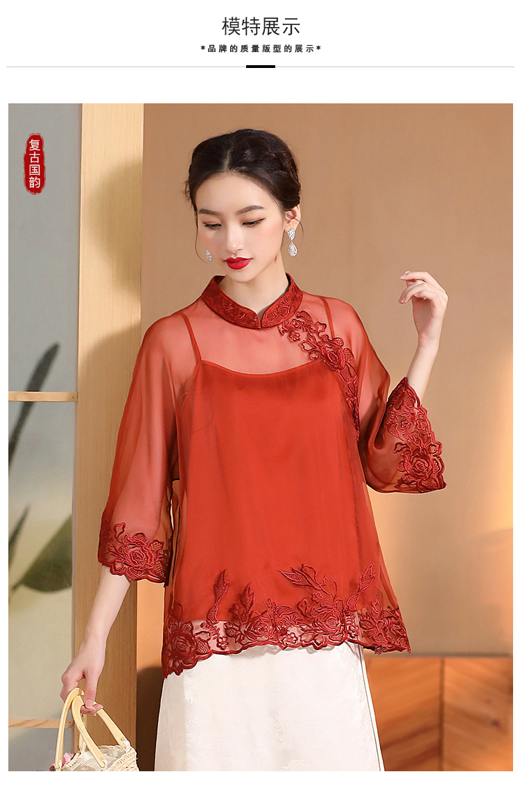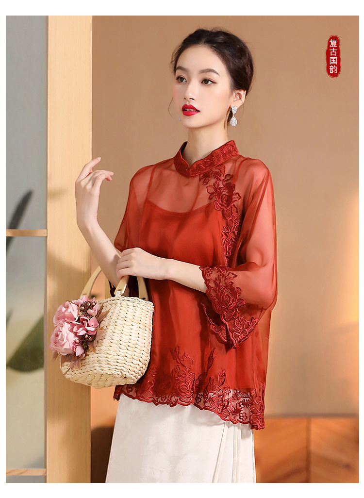 AYK-QF-2305099真丝绣花边上衣女宽松立领透视复古改良唐装女+吊带女两件套女装