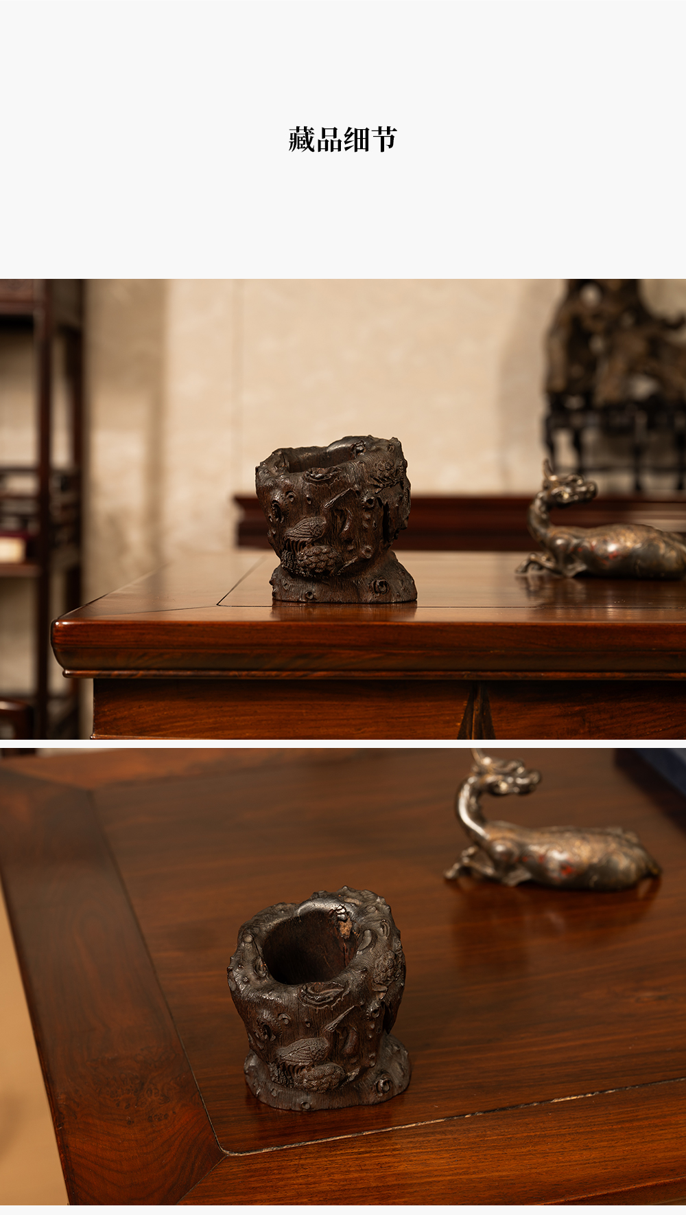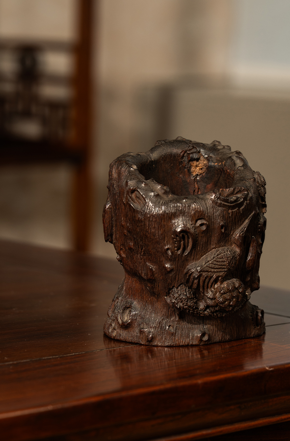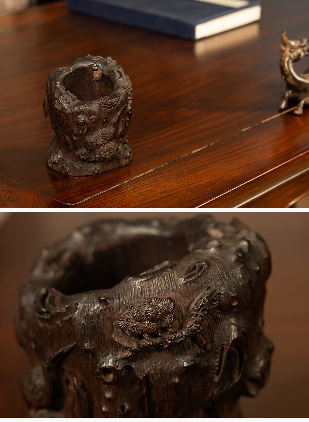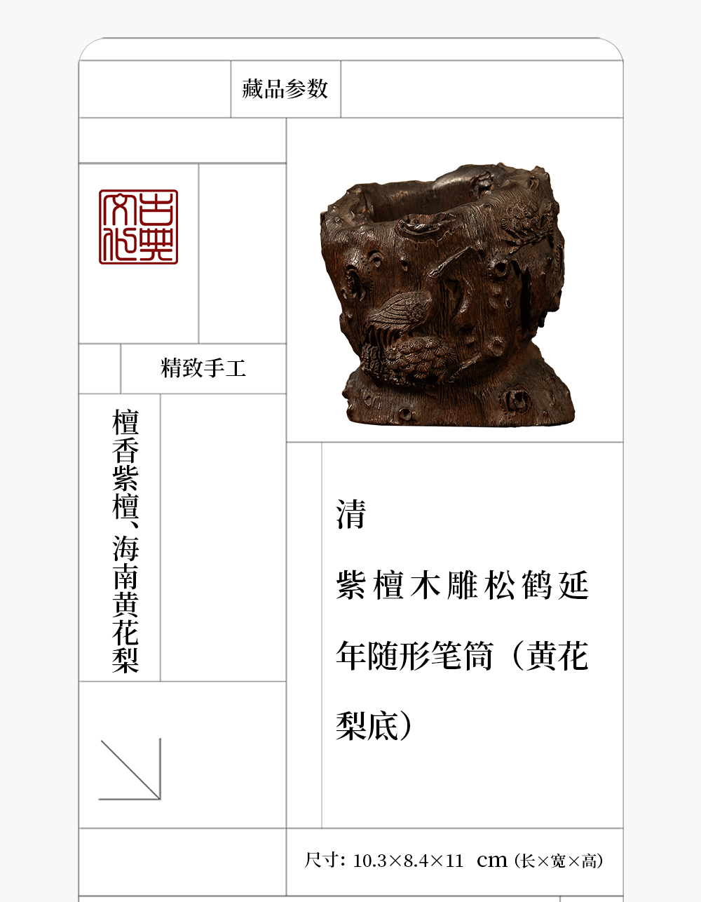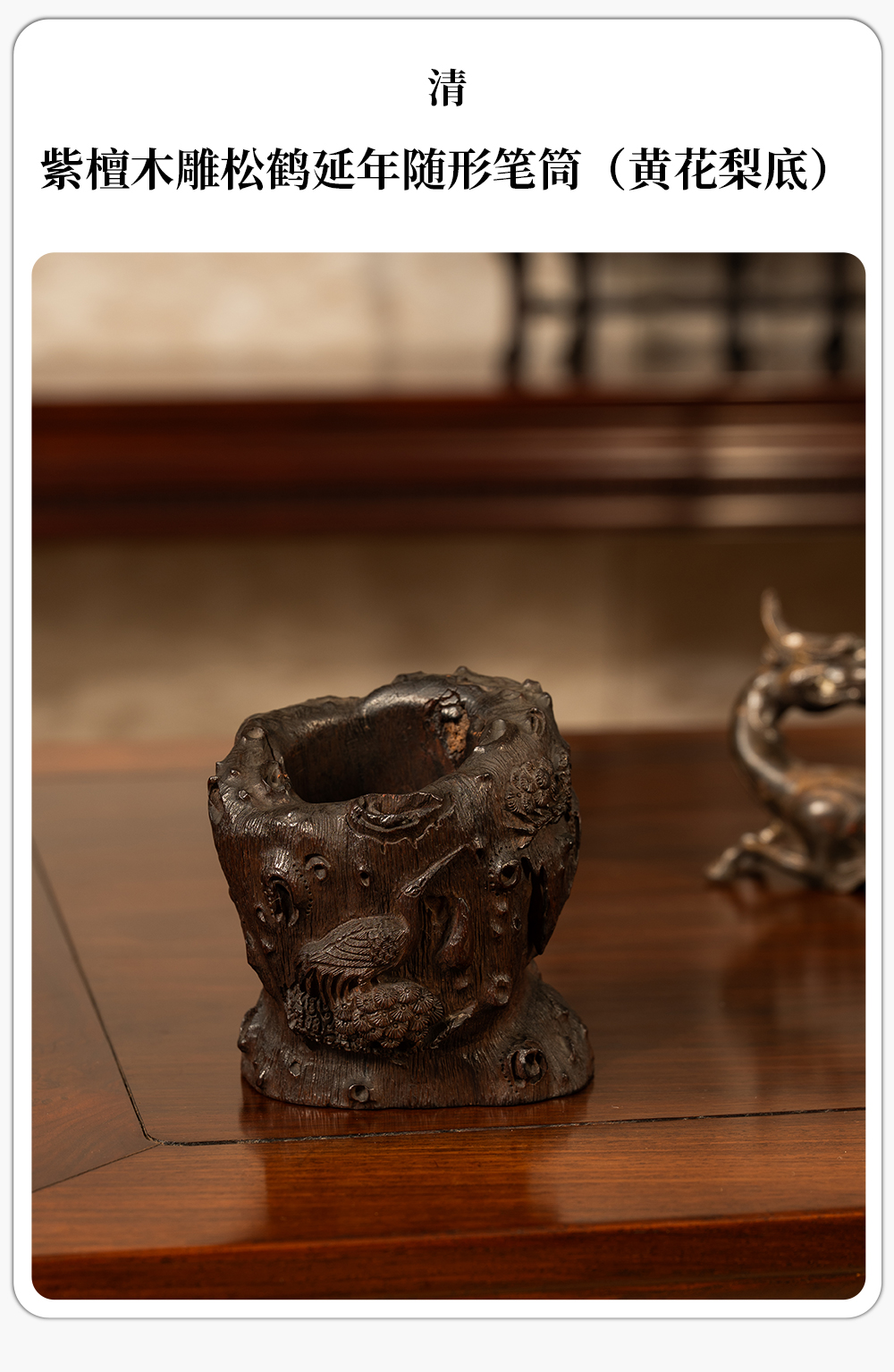 清 紫檀木雕松鹤延年随形笔筒(黄花梨底)