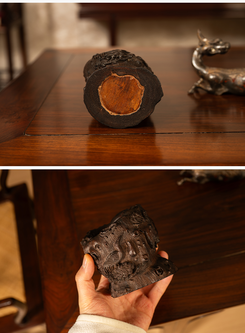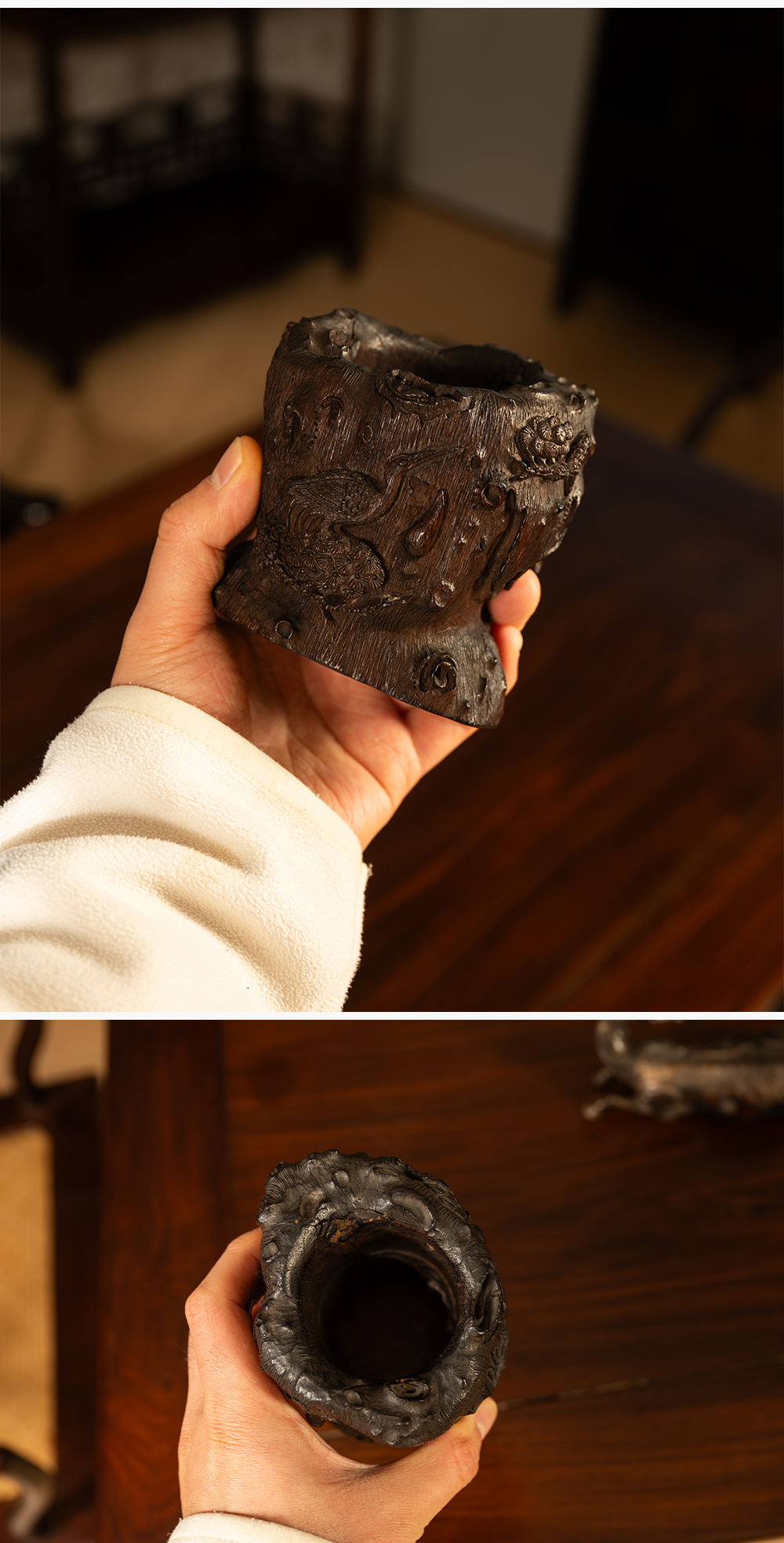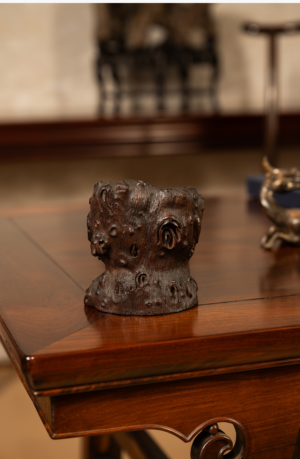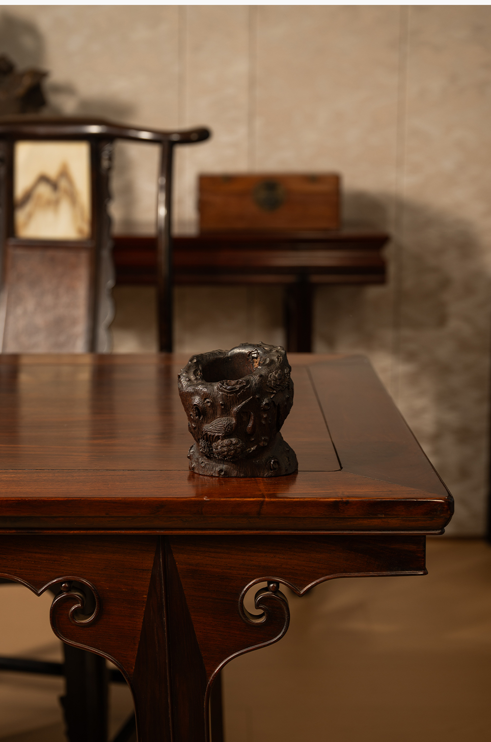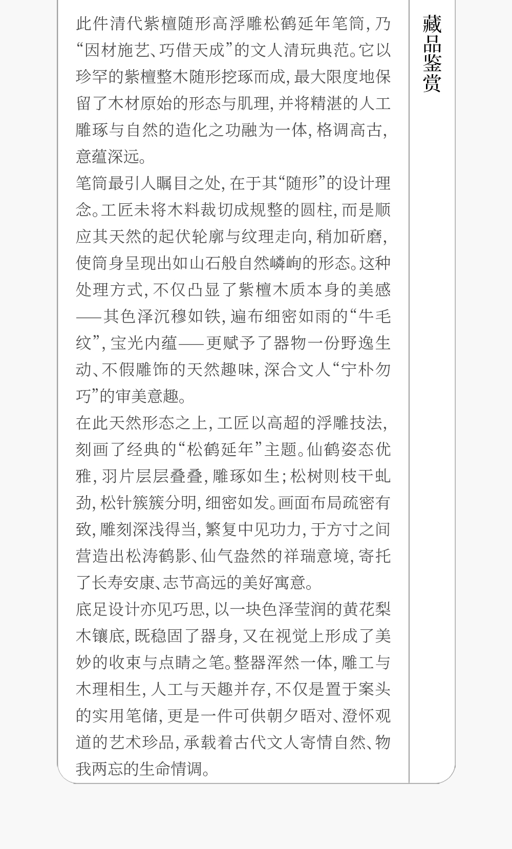 清 紫檀木雕松鹤延年随形笔筒(黄花梨底)