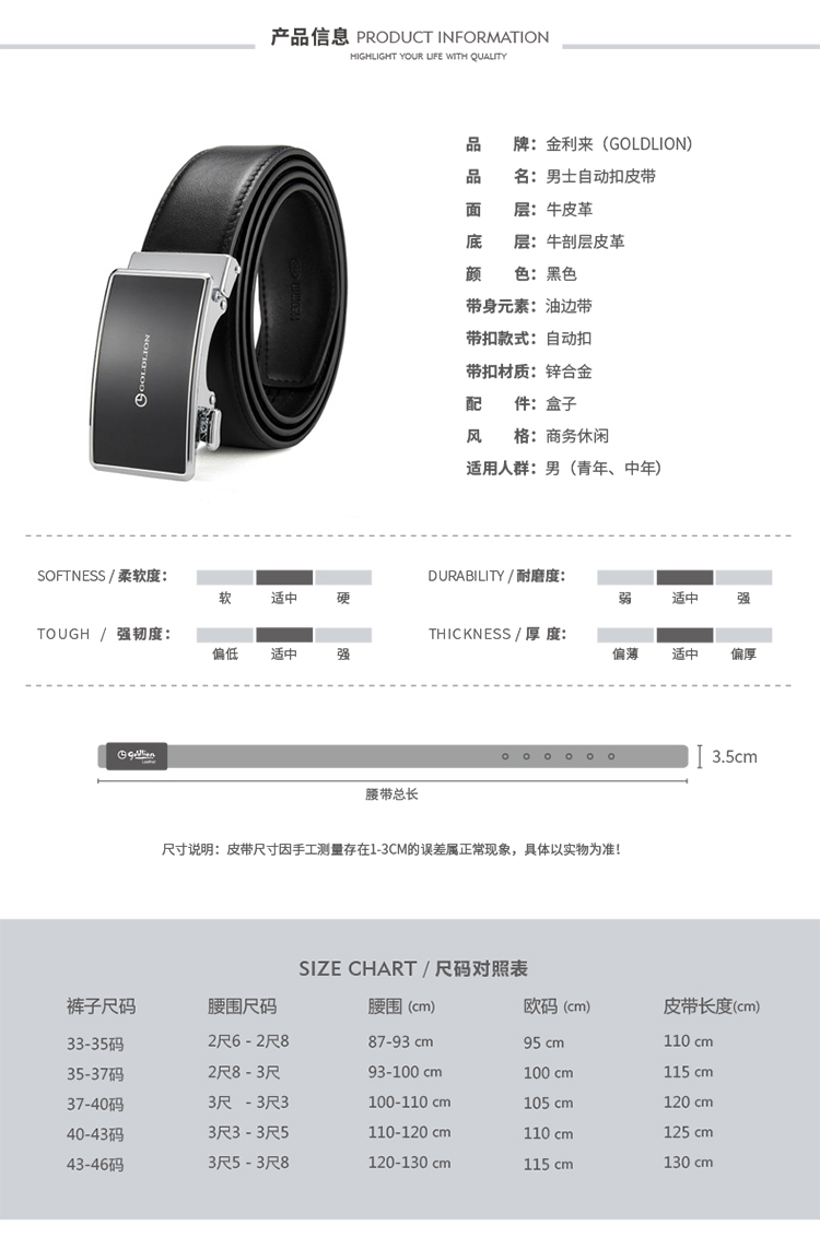 金利来(Goldlion)男皮带 男士休闲商务腰带男式裤带男款自动扣皮带
