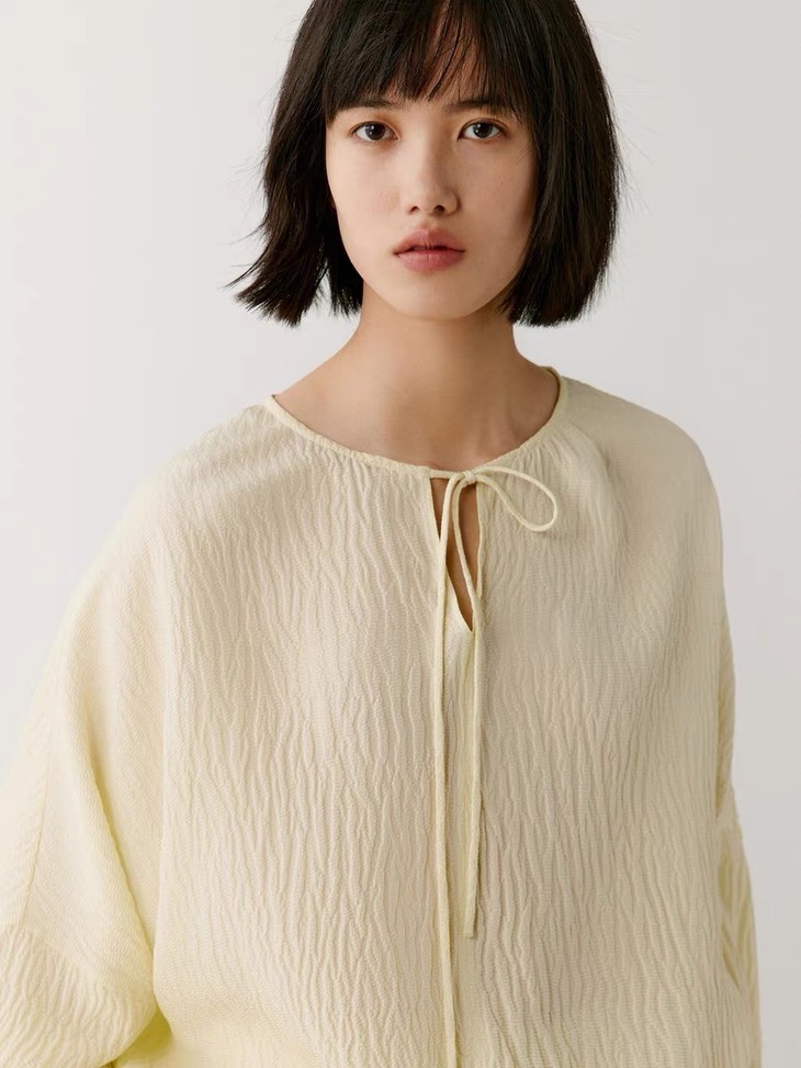 经常穿真丝的姐妹就知道,真丝确实很丝滑很舒服,长袖的宽松进入夏天或者有什么事需要挽起的时候就过于丝滑以至于挽不上hhhhh做成珍珠绉的形式,使它具有一定的肌理摩擦力,也不容易勾丝,长袖春秋可以单穿,进入夏天需要挽起也方便。