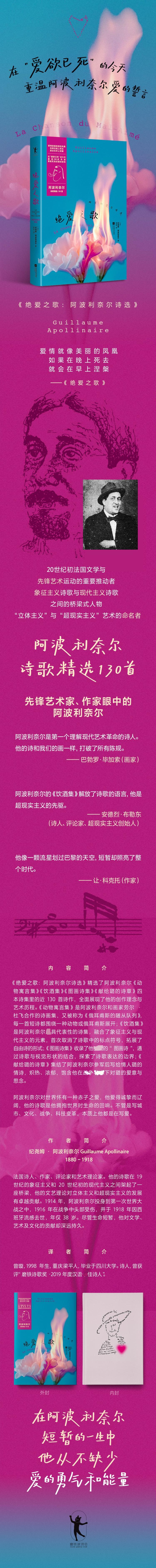 《绝爱之歌:阿波利奈尔诗选》精选了阿波利奈尔《动物寓言集》《饮酒集》《图画诗集》《献给璐的诗章》四本诗集里的近130首诗作,全面展现了他的创作理念与艺术历程。《动物寓言集》是阿波利奈尔和画家劳尔·杜飞合作的诗画集,又被称为《俄耳甫斯的随从队列》,每一首短诗都围绕一种动物或俄耳甫斯展开;《饮酒集》是阿波利奈尔拥有代表性的诗集,融合了象征主义与现代主义的元素,首次取消了诗歌中的标点符号,拓展了自由诗的形式;《图画诗集》收录了他的“图画诗”,通过诗歌与视觉形状的结合,探索了诗歌表达的边界;《献给璐的诗章》集结了阿波利奈尔参军后写给情人璐的情诗,炽热、浓郁,饱含他在战争状态下对璐的爱意与思念。