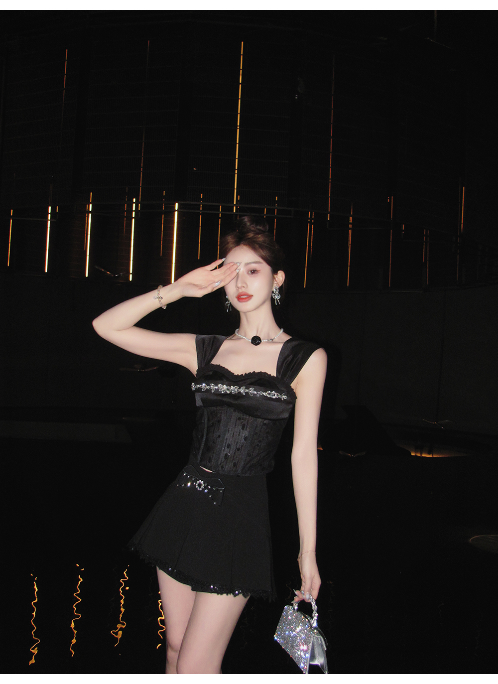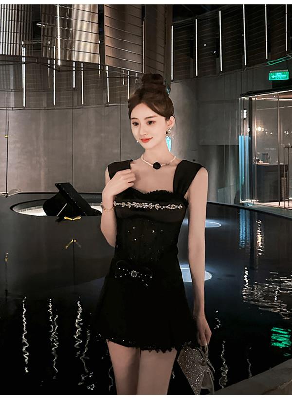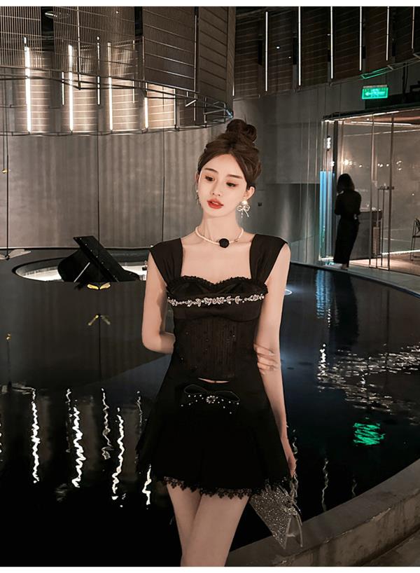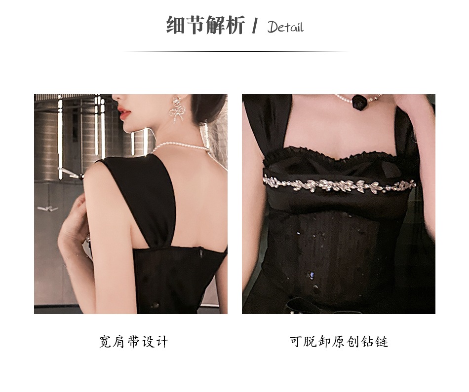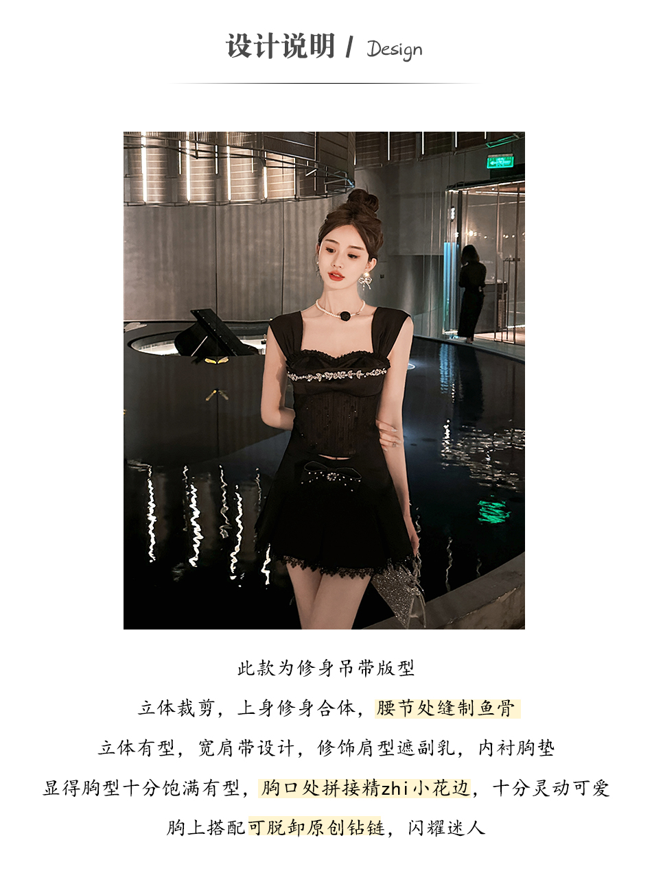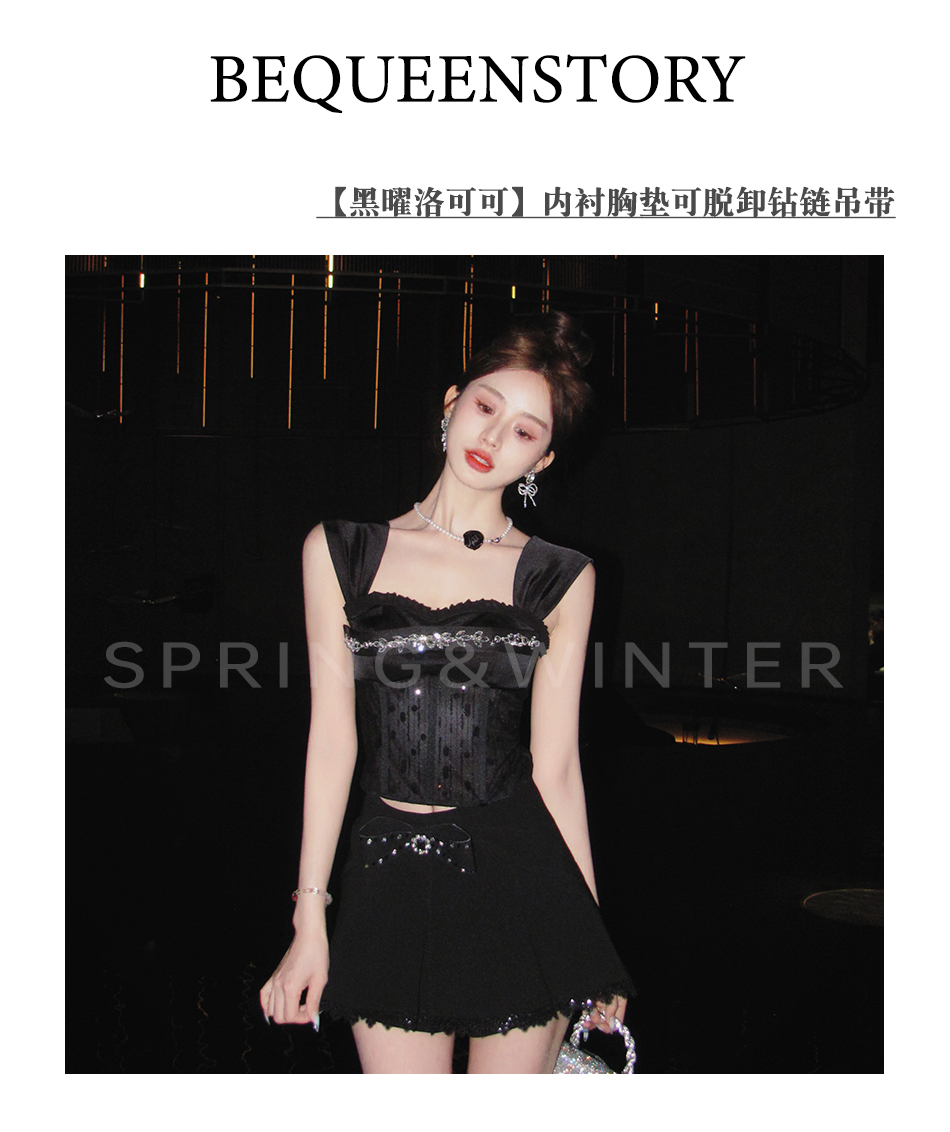 BeQueenStory【黑曜洛可可】绣花蕾丝内衬胸垫可脱卸钻链修身吊带夏