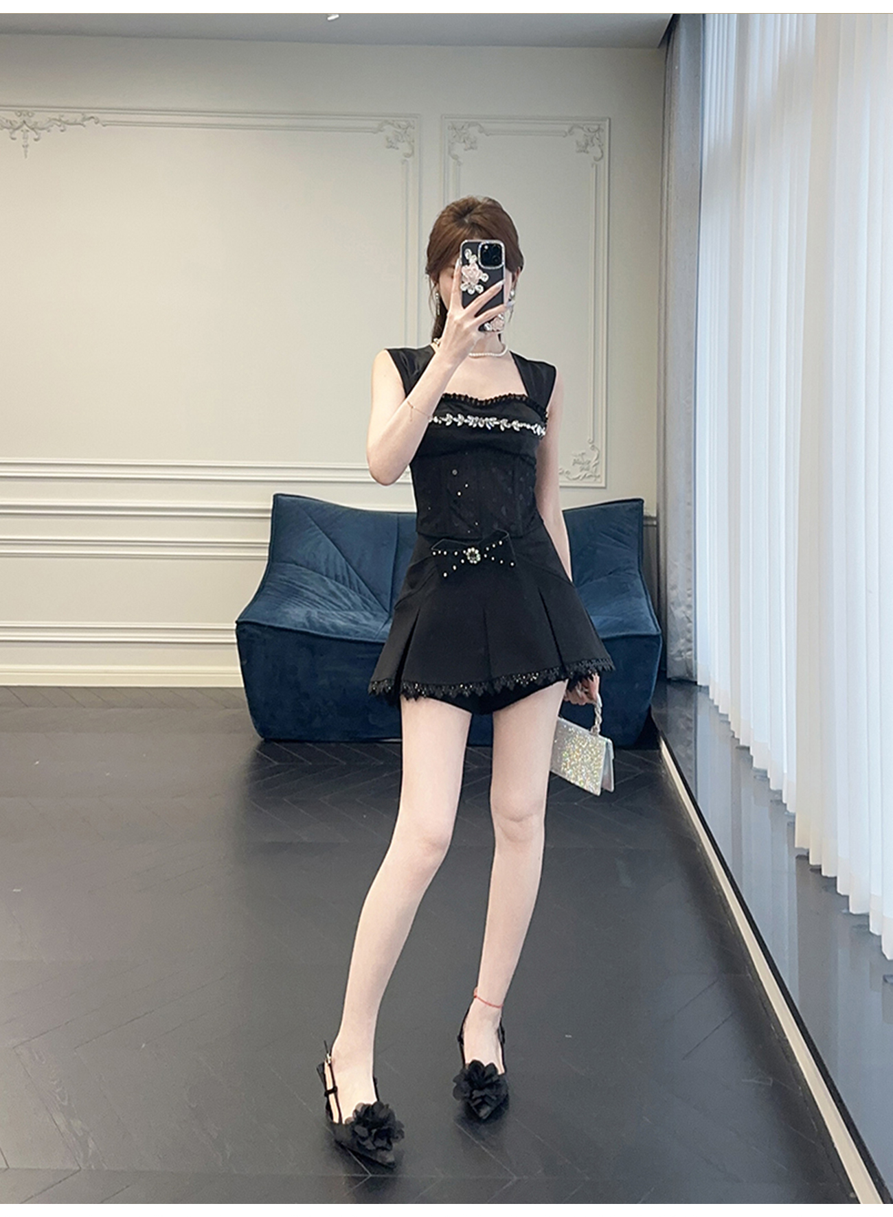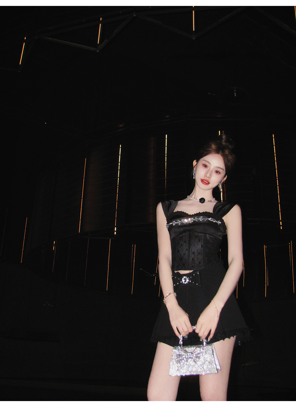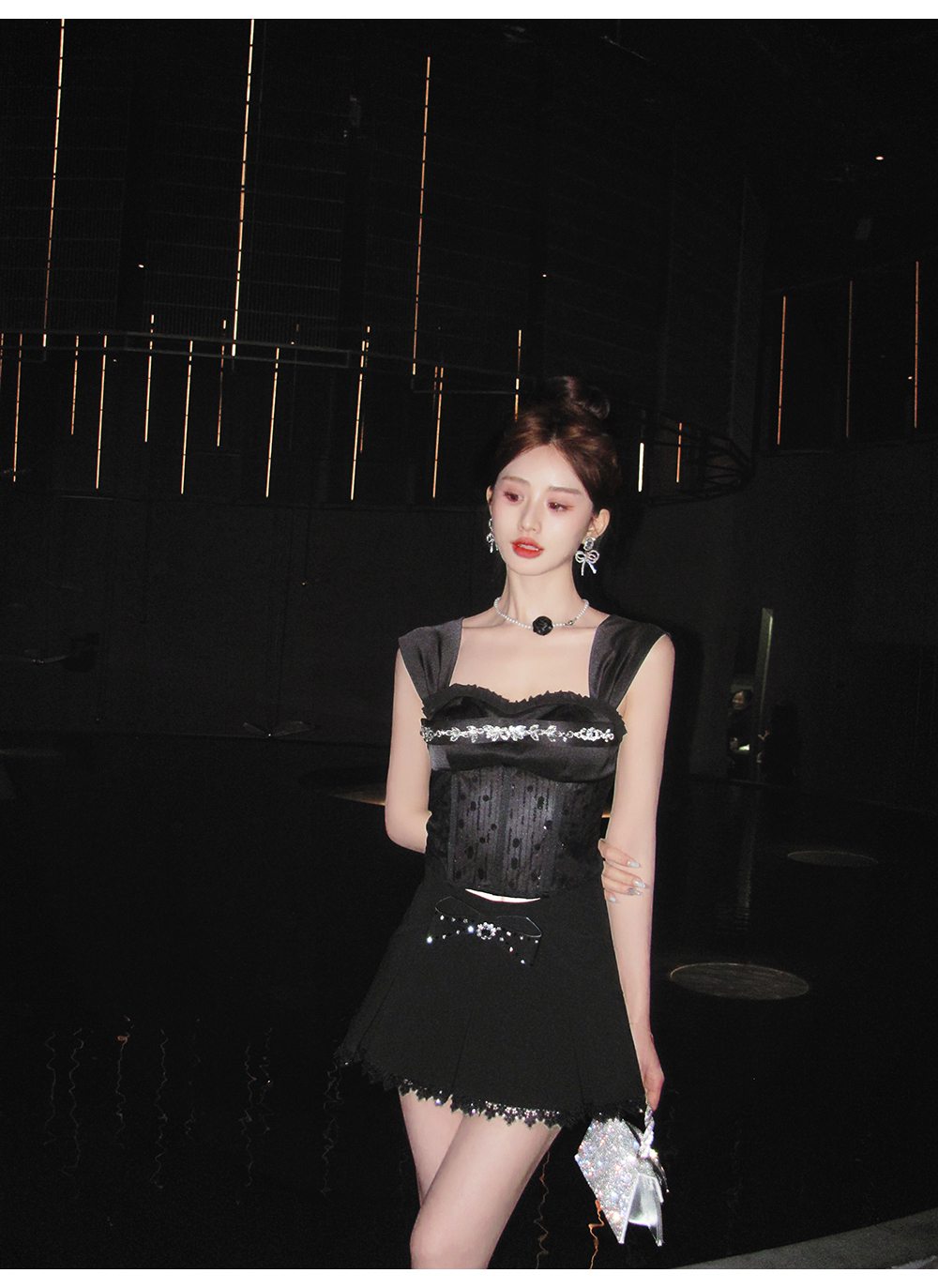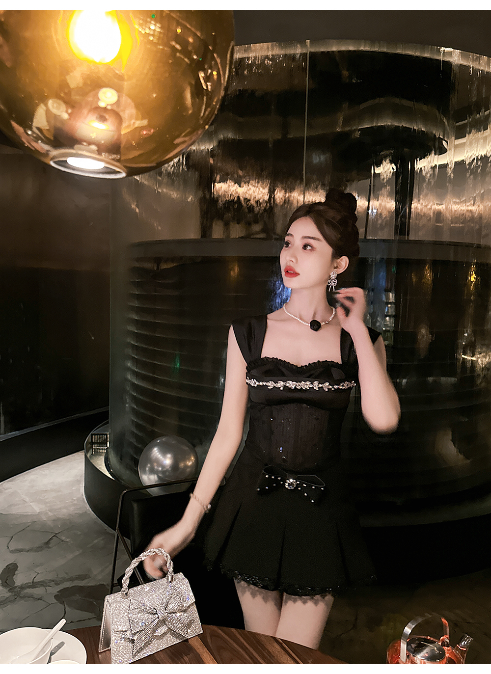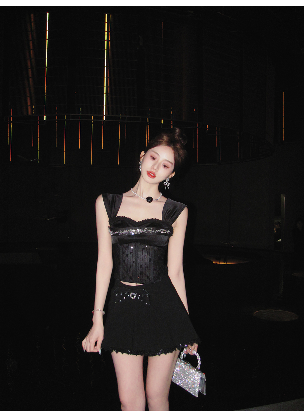BeQueenStory【黑曜洛可可】绣花蕾丝内衬胸垫可脱卸钻链修身吊带夏