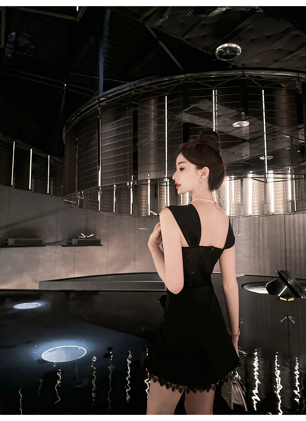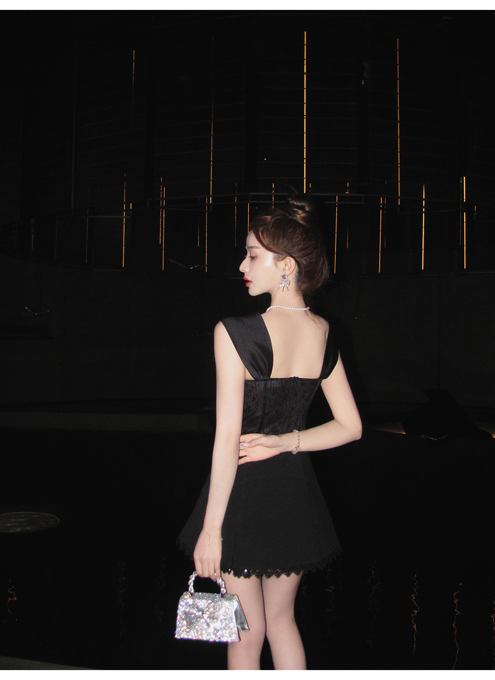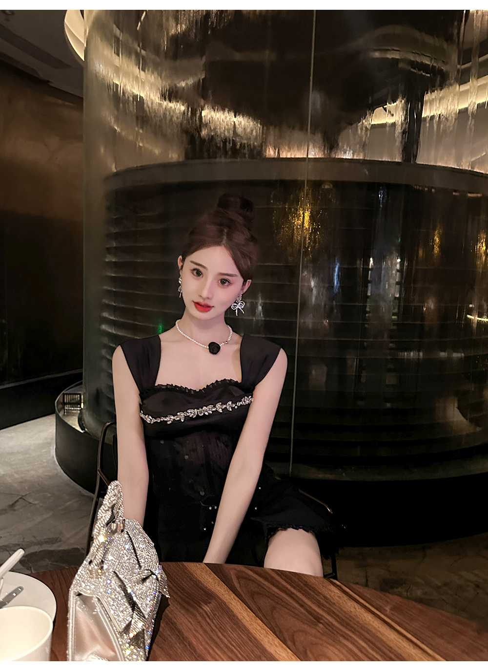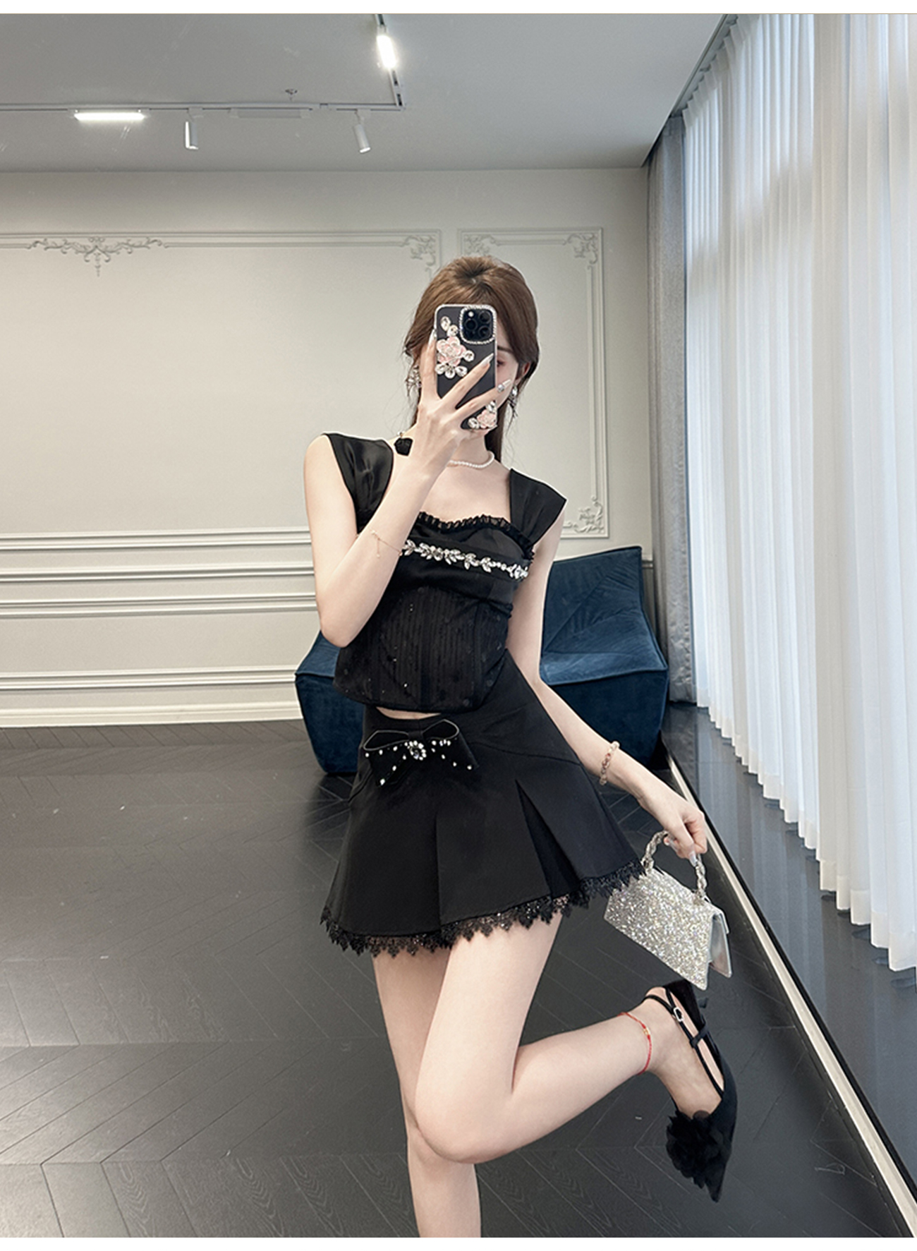 BeQueenStory【黑曜洛可可】绣花蕾丝内衬胸垫可脱卸钻链修身吊带夏