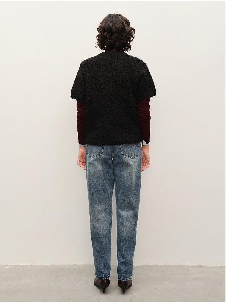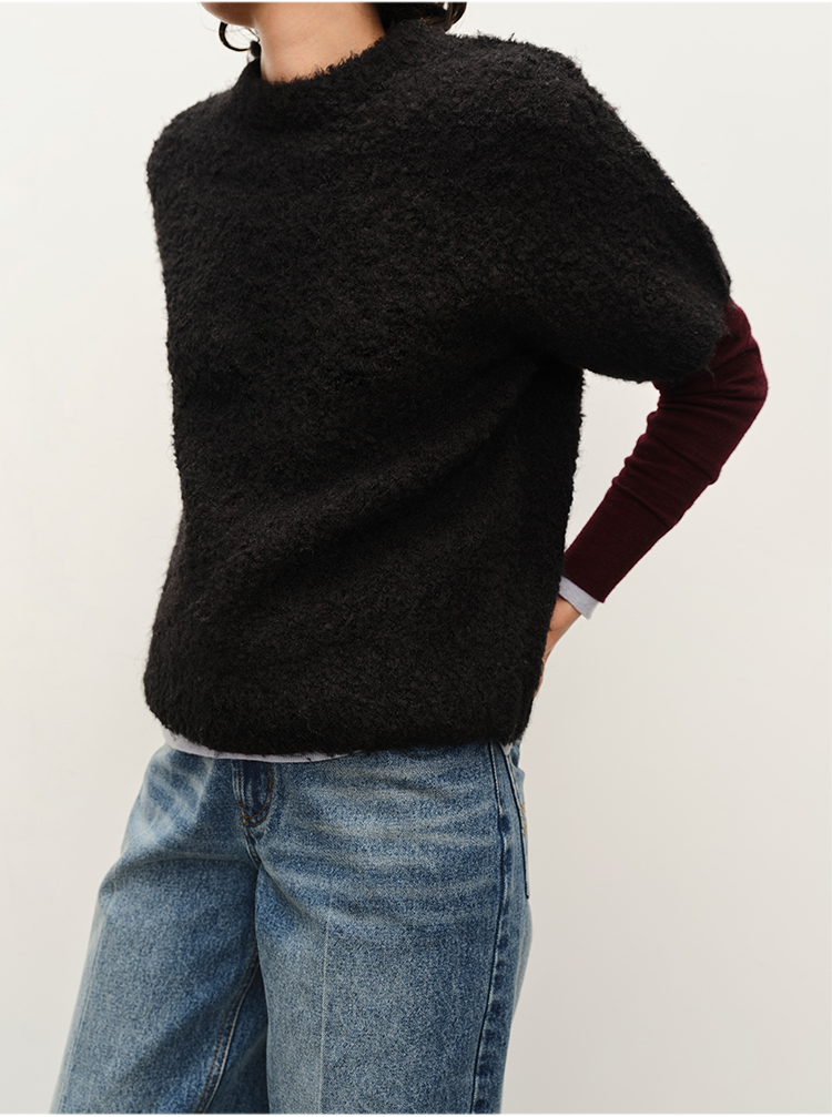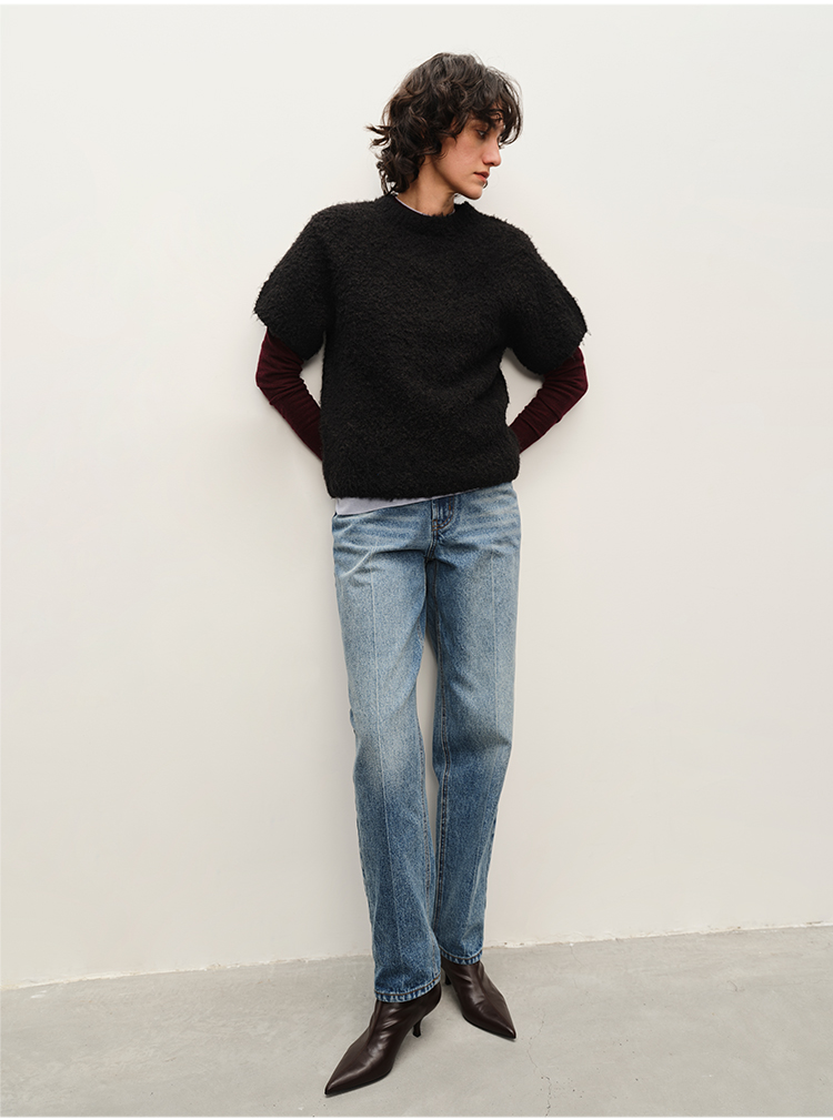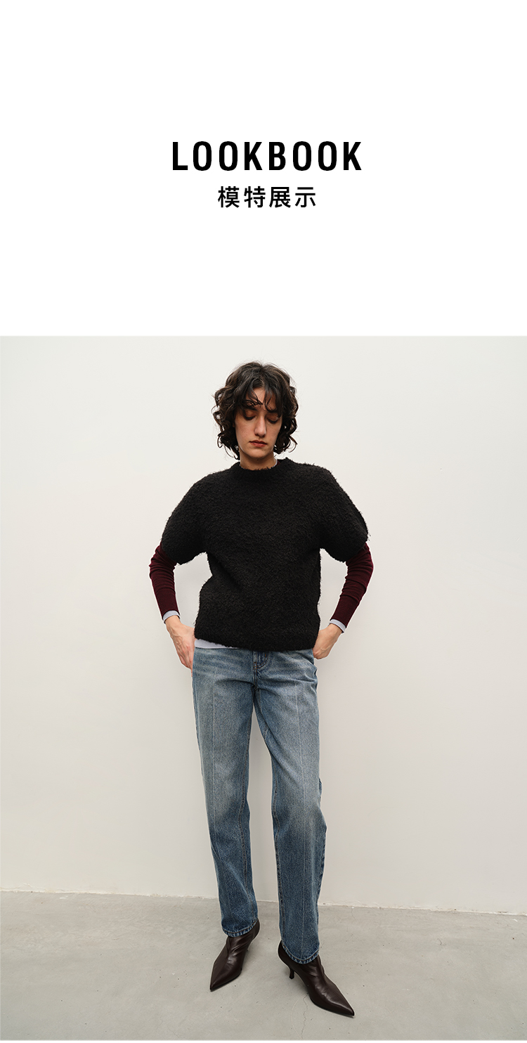 HIDEMI 极简圆领短袖羊毛圈圈纱针织上衣