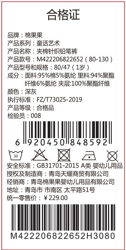 | 裤长 | 45.5 | 51 | 56.5 | 62.5 | 68.5 | 75 |