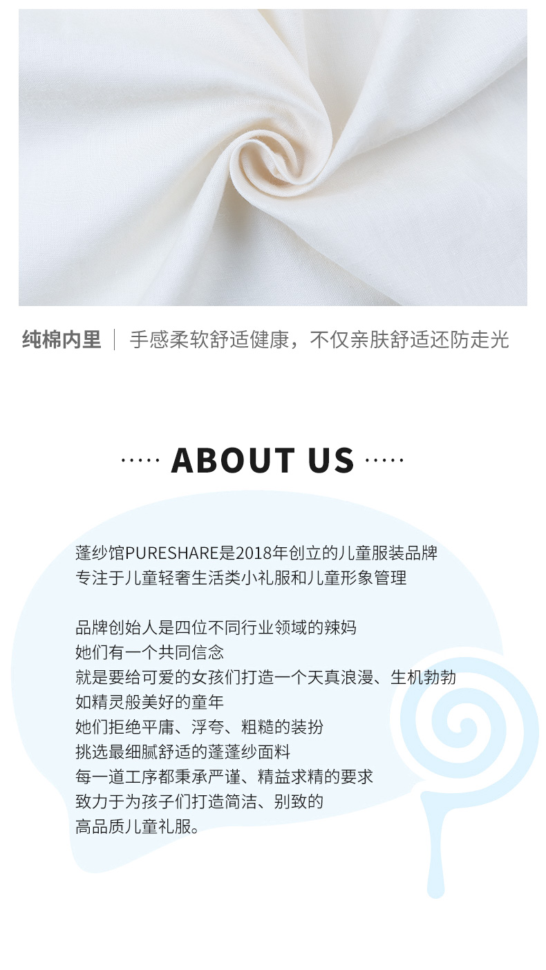 - PureShare蓬纱馆,2018年创立的儿童服装品牌,专注于儿童轻奢生活类小礼服,主张“让孩子做最独特的自己”的品牌理念,为孩子们提供时尚简洁、优雅而又不失童真的生活类礼服。