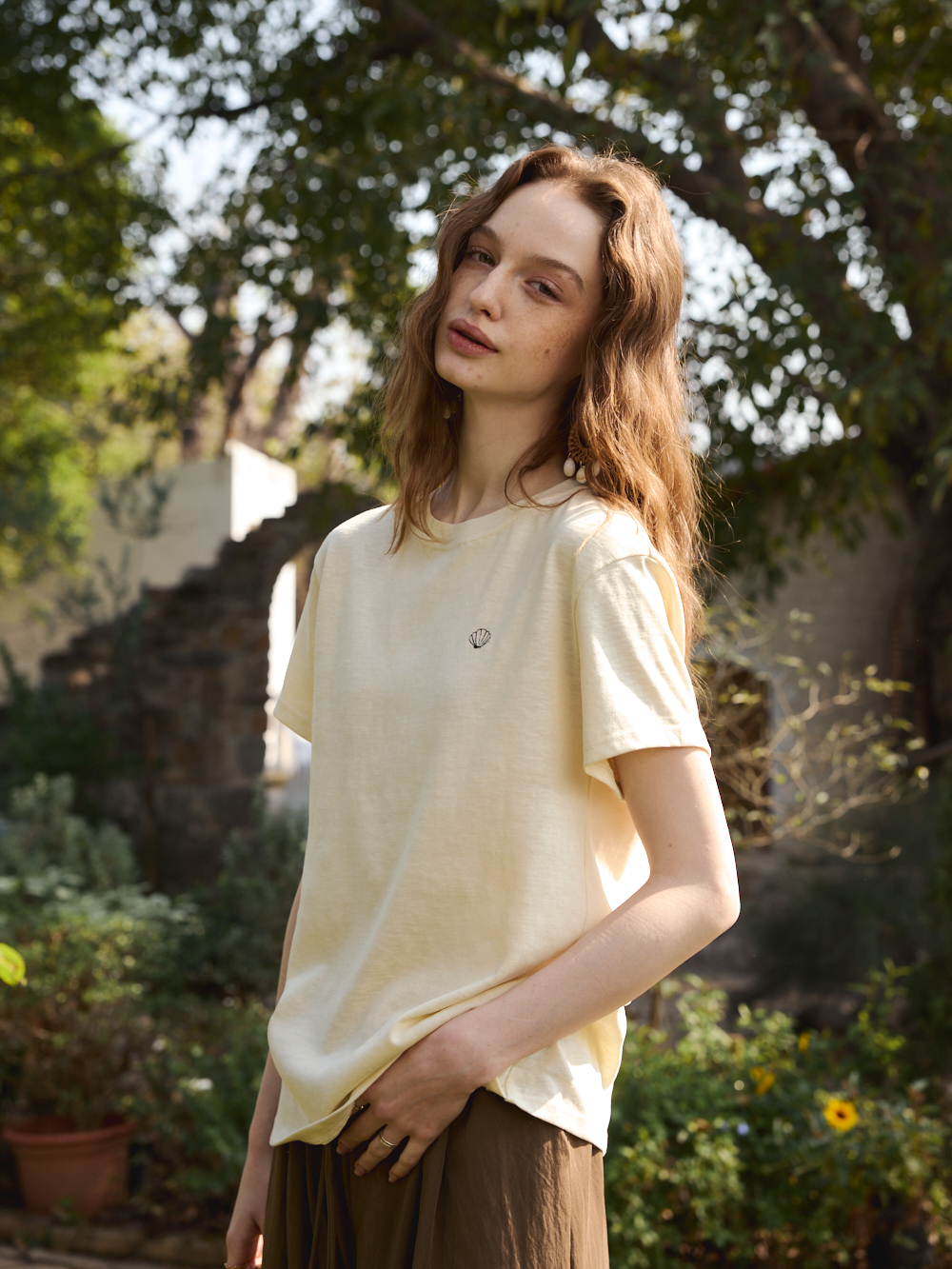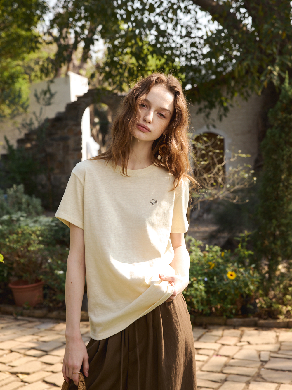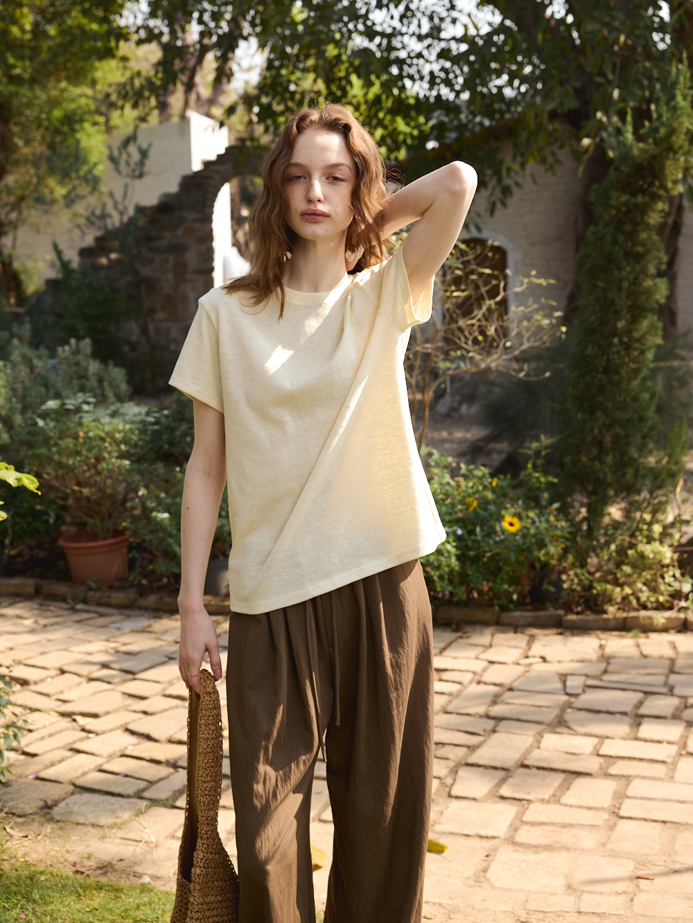 OLrain欧芮儿2026针织短袖T恤黄色宽松舒适透气休闲上衣
