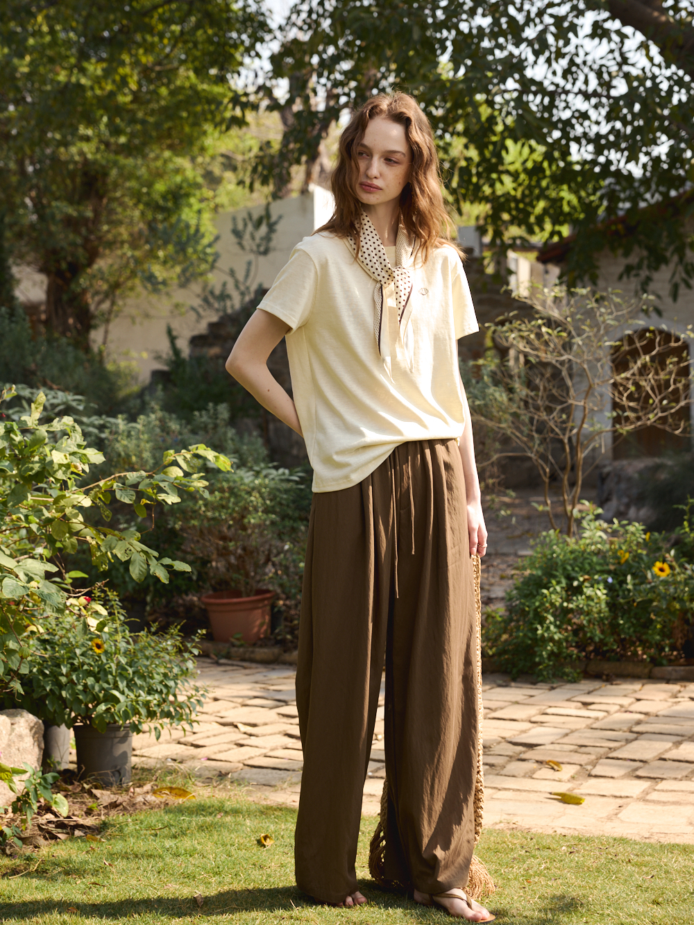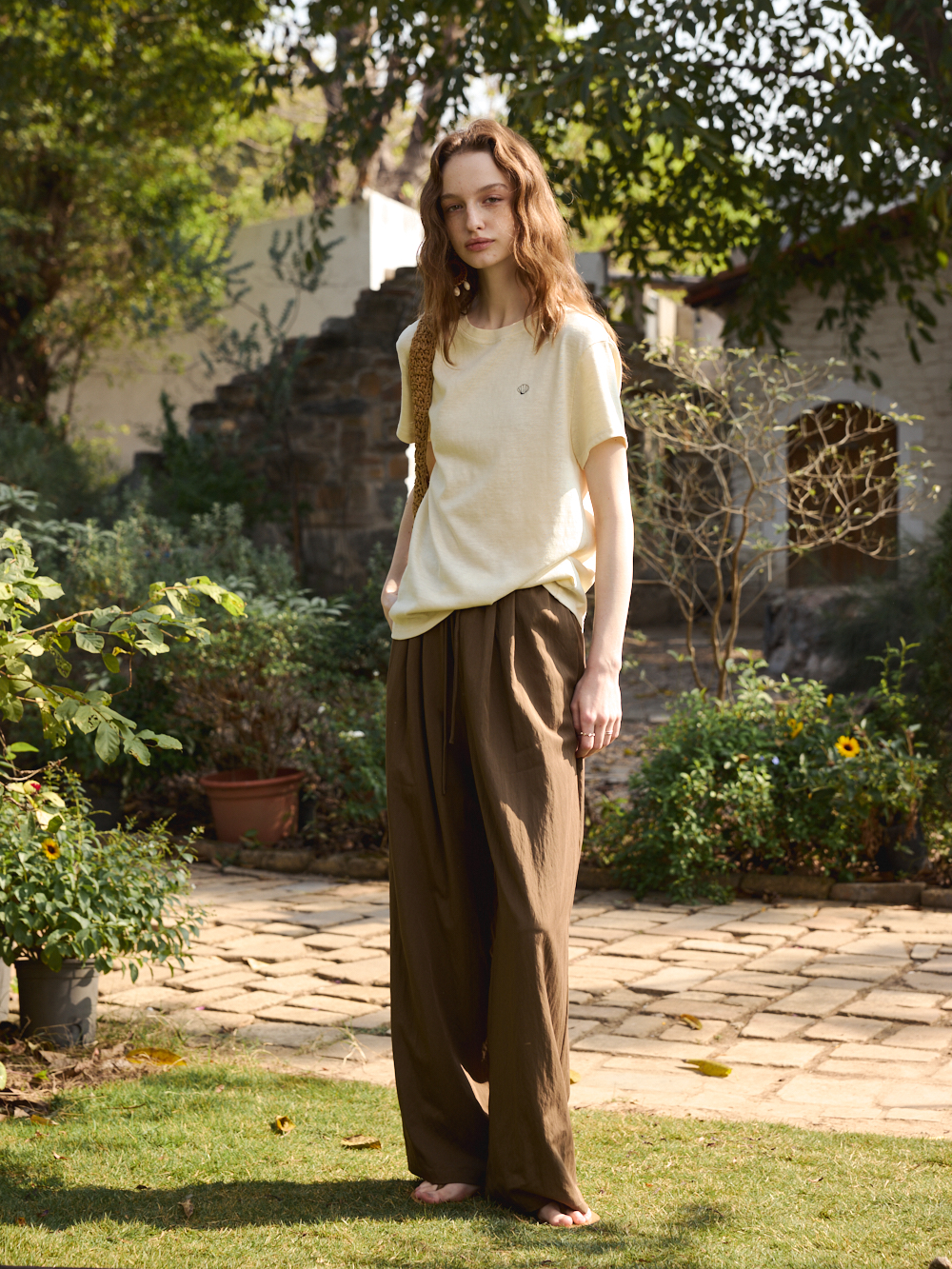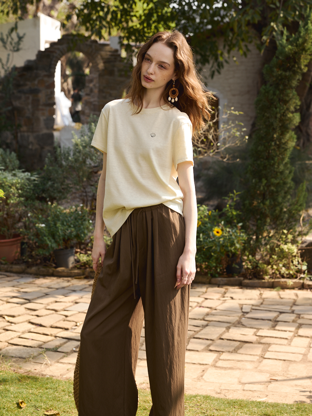 OLrain欧芮儿2026针织短袖T恤黄色宽松舒适透气休闲上衣