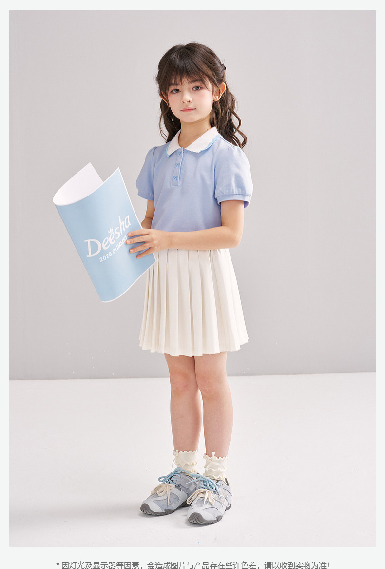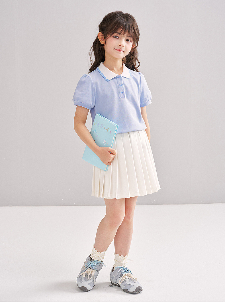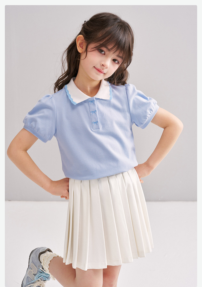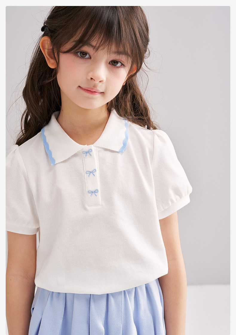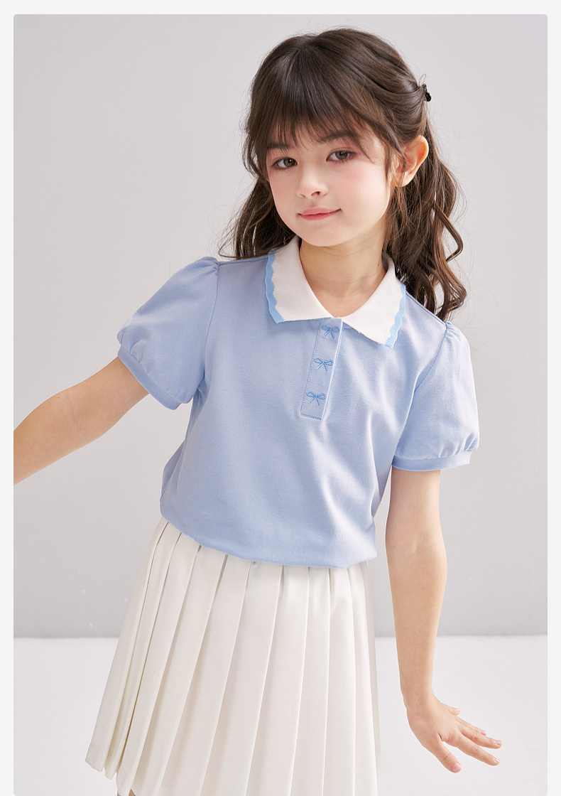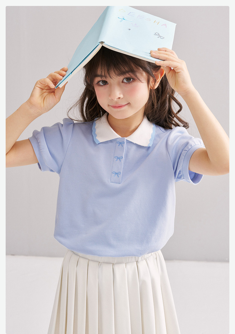 笛莎/Deesha 【松饼熊】2026年夏季新款女童撞色翻领蝴蝶结绣花学院风短袖T恤