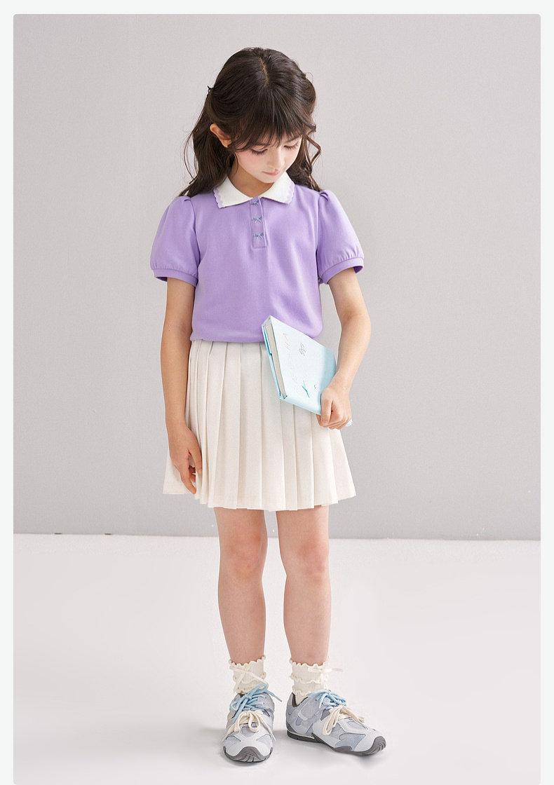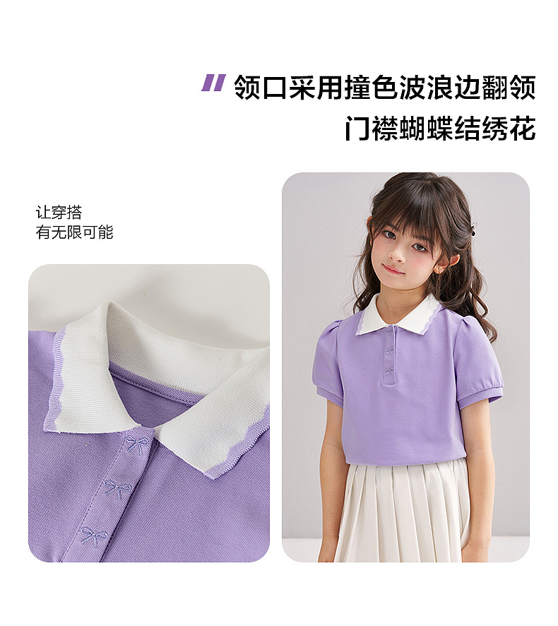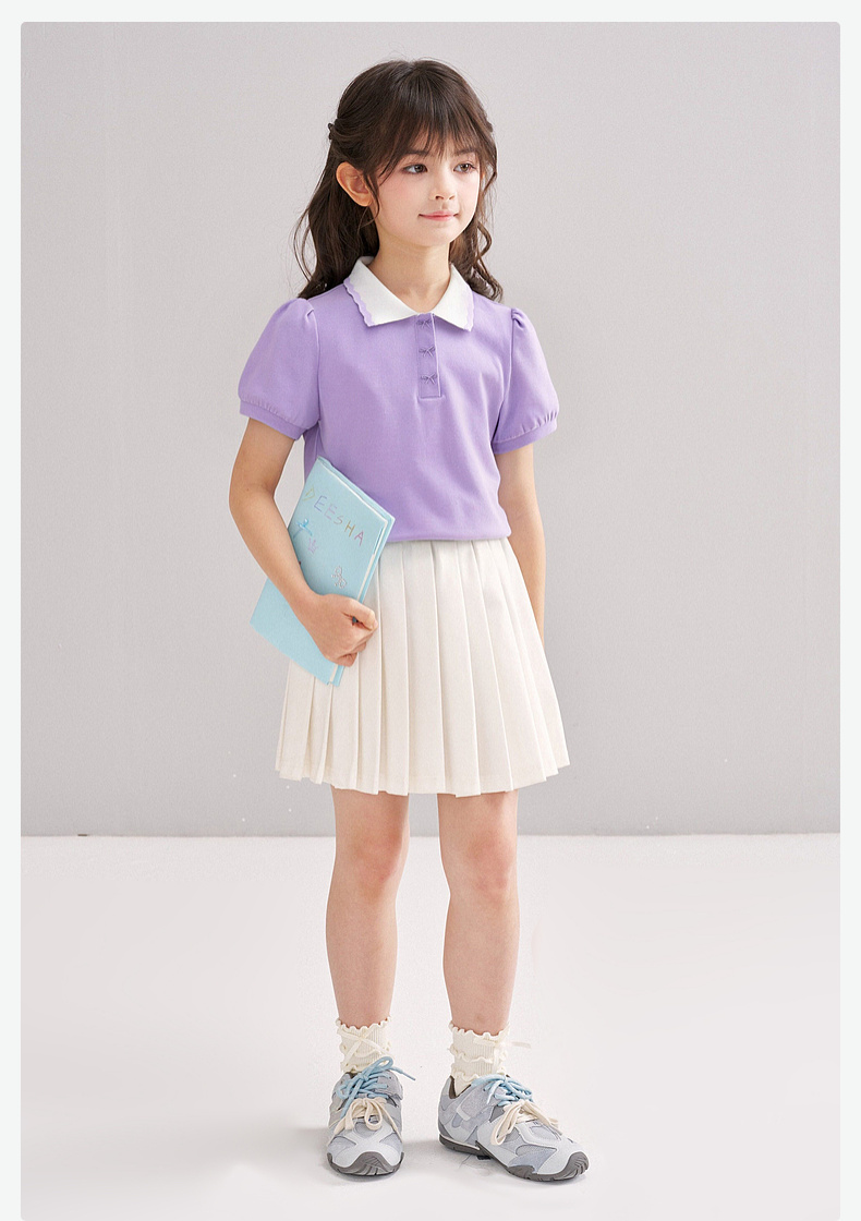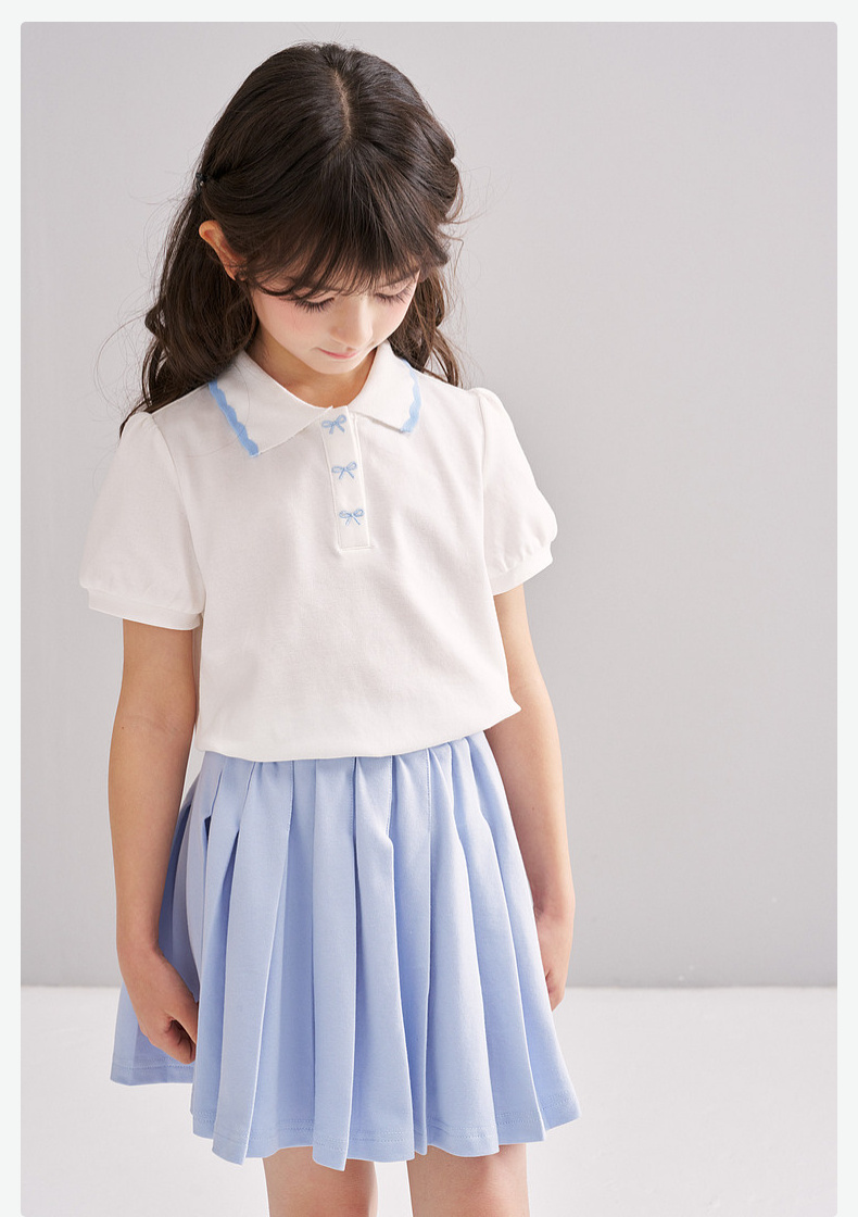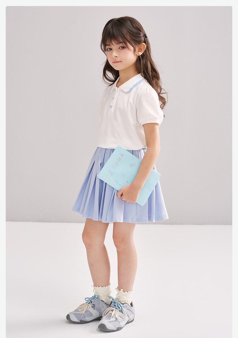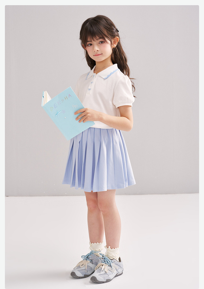 笛莎/Deesha 【松饼熊】2026年夏季新款女童撞色翻领蝴蝶结绣花学院风短袖T恤
