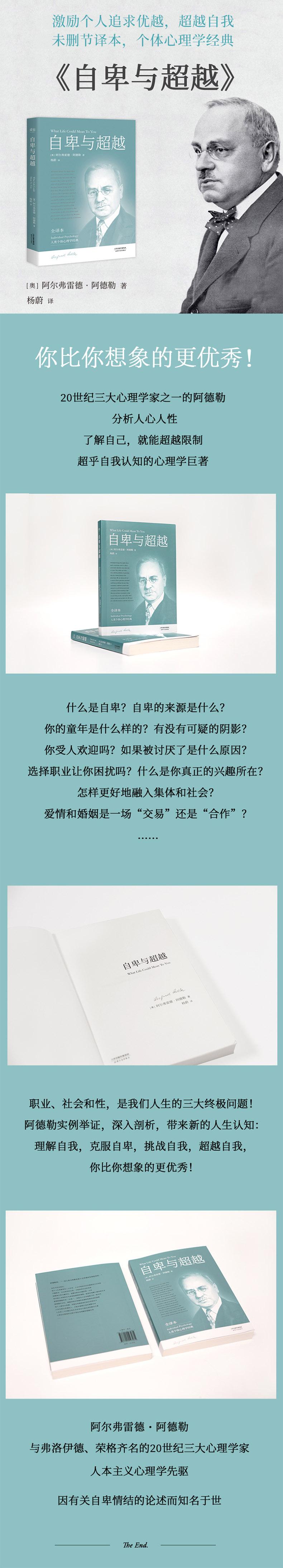 阿德勒说:“一切人类文明都是基于自卑感而发展起来的。”这本阿尔弗雷德·阿德勒著杨蔚译的《自卑与超越(全译本)》告诉我们:每个人生来就背负三大任务,人生所要面对的问题都因它们而起,平衡职业、社会和性的关系,才能获得长远的发展,挖掘真正的兴趣所在,是解决职业问题的专享方法,用对别人有利的行为来获取感情和尊敬,能更好地融入集体和社会,爱情和婚姻并非“交易”,而是为人生幸福建立的一种合作,推测童年记忆,就能找到自卑感的来源和性格形成的真相,每个人都有自卑感,克服自卑感是我们成长的原动力,只有克服自卑感的人,才能在碰壁后及时调整方向,人生的三大问题总是在寻求更加丰富完美的解决方案,人类也在挑战的过程中更好地理解和超越自我。