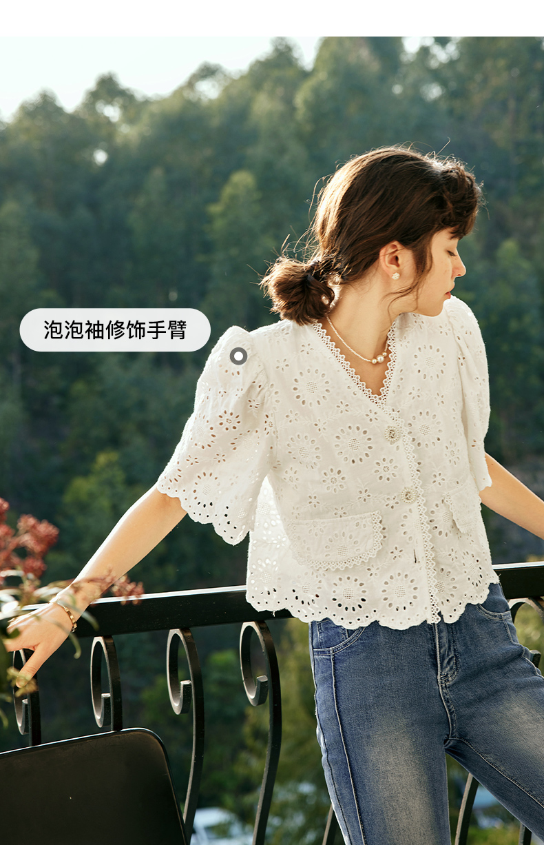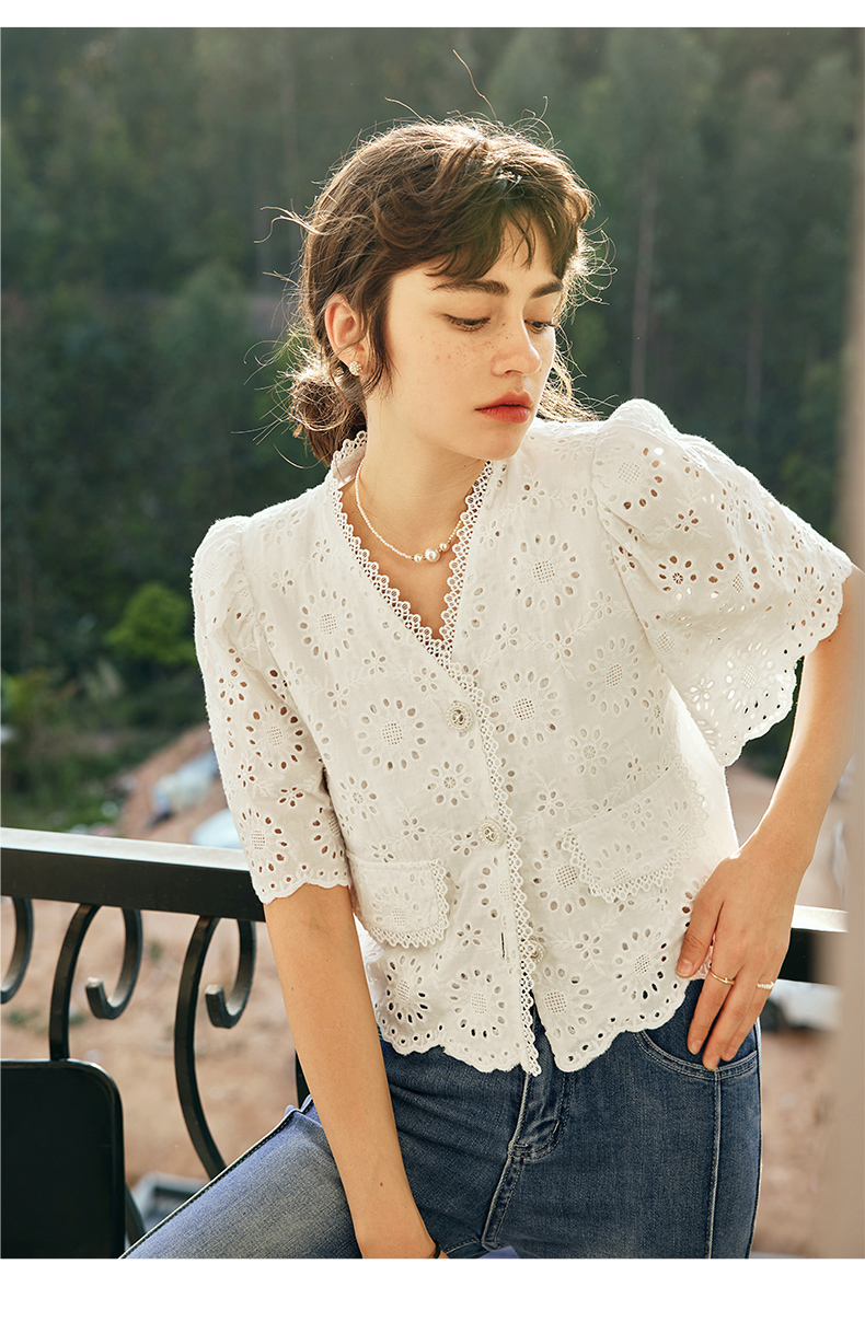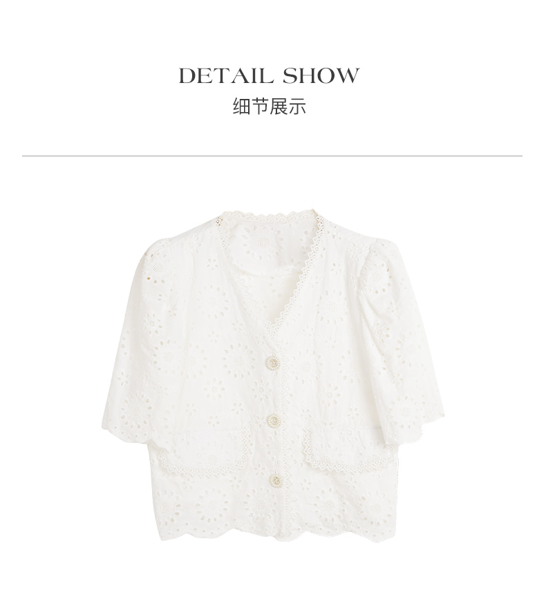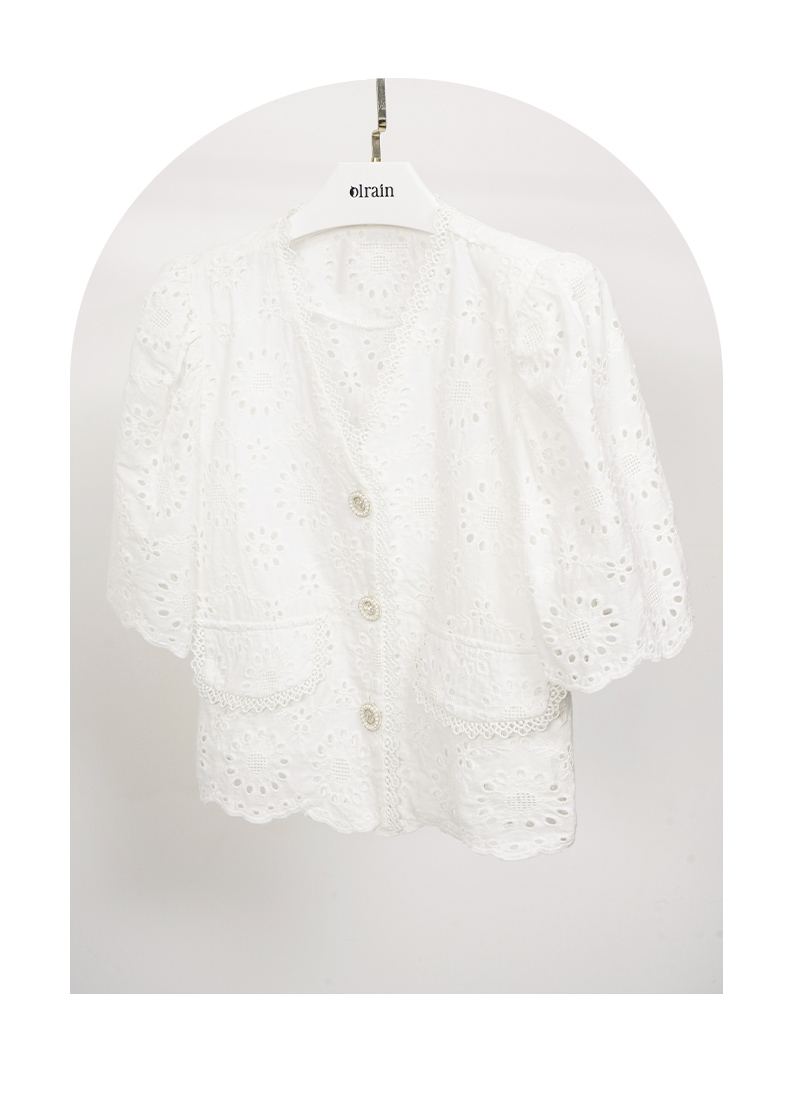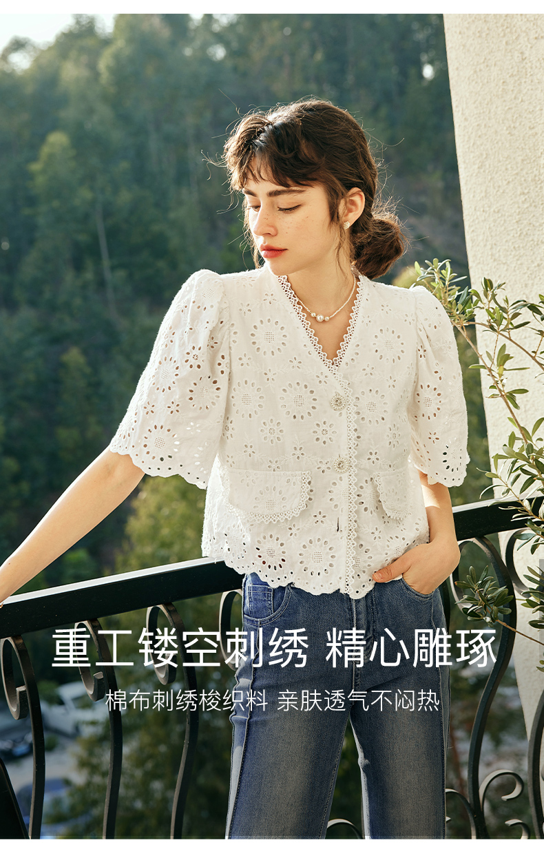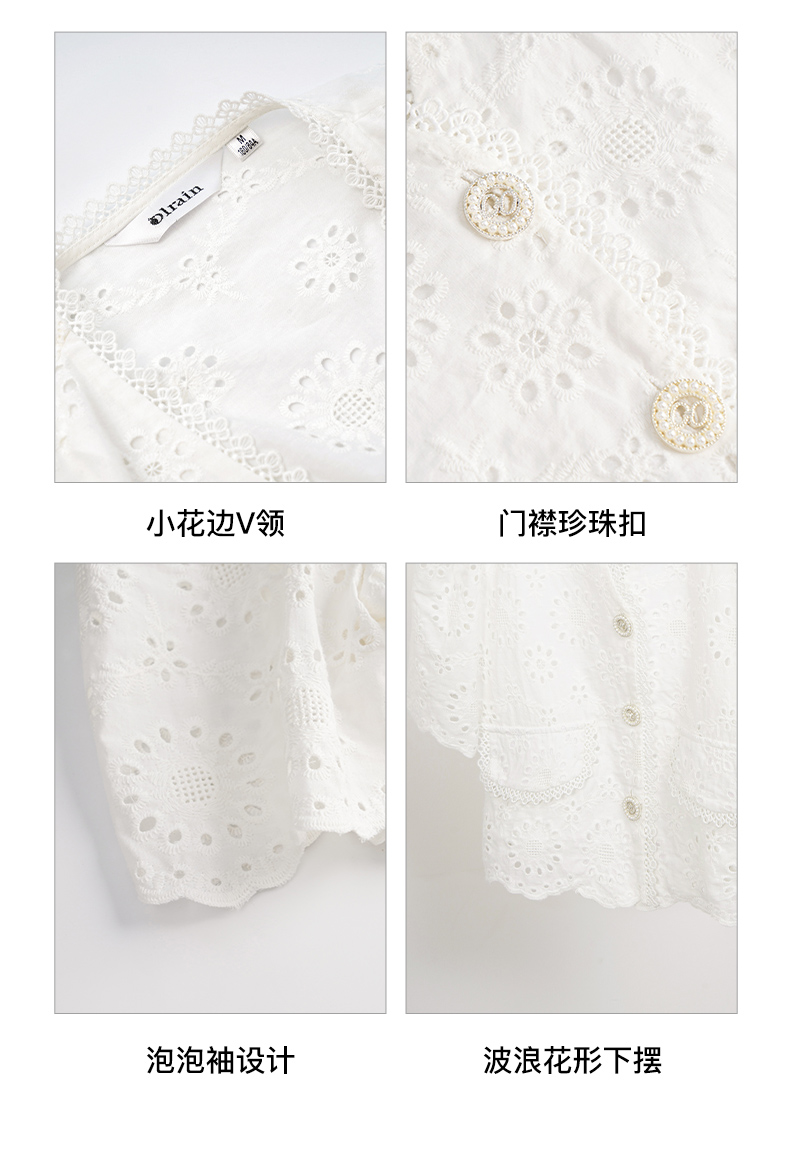 OLrain欧芮儿法式白色v领蕾丝雪纺衫女夏季2023新款镂空刺绣小衫