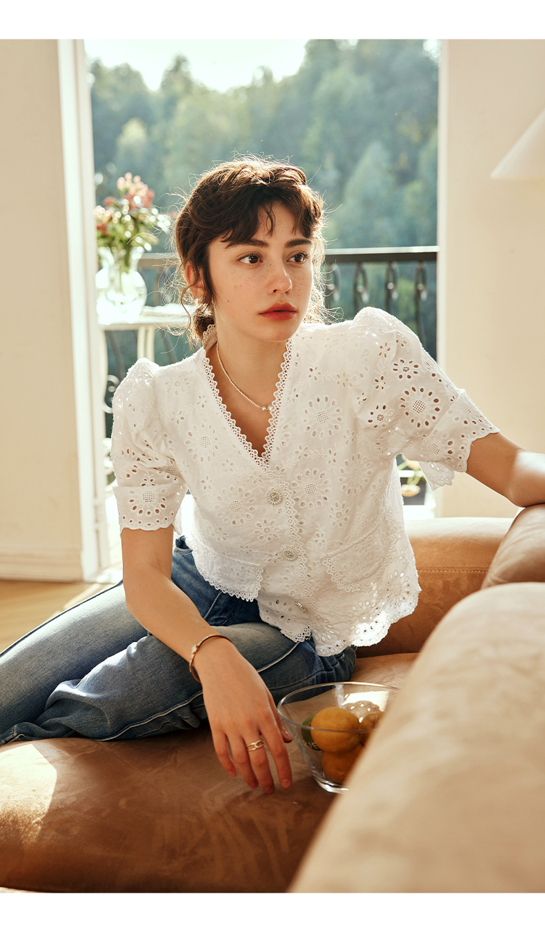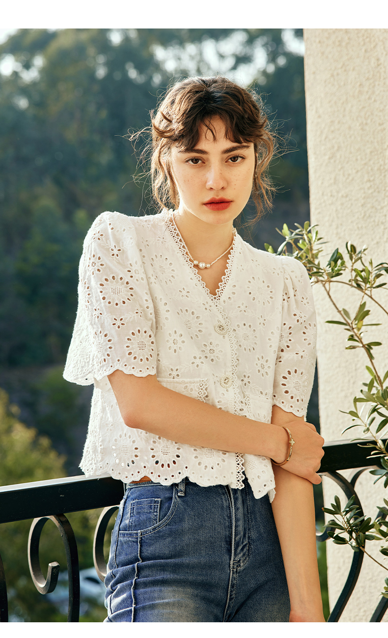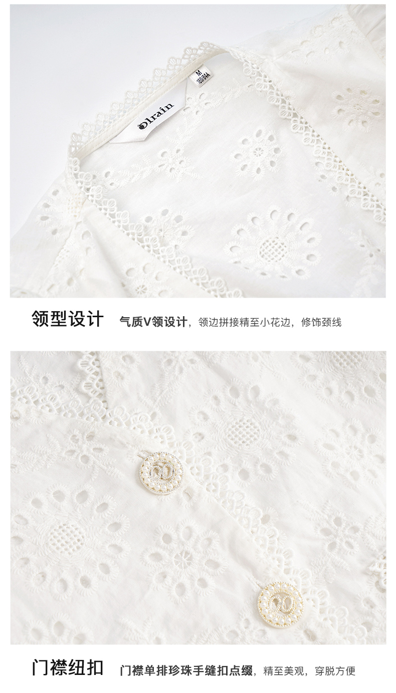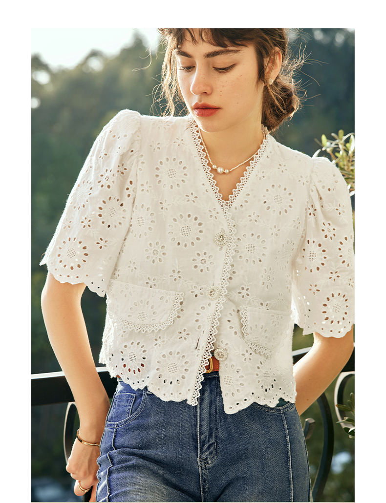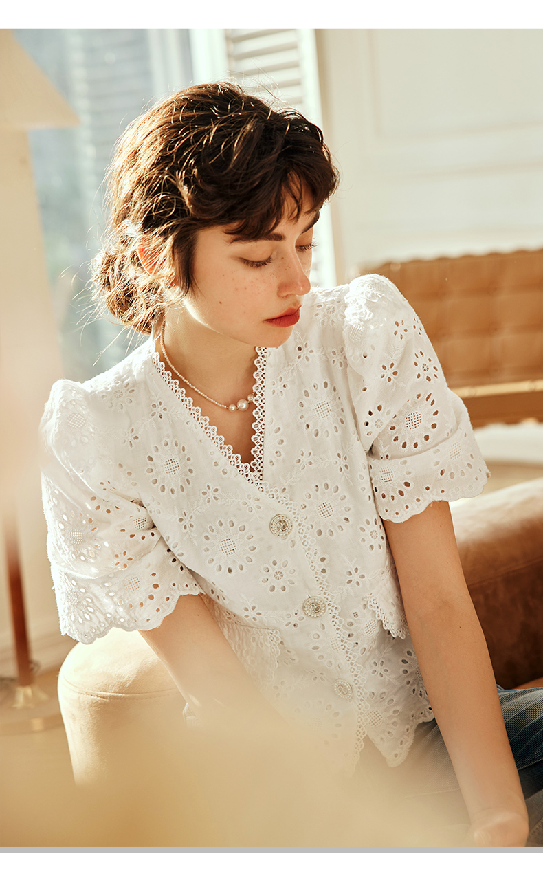 OLrain欧芮儿法式白色v领蕾丝雪纺衫女夏季2023新款镂空刺绣小衫