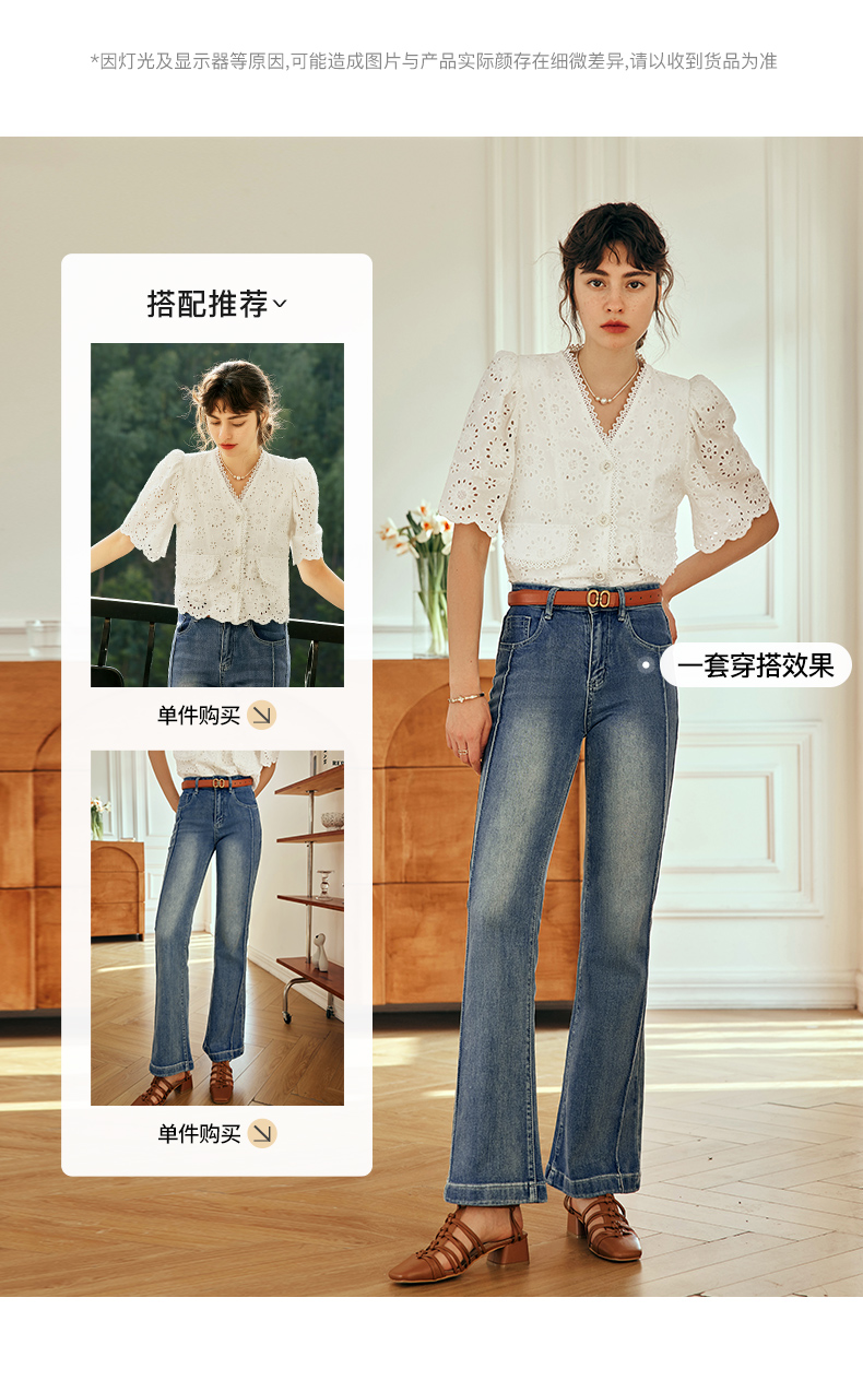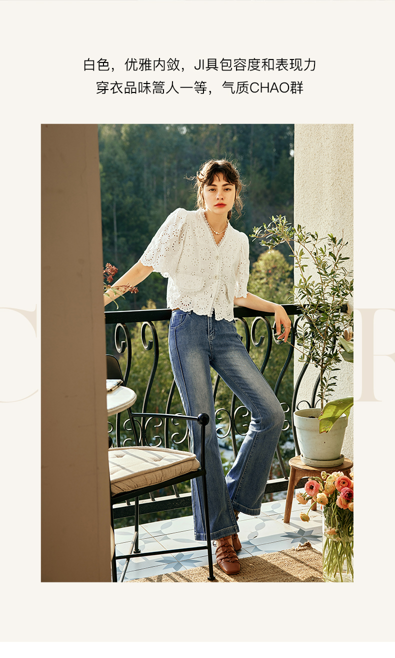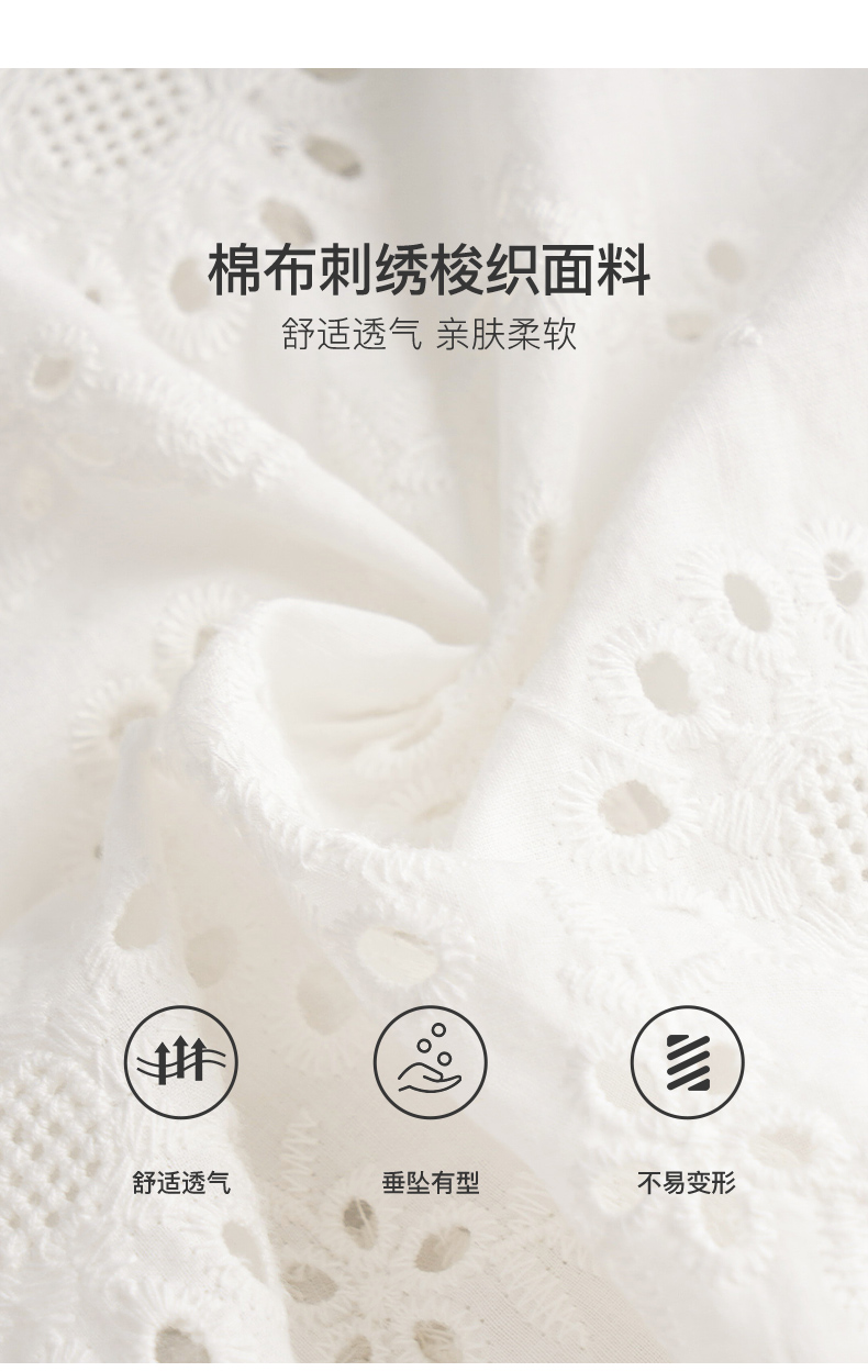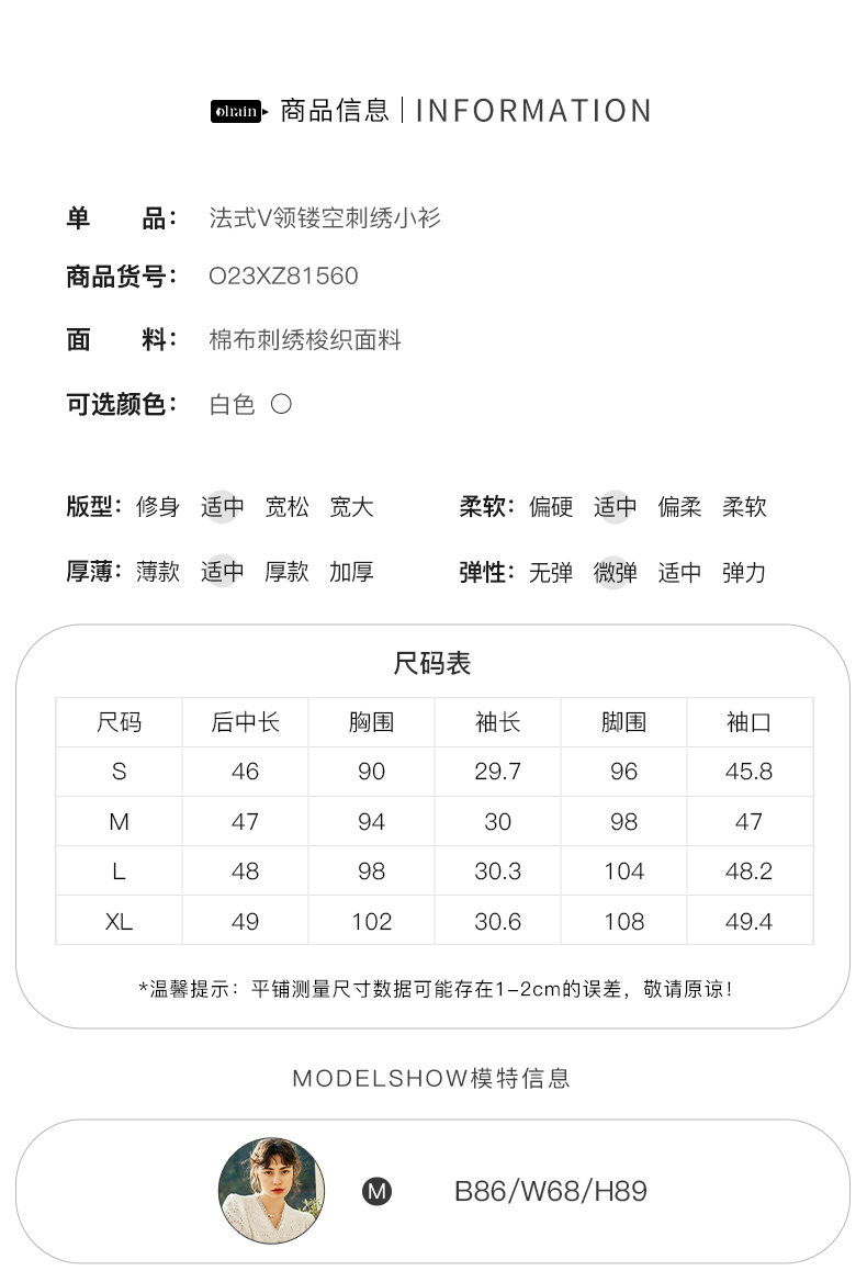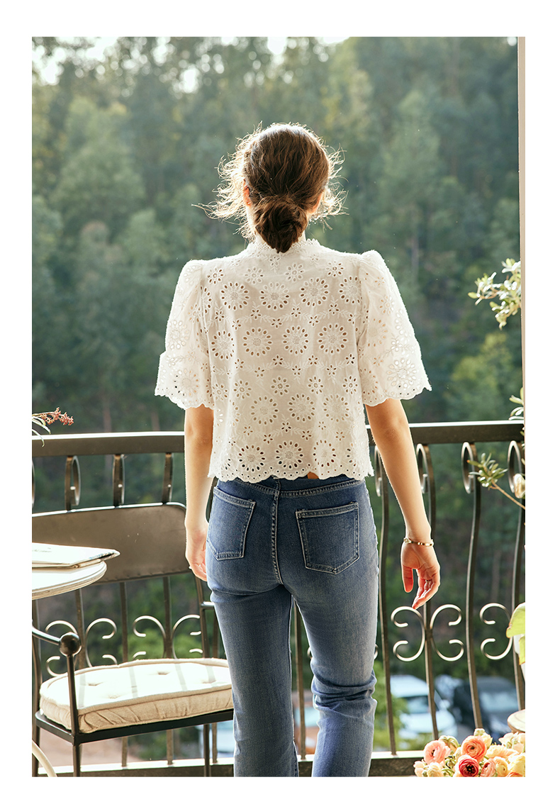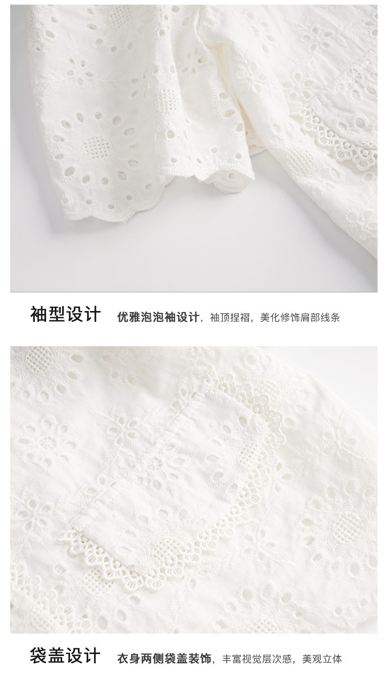 OLrain欧芮儿法式白色v领蕾丝雪纺衫女夏季2023新款镂空刺绣小衫
