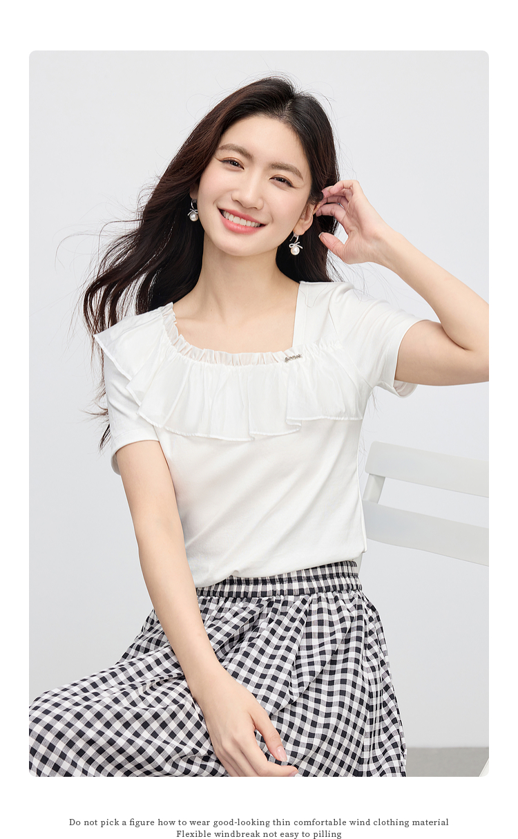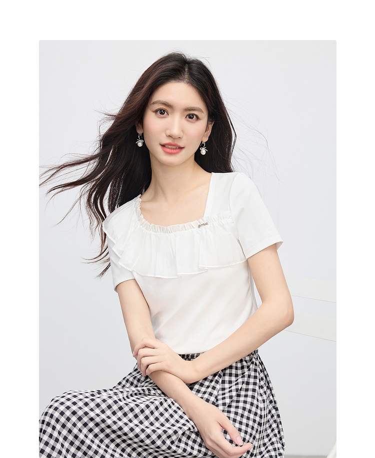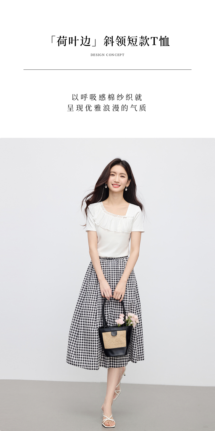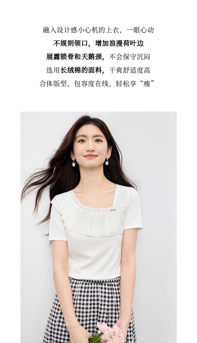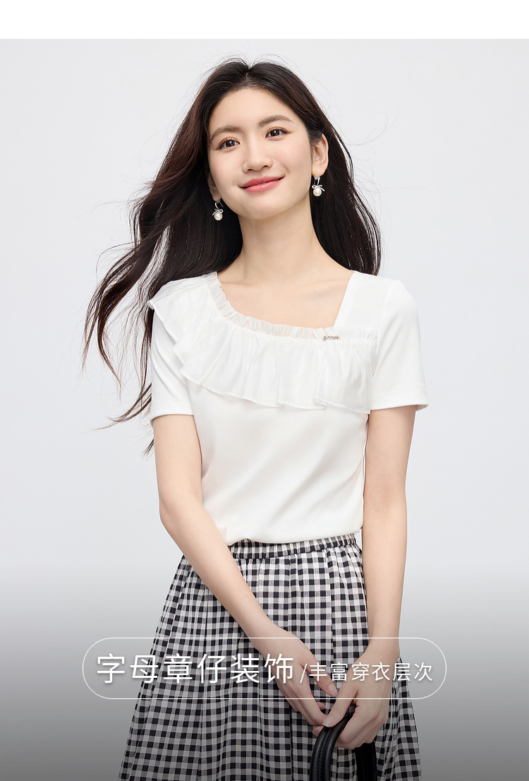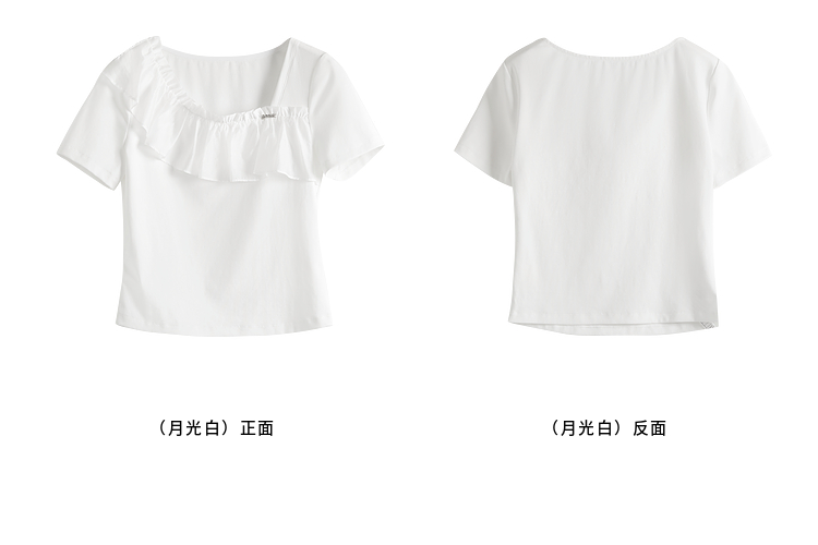 【07/30新品6.5折】熙世界荷叶边斜领白色t恤女短袖2025夏季新款时尚设计感正肩上衣