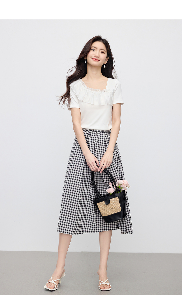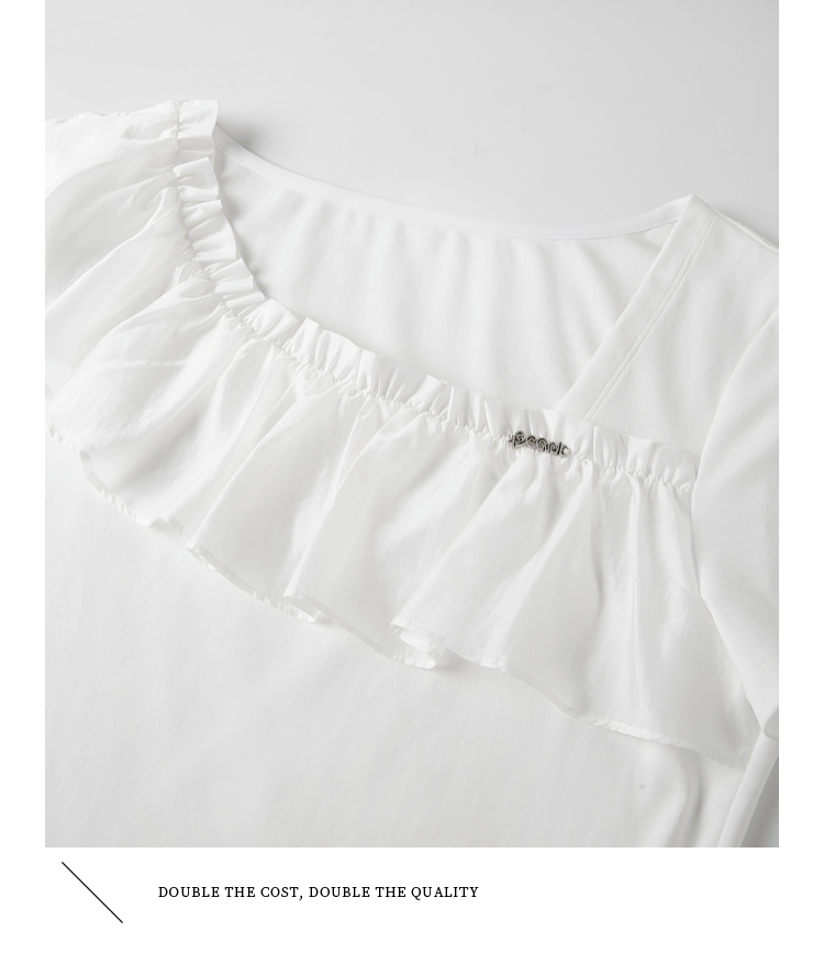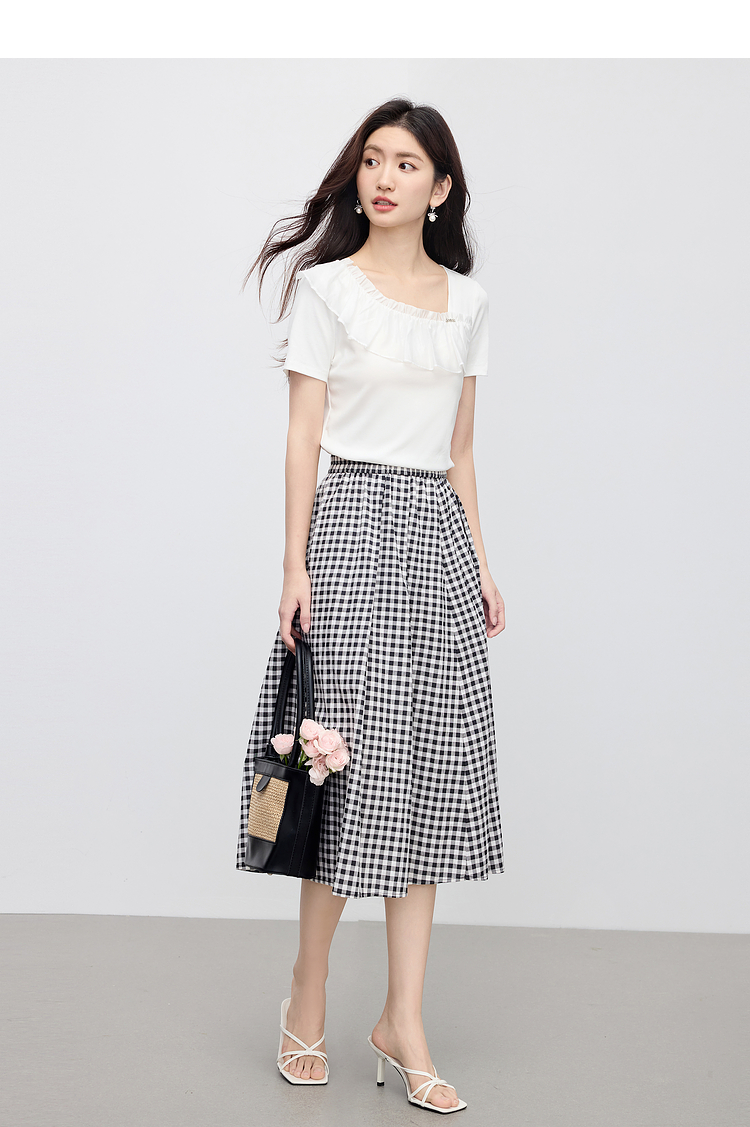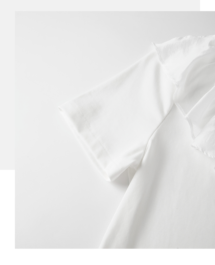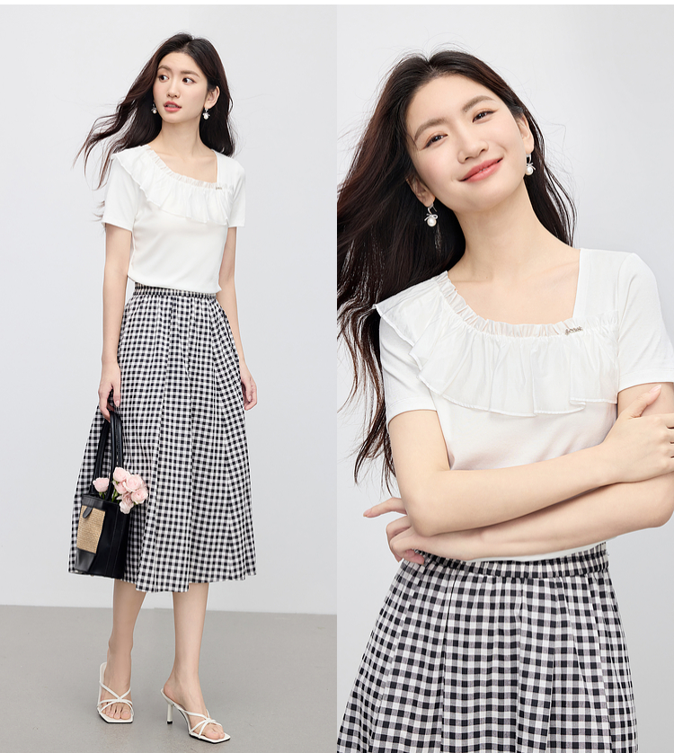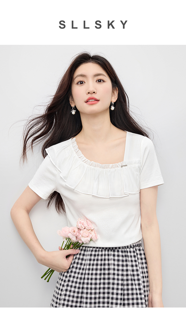 【07/30新品6.5折】熙世界荷叶边斜领白色t恤女短袖2025夏季新款时尚设计感正肩上衣