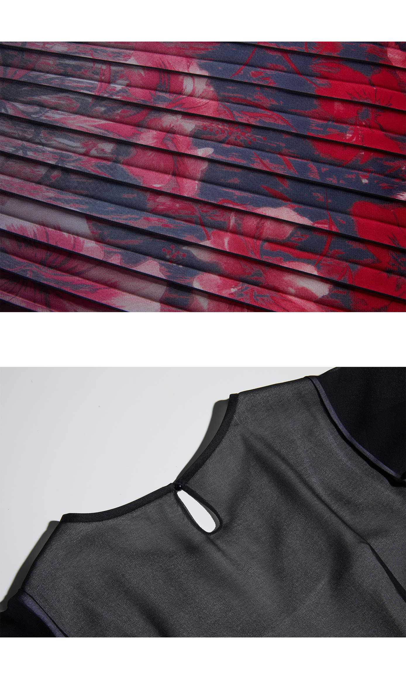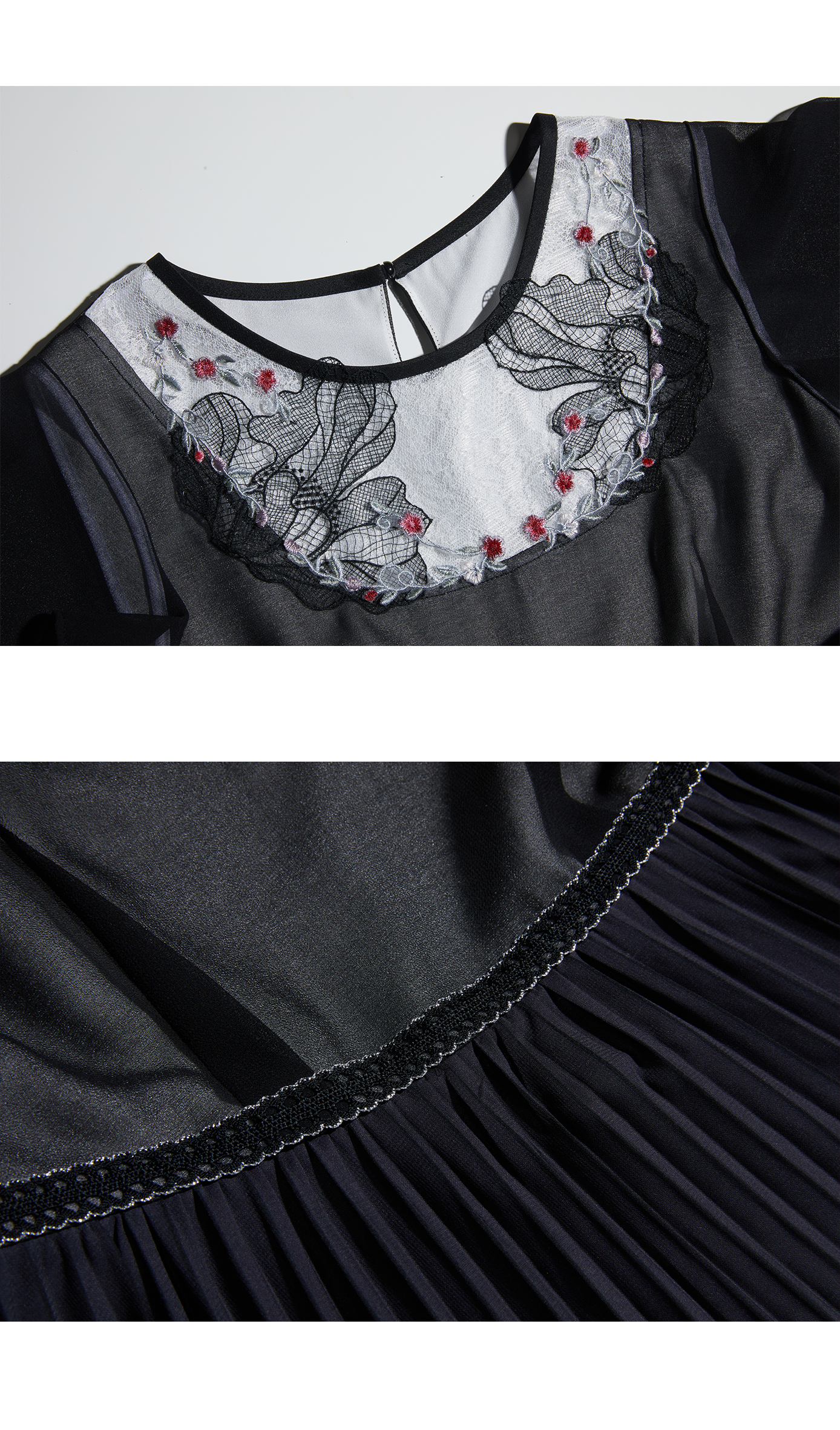司歌网纱印花长袖连衣裙圆领复古端庄A881316