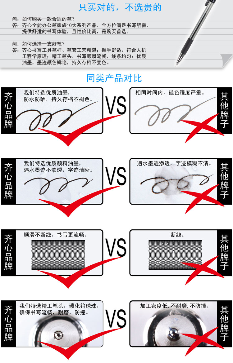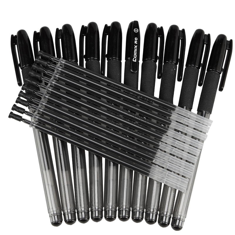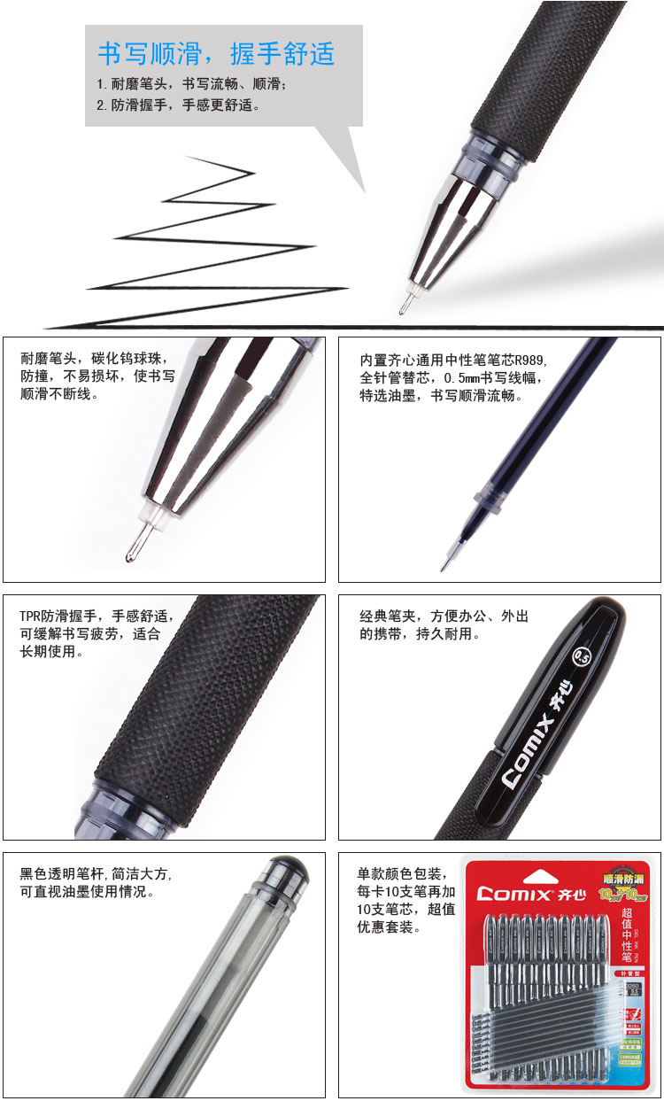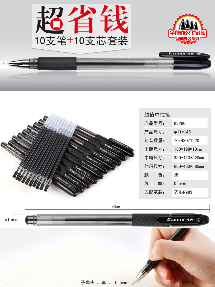 齐心0.5mm黑色中性笔K3260办公用品 签字笔10支笔加10支笔芯
