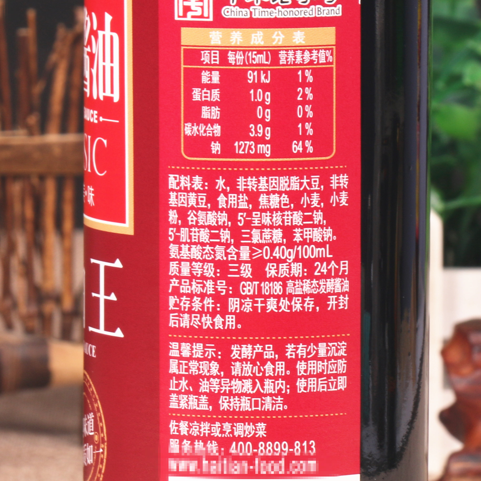 配料表:水、非转基因脱脂大豆、非转基因黄豆、食用盐、焦糖色、小麦、小麦粉、谷氨酸钠、5-呈味核苷酸二钠、5-肌酐酸二钠、三氯蔗糖、苯甲酸钠等。以产品实际包装信息为准。