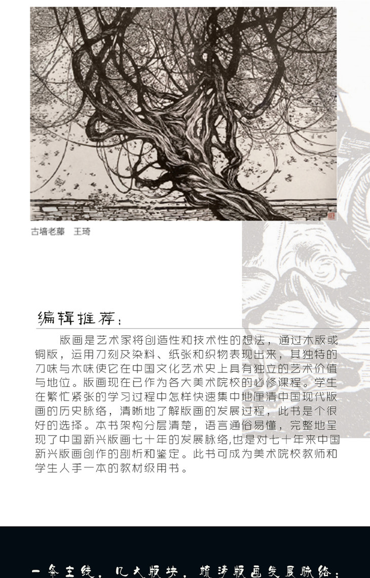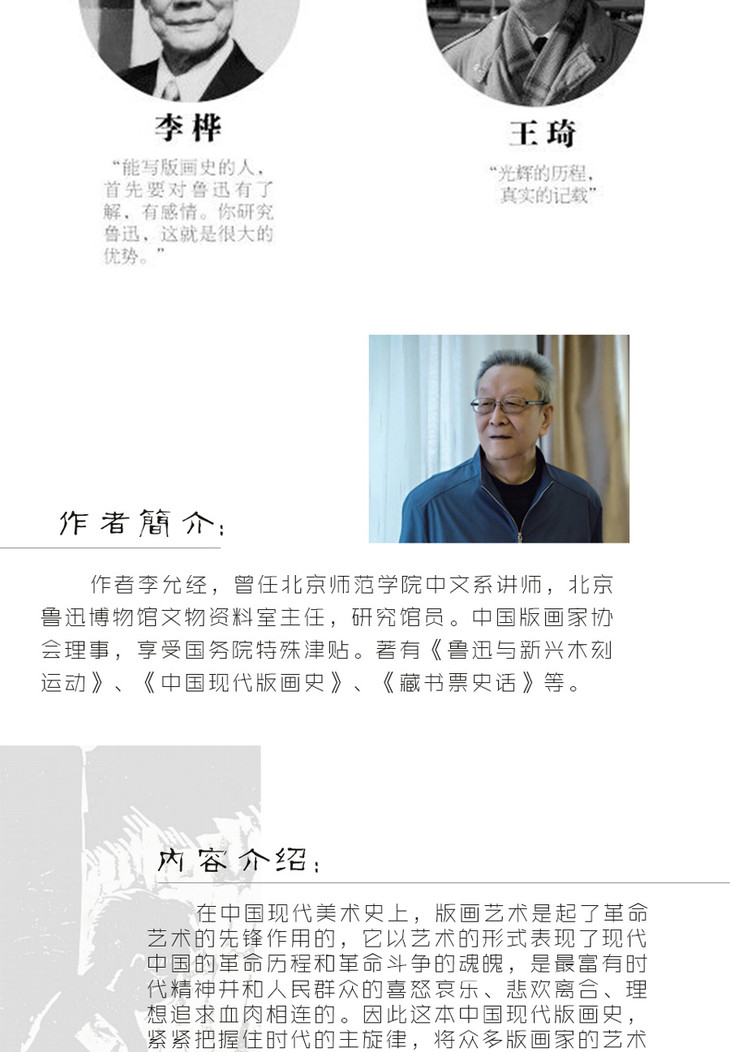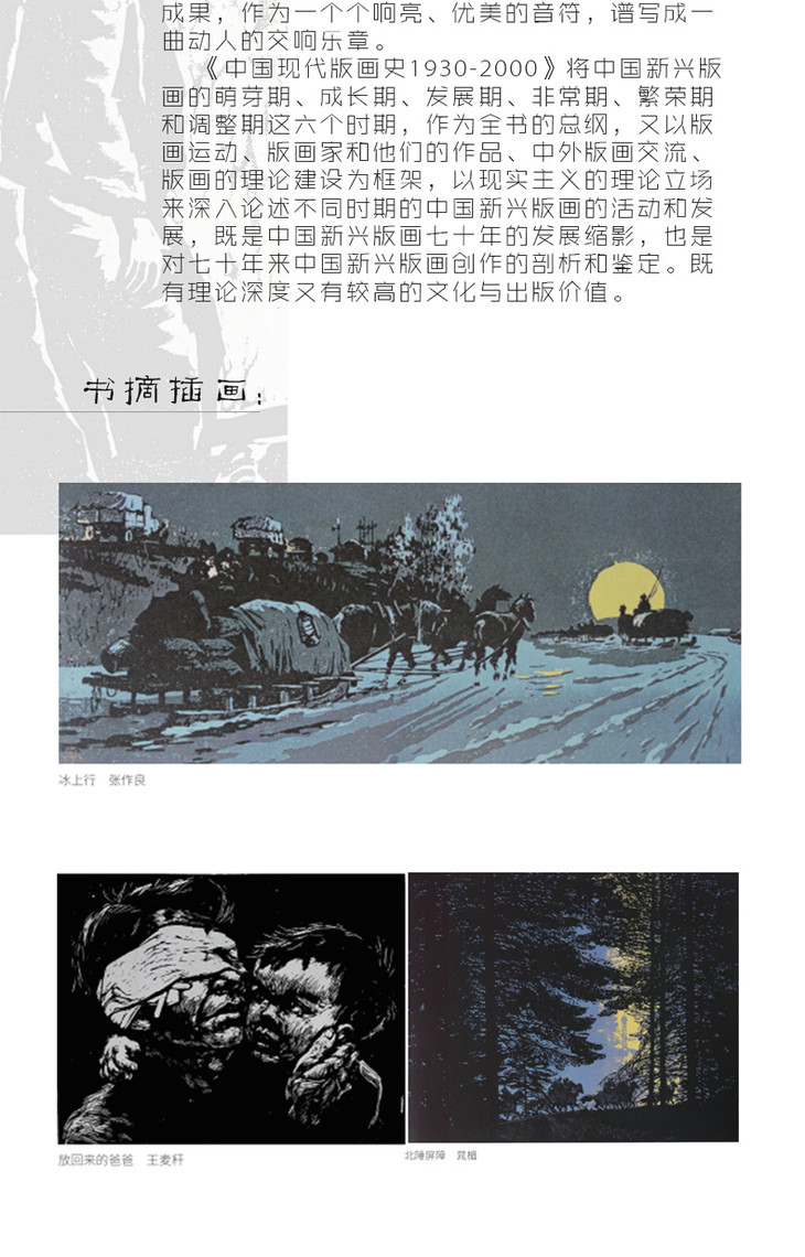 在中国现代美术史上,版画艺术是起了革命艺术的先锋作用的,它以艺术的形式表现了现代中国的革命历程和革命斗争的魂魄,是最富有时代精神并和人民群众的喜怒哀乐、悲欢离合、理想追求血肉相连的。因此这本中国现代版画史,紧紧把握住时代的主旋律,将众多版画家的艺术成果,作为一个个响亮、优美的音符,谱写成一曲动人的交响乐章。
