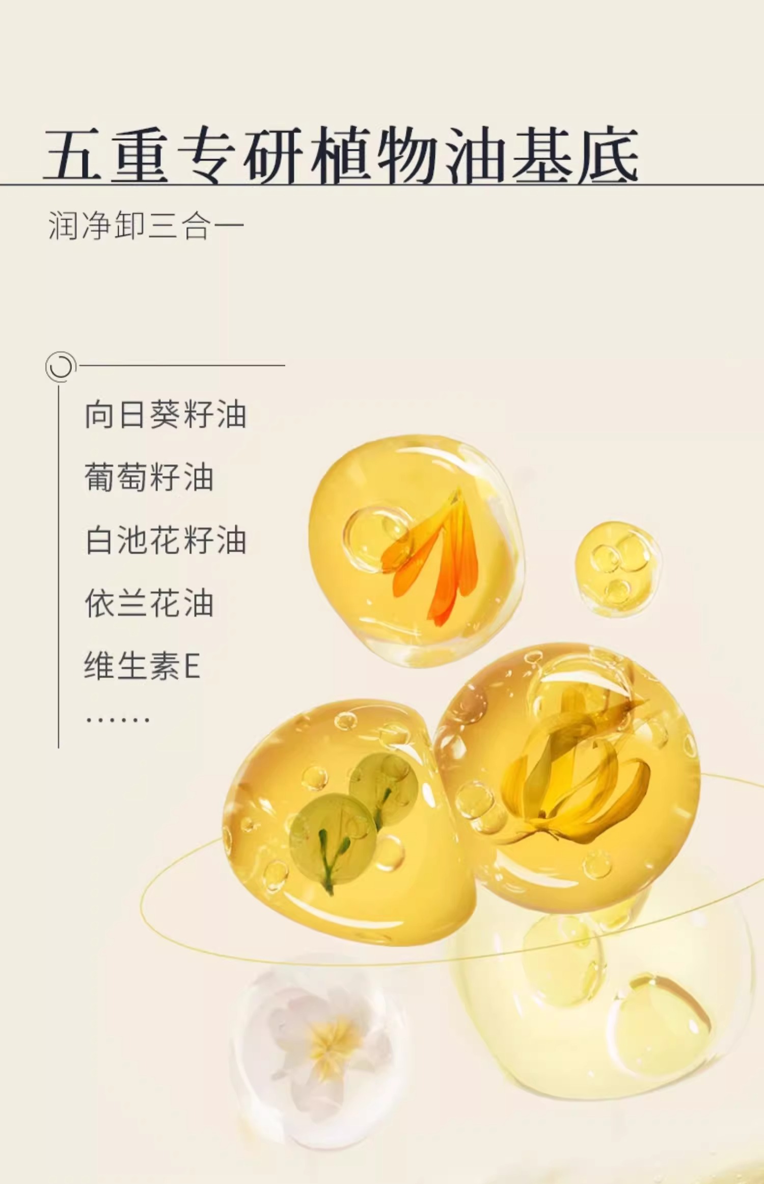 天然植物油为基底,弱酸配方,以油溶油,温和养护皮脂膜