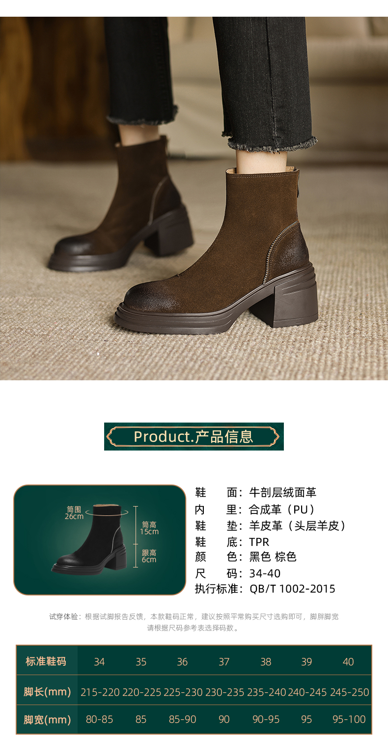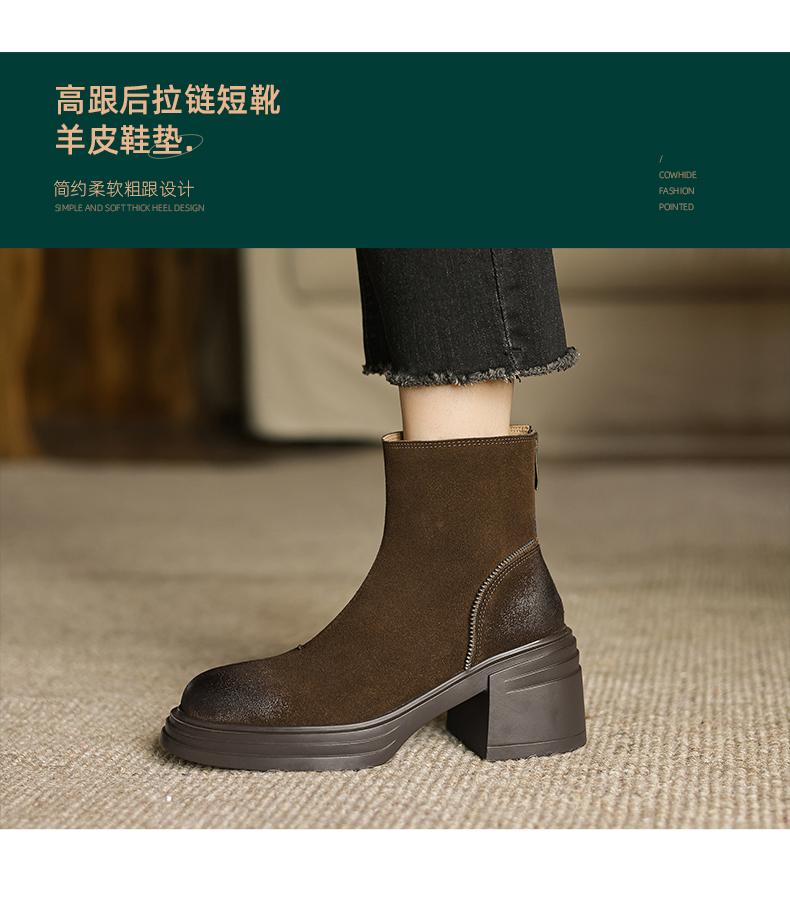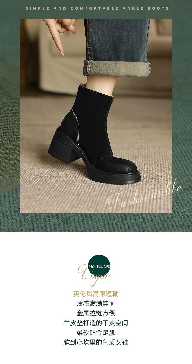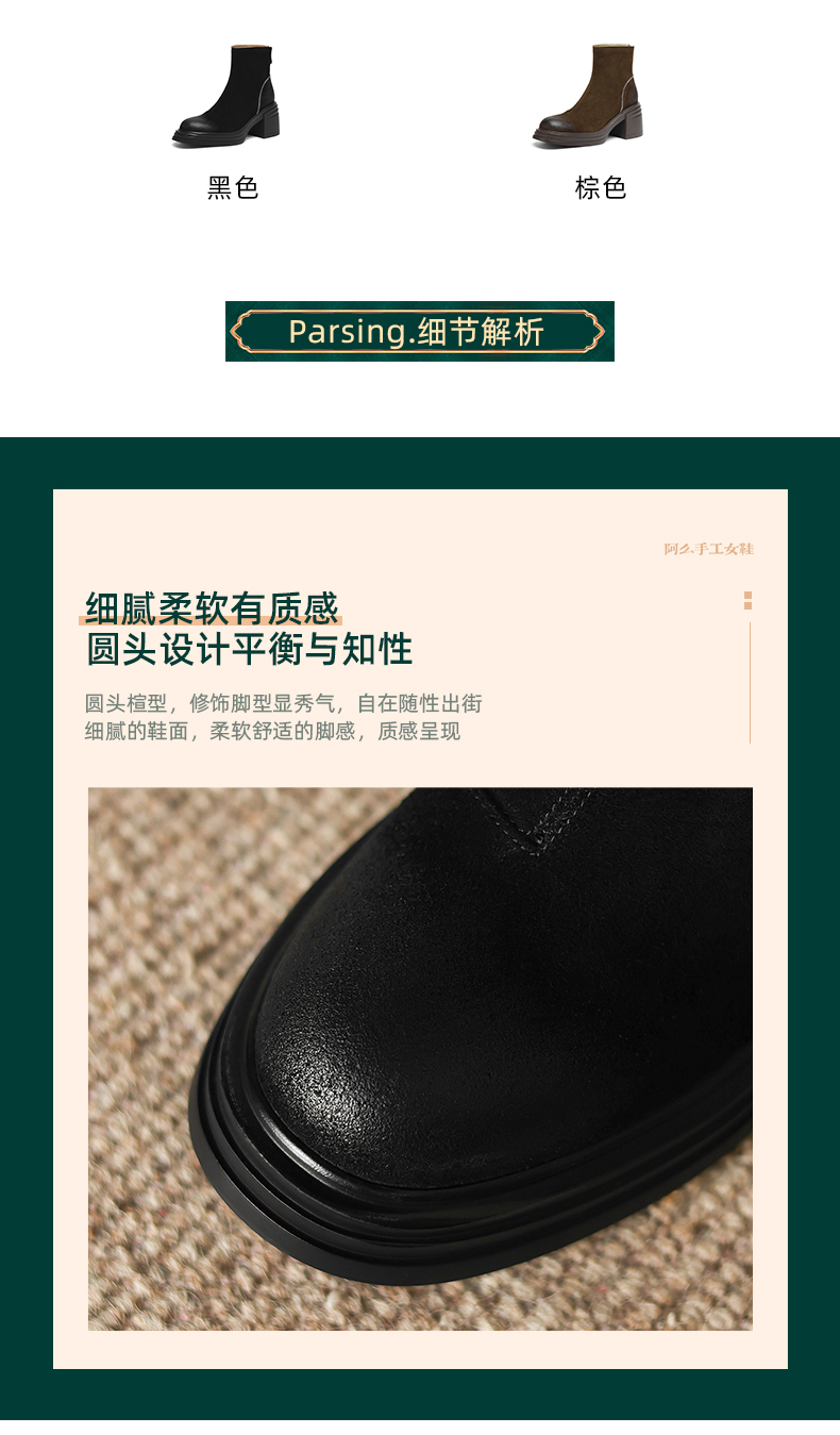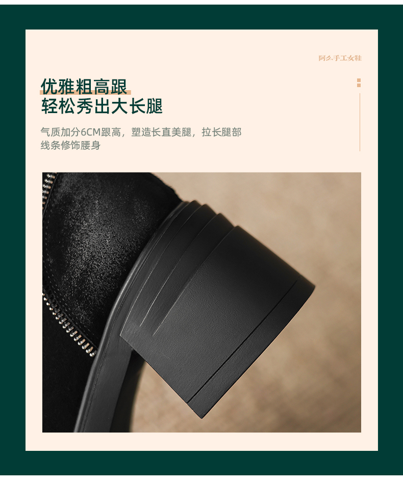 阿么手工女鞋高跟绒面小个子增高短靴女秋冬6CM后拉链百搭瘦瘦靴