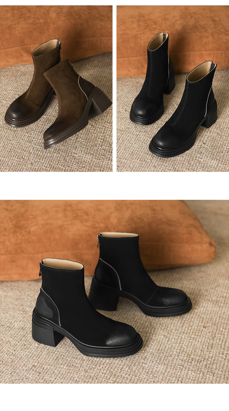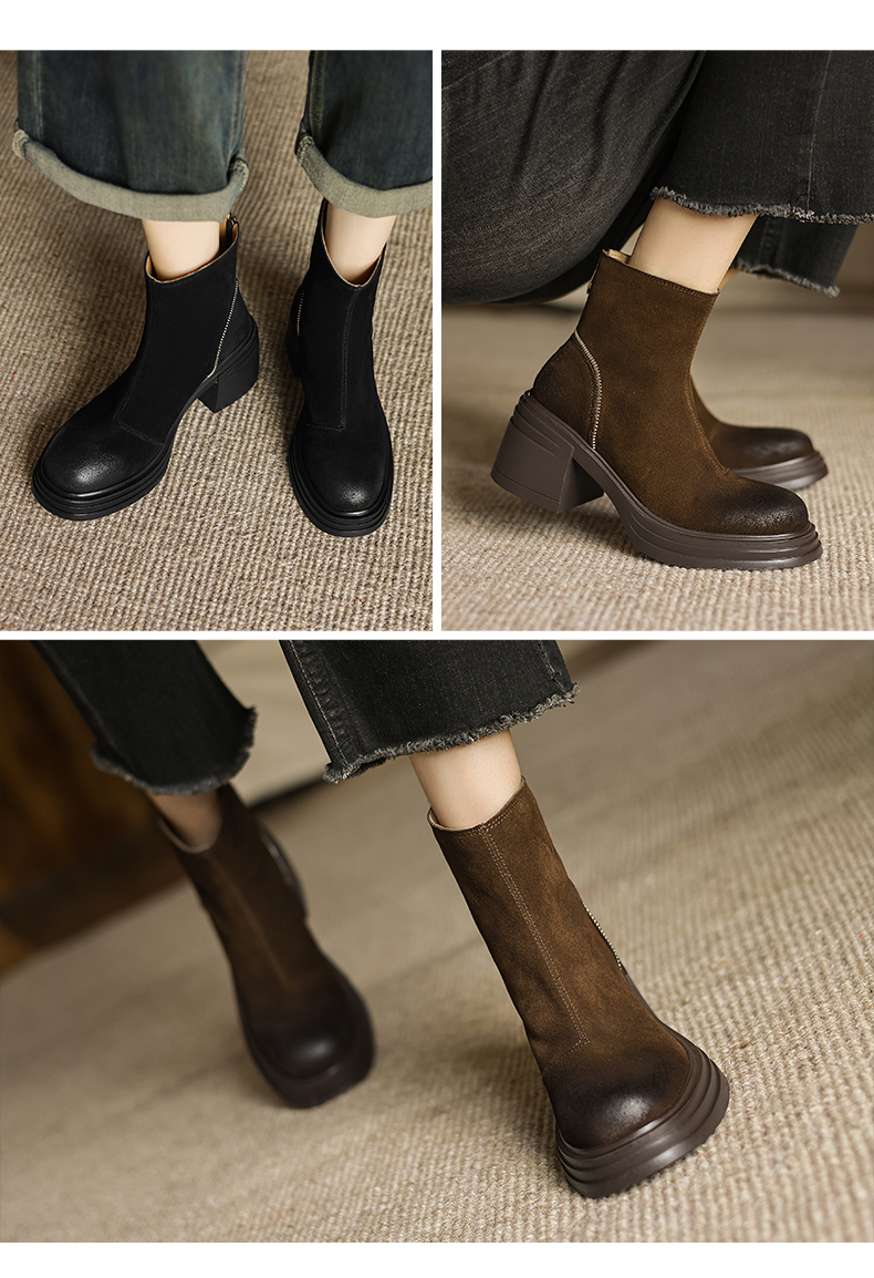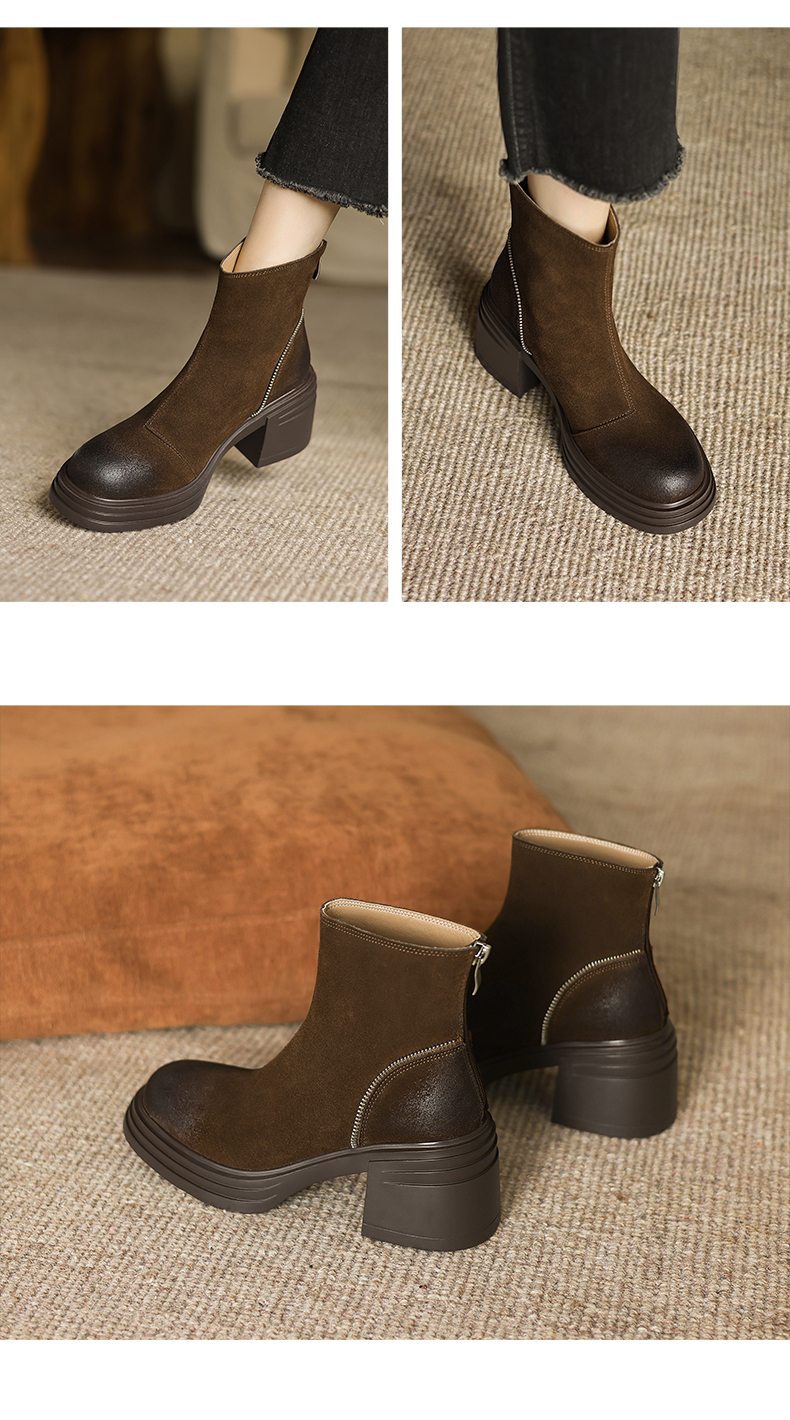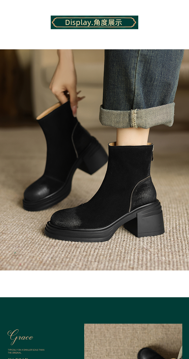 阿么手工女鞋高跟绒面小个子增高短靴女秋冬6CM后拉链百搭瘦瘦靴