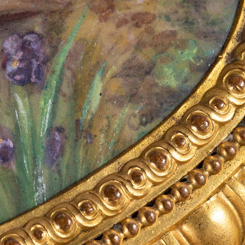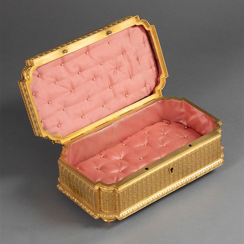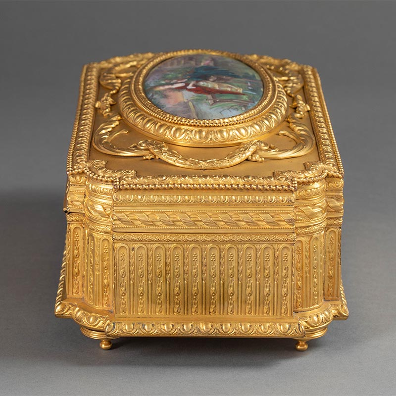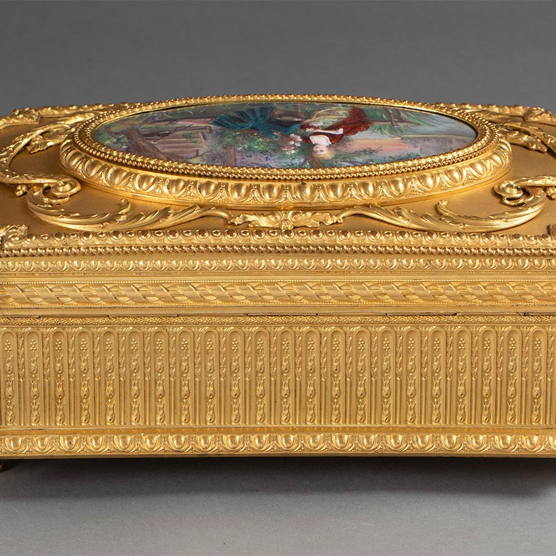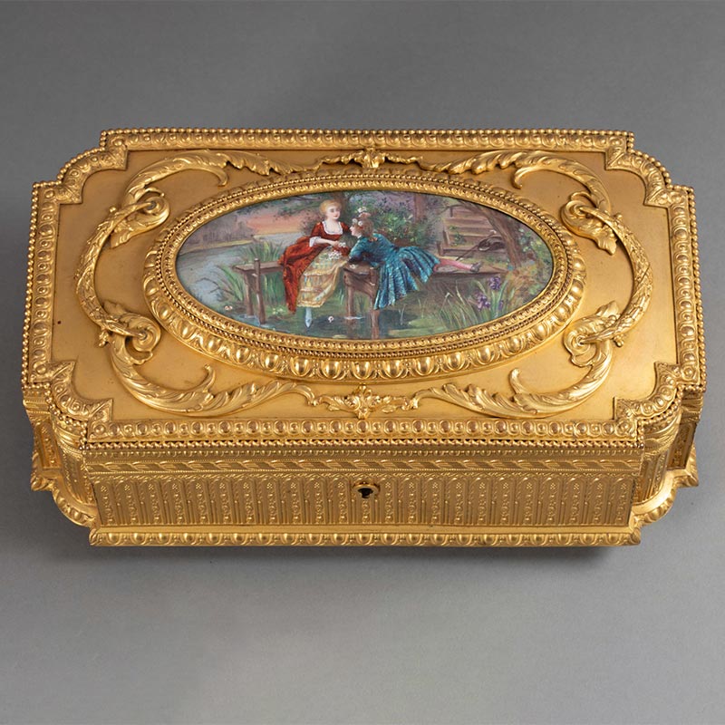19世纪末法国出品卷叶纹铜鎏金精雕镶嵌田园恋歌主题手绘细密画珍宝盒
