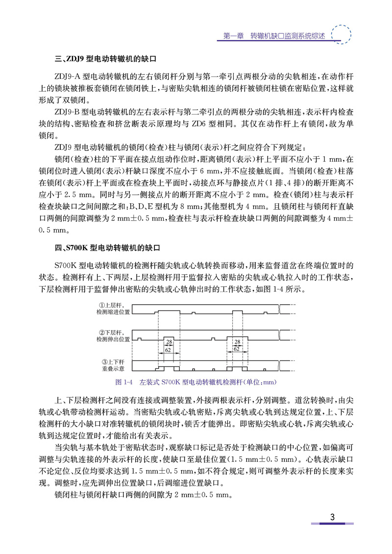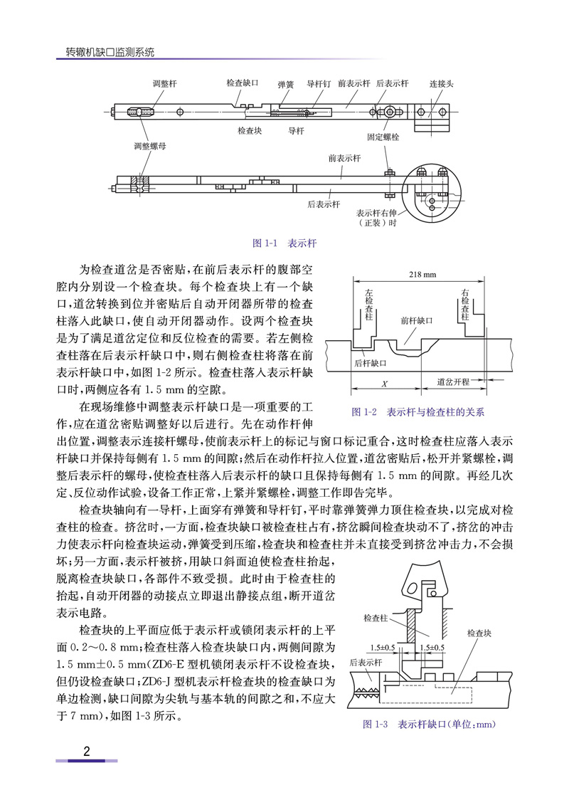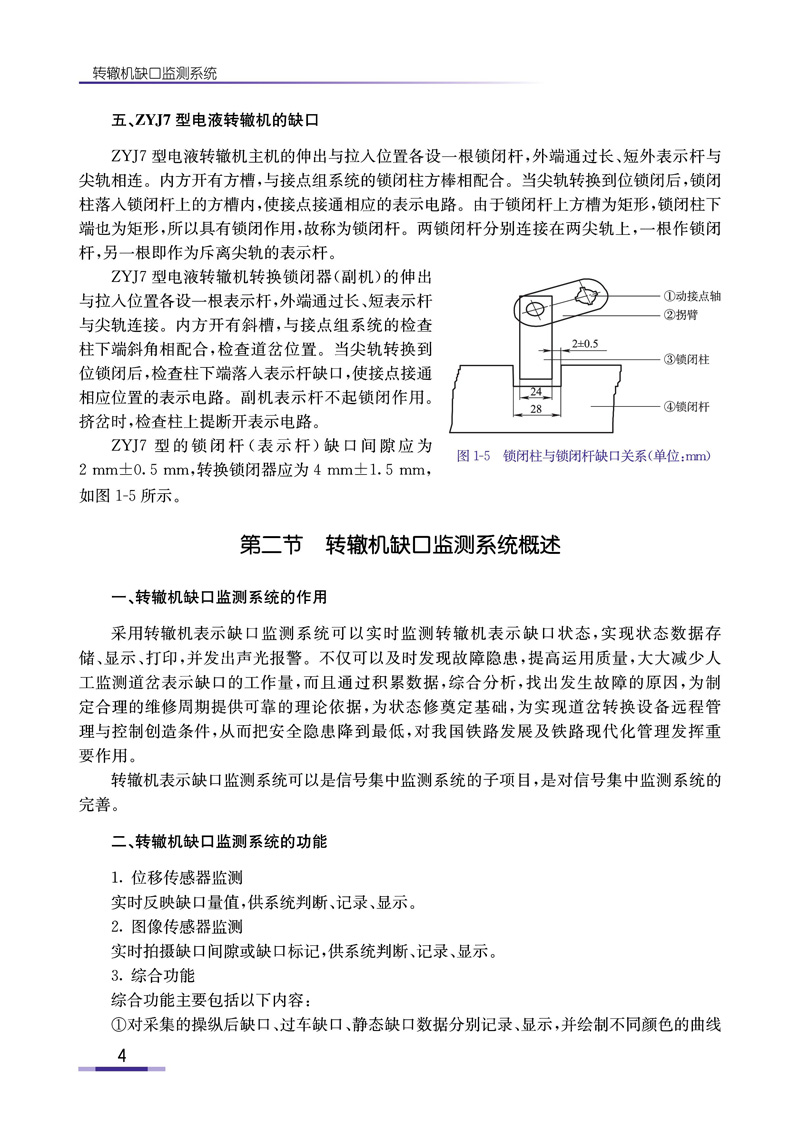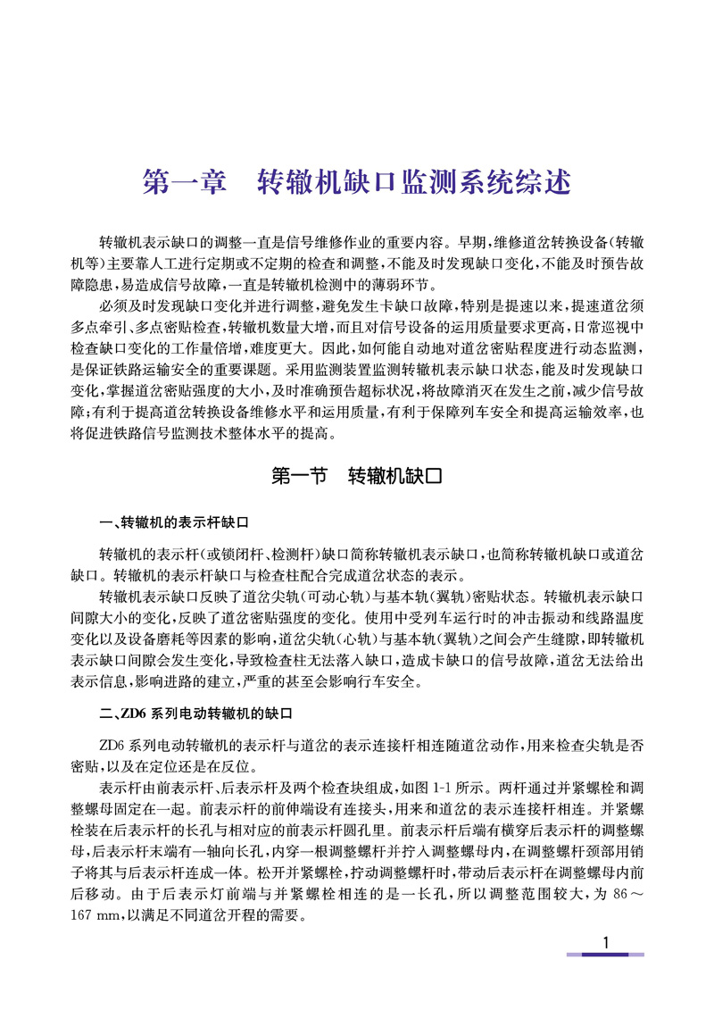 本书介绍道岔缺口、道岔缺口监测缺口监测系统的基本情况、与转辙机缺口监测系统接口,各种道岔缺口监测系统的结构和使用方法。本书分六章,第一章转辙机缺口监测系统综述,介绍转辙机缺口、转辙机缺口监测系统概述、与信号集中监测系统接口,第二章~第六章分别介绍ZQJ‐05型道岔缺口监测系统、ZXV-H型道岔缺口视频监测系统、TCKh-I 型道岔综合监测系统、JHD型道岔缺口监测报警系统、道岔健康监测管理系统的结构和使用方法。由于篇幅所限,其他道岔缺口监测报警系统未予以介绍。