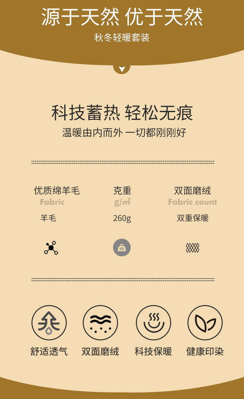 秋冬新款男女保暖内衣套装,甄选优质绵羊毛,双面磨绒工艺打造轻盈贴身保暖体验。高弹面料修身显瘦,细腻柔软不扎肤,有效锁住温度,从内而外温暖呵护