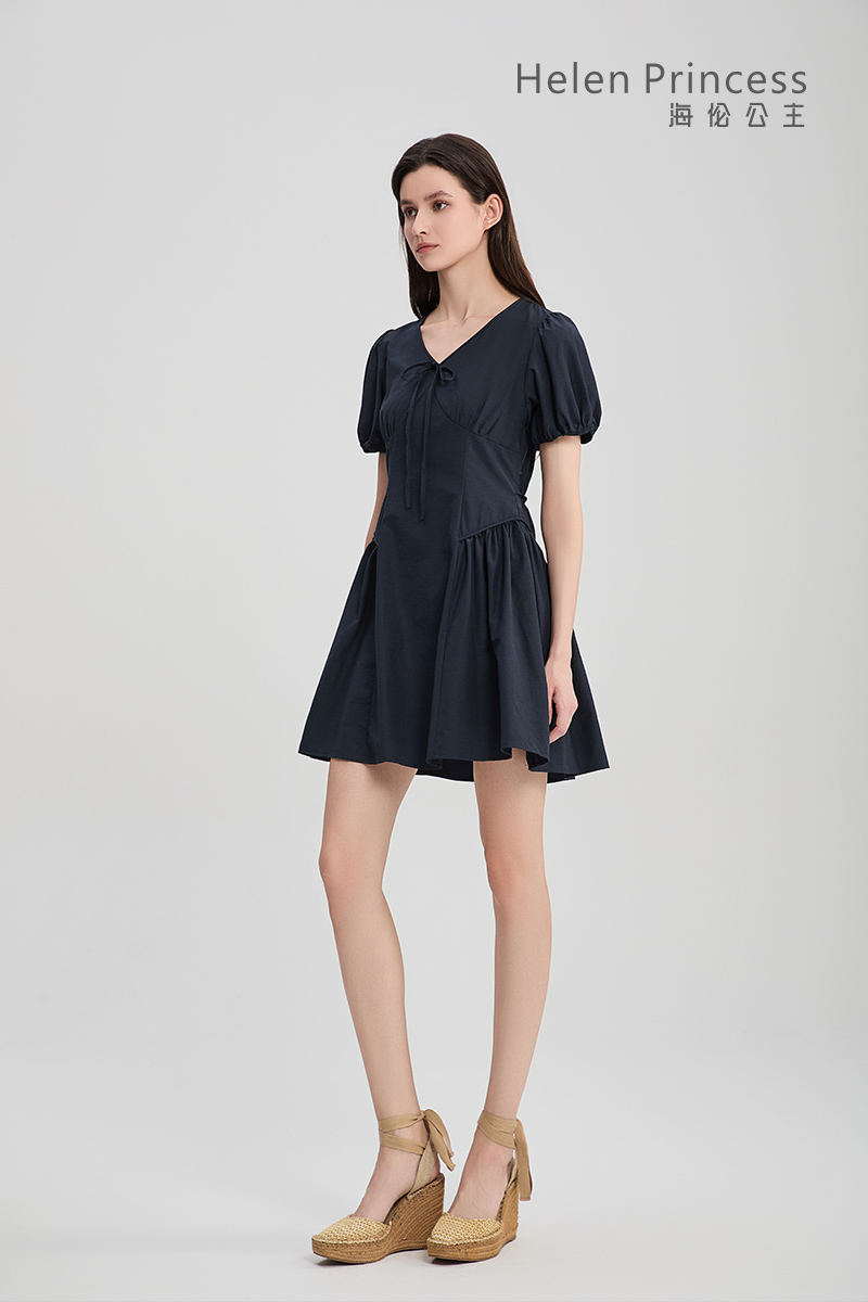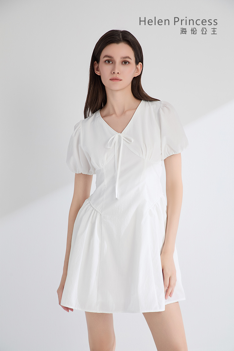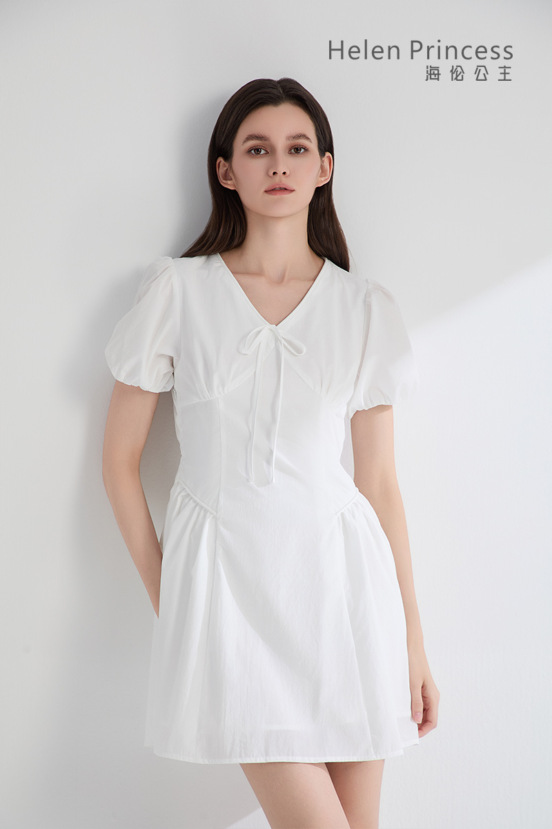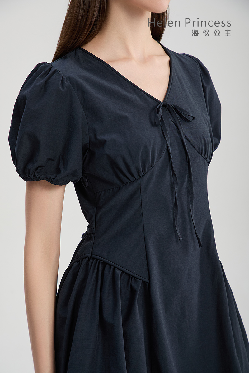 V领蝴蝶结泡泡袖连衣裙-------05532927